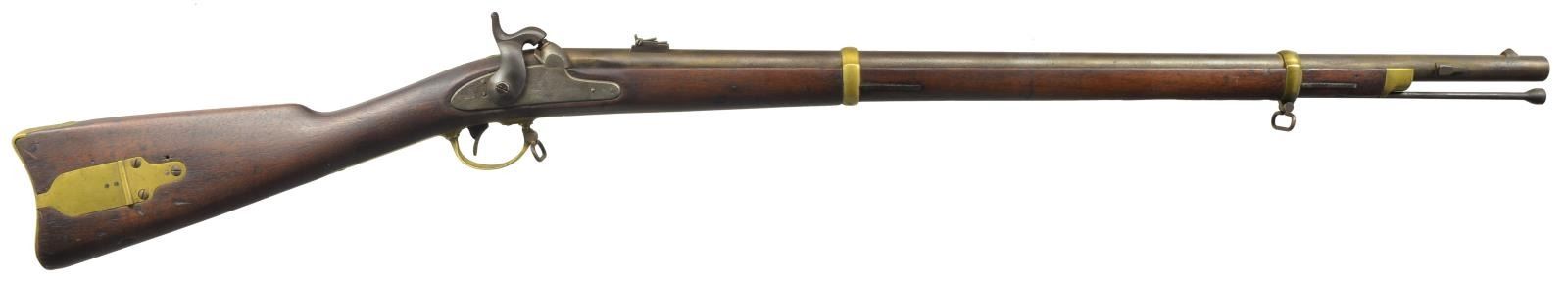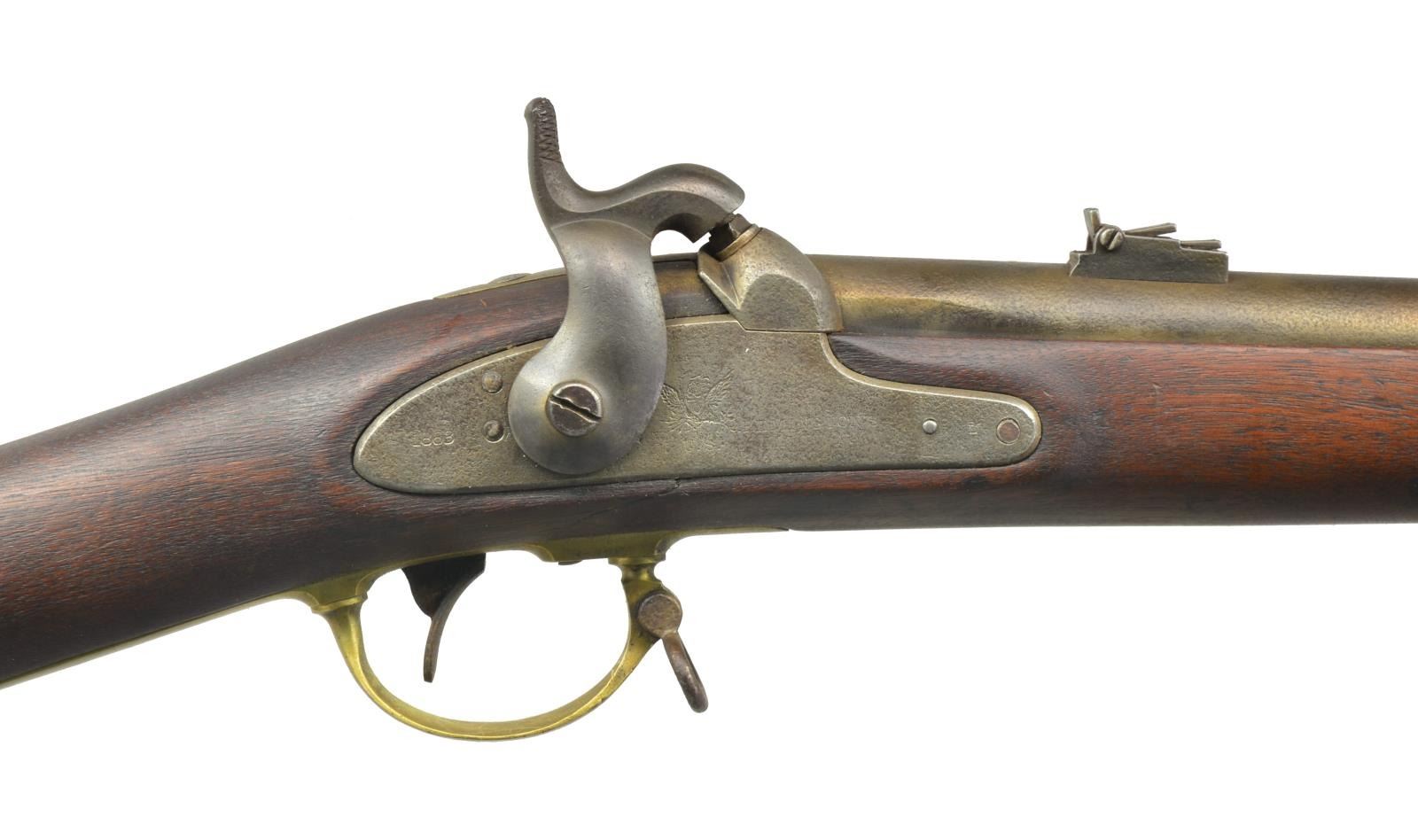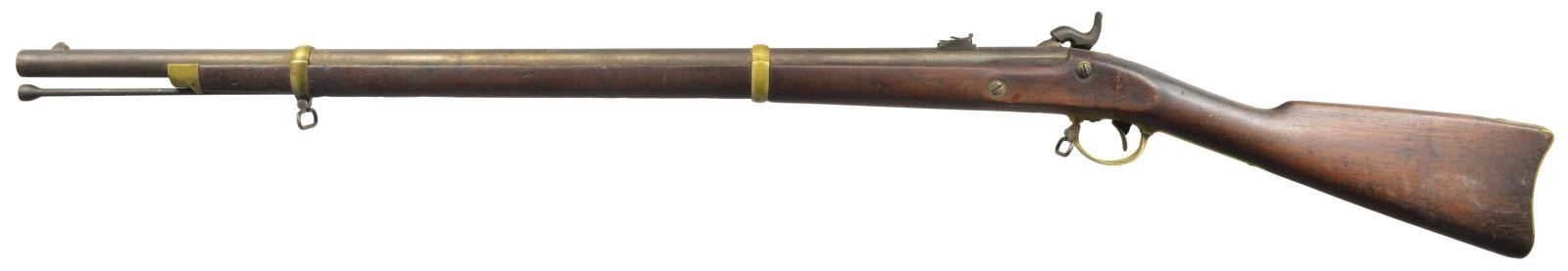 RIFLE. Cal. 58. NSN. Bbl. 33" w/ 7 groove rifling. Blade front sight w/ 2 leaf rear sight. Bbl. & lock are dated 1863. Lock has American Eagle over "US" followed by "REMINGTON'S / ILION N.Y.". 2 Band fastened walnut stock. Brass fittings include patch box, buttplate, triggerguard, side plate escutcheons, bbl. bands & nose cap. Left ear of stock has 1 partially visible cartouche. Left side of stock has hand scratched initials "KW". Tulip tipped ramrod. The 1863 Remington is considered to be one of the best made military arms of the Civil War era. CONDITION: bbl. & lock show evidence of cleaning w/ general light pitting & reacquiring a dark tarnish. Cleaned brass is reacquiring a tarnish. Heavily sanded & refinished stock shows dents & handling marks w/ crack between lock & trigger guard. Pitted bore w/ partially intact rifling. (01-18334/DS). ANTIQUE. $800-1,200.