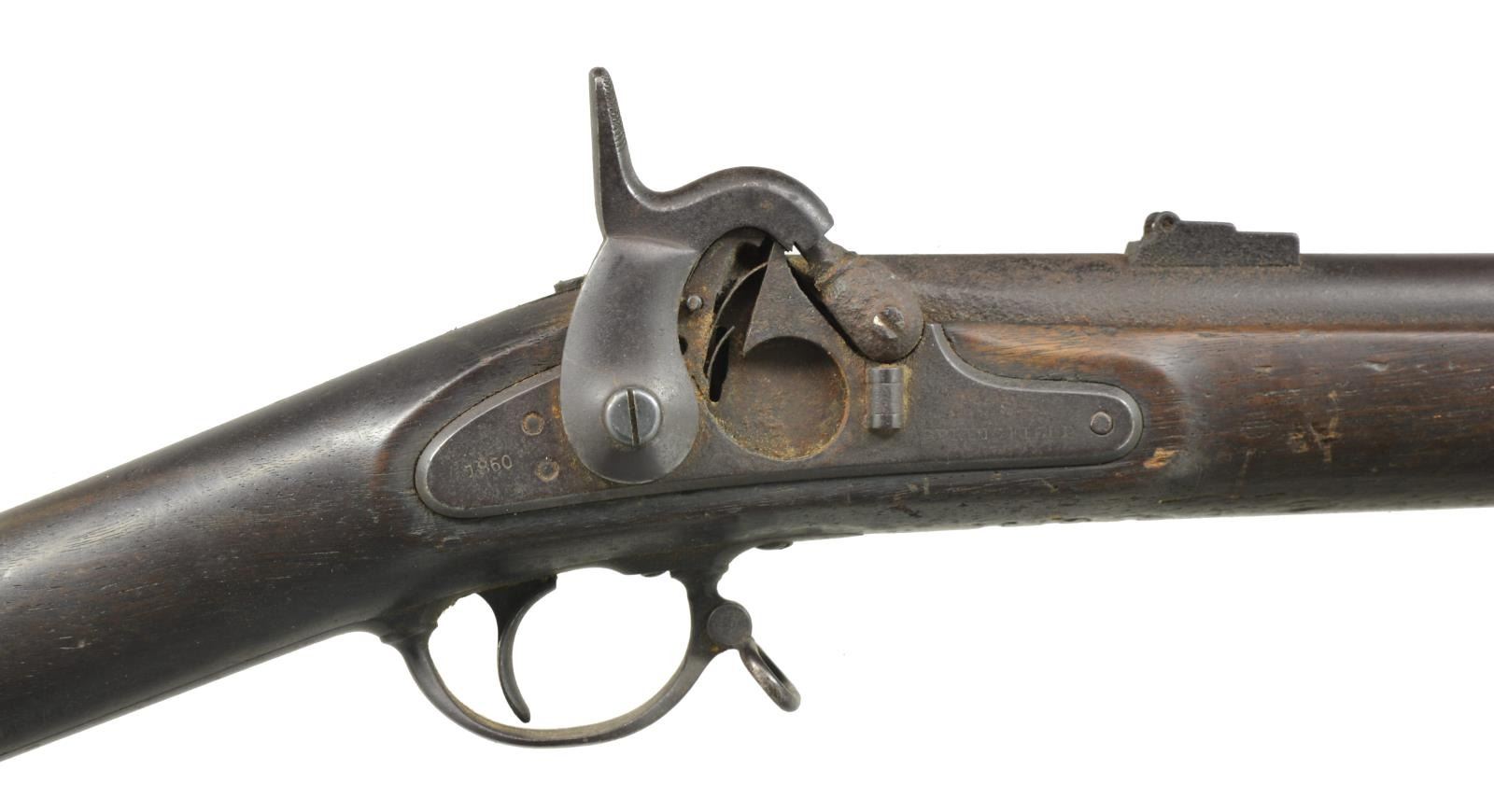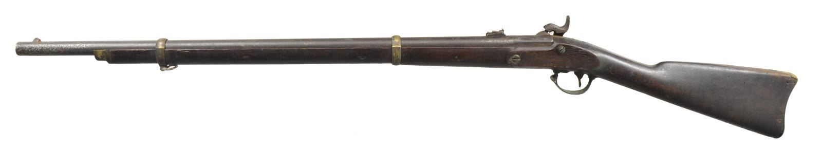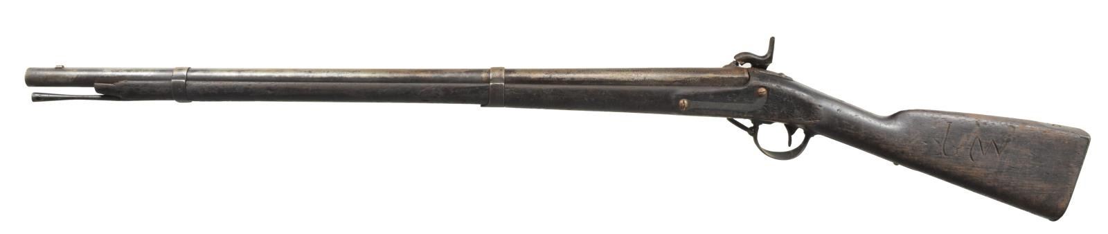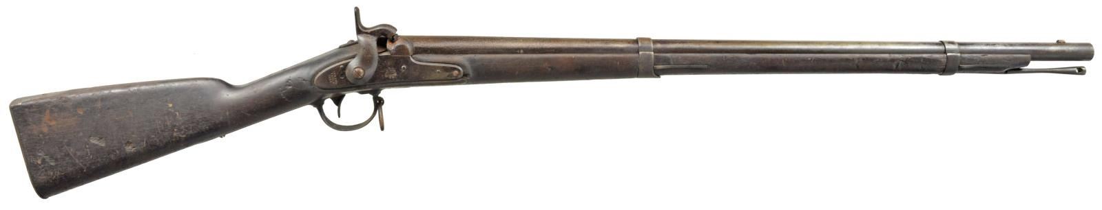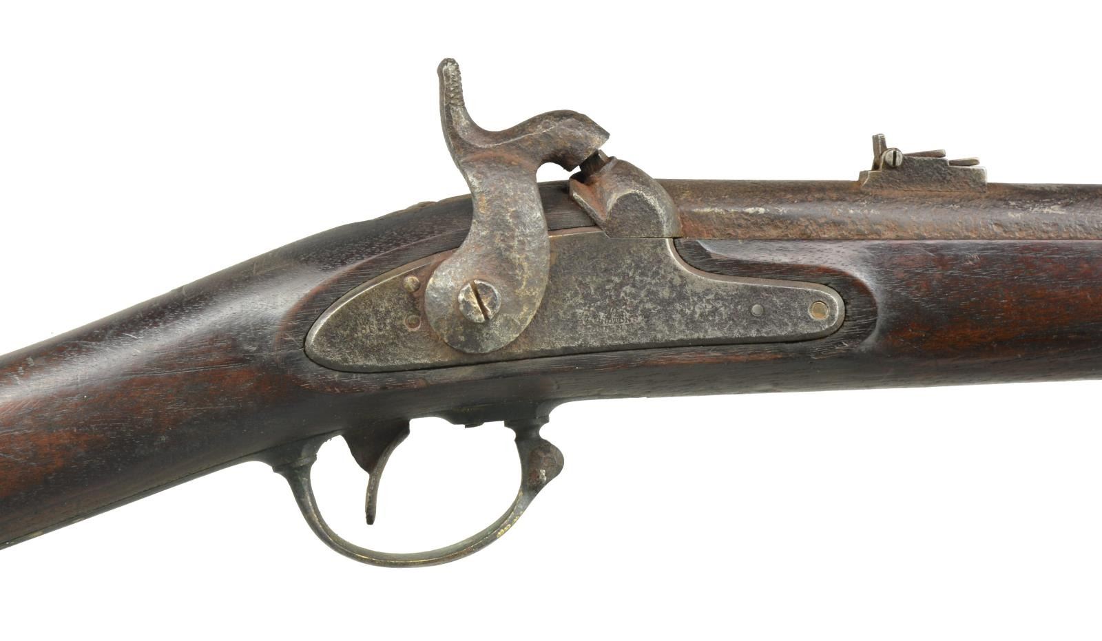 MUSKETS. ALL: NSN. 1) REMINGTON 1863 "ZOUAVE" RIFLE. Cal. 58. Bbl.33" w/ blade front sight & 2 leaf rear sight. 1863 Date lock. 2 Band walnut stock w/ brass fittings. CONDITION: metal has dark brown appearance w/ general pitting that becomes very heavy in breech & lock areas. Brass parts show a mottled brown patina. Stock has age darkened weathered appearance w/ dents & handling marks having sm. cracks & chips in lock & sideplate areas. Ramrod is not present. Dark heavily pitted bore. (01-18215/DS). 2) SPRINGFIELD 1842 MUSKET. Cal. 69. Bbl. shortened to 31 1/2" w/ lump front sight. Lock has 1849 date. Walnut stock is shortened to 2 band configuration & has iron trim. Left side of butt has hand carved initials "JW" followed by stamped "83". CONDITION: metal has mottled gray brown patina showing pitting that becomes very heavy in breech area. Wood has dark oil soaked weathered appearance w/ dents & handling marks having wood erosion above lock w/ numerous cracks & chips. Dark pitted bore. (01-18247/DS). 3) SPRINGFIELD 1855 RIFLE-MUSKET. Cal. 58. Bbl. shortened to 31" w/ brass blade front sight & base only for rear sight. 1860 Dated lock w/ Maynard primer feed, cover is missing. Walnut stock w/ iron fittings shortened to 2 band configuration. Bottom of stock forward of trigger guard is marked w/ initials "JRD". CONDITION: metal has dark appearance w/ rust becoming heavy in breech area. Stock has aged darkened appearance showing dents & marks w/ wood erosion above lock & showing sm. cracks & chips. Ramrod is not present. Dark pitted bore. (01-18264/DS). ALL ANTIQUE. $750-1,250.
