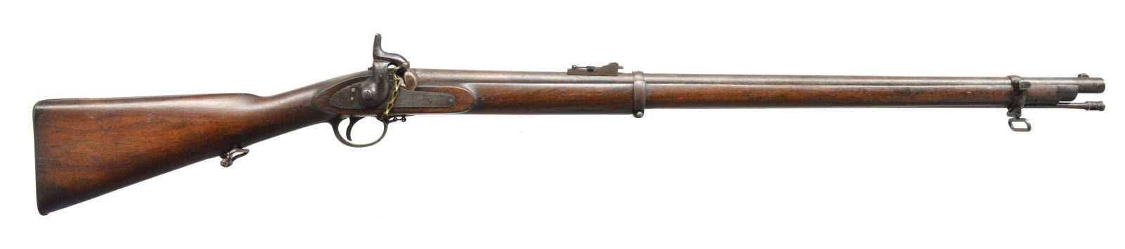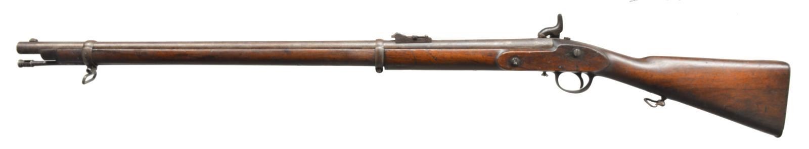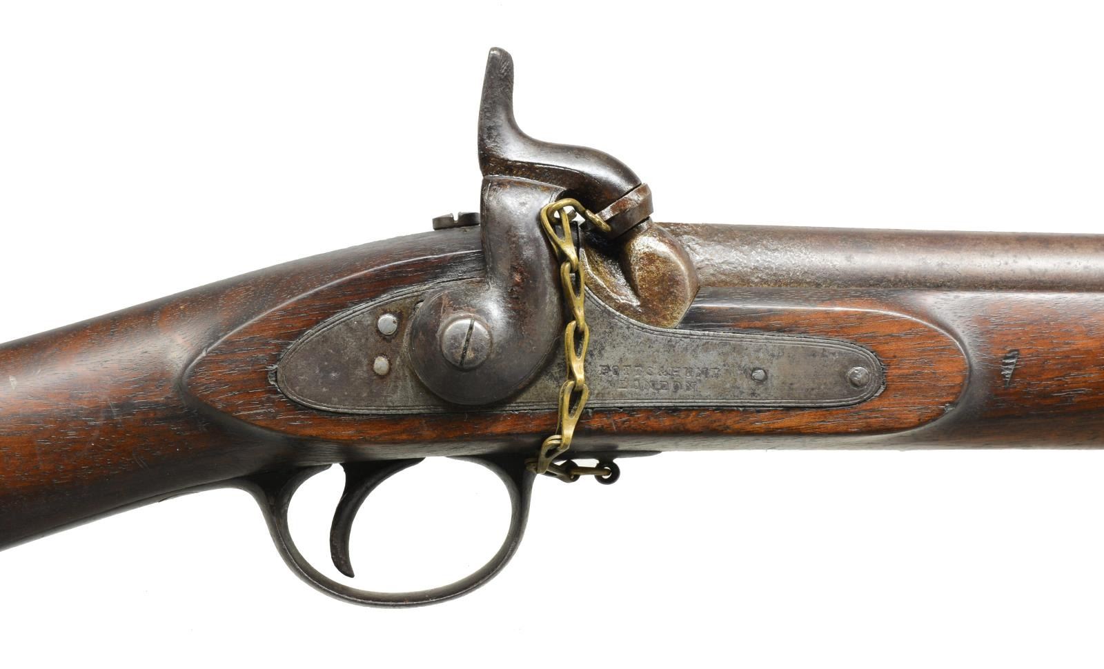 Cal. .577. NSN. Bbl. measures 33”. Thomas Potts & Thomas Hunt formed a partnership in 1853 & operated throughout the Civil War years from their offices on Leman St. & their workshop in Tenter Ground. The firm sold thousands of arms to both the Confederacy & the Union, seemingly on a first-come, first-served basis in the highest traditions of British mercantilism. Bbl. has a front sight & rear folding sight. Bbl. is proofed on the left side, near the breech, crown over “P”, “25”, crown over “V” & an illegible proof. Lock is marked, “POTTS & HUNT LONDON” in front of the hammer. A nipple guard is present & attached to the front of the trigger guard w/ a brass chain. Iron trigger guard, buttplate, bbl. bands, nosecap, sling swivels & ramrod. Front bbl. band has a side lug for the P1853 Enfield yataghan style saber bayonet. Stock is proofed behind the rear trigger guard, crown over “H” & stamped “12”. CONDITION: bbl. has a dark patina w/ a few areas of faded plum brown. Lock has a similar finish. The remaining iron parts all have a dark patina w/ traces of fading finish. The stock is very solid w/ expected dents & dings but no major issues. Bore is good but a bit dirty w/ visible rifling. (01-18780/BF). ANTIQUE. $2,000-2,800.