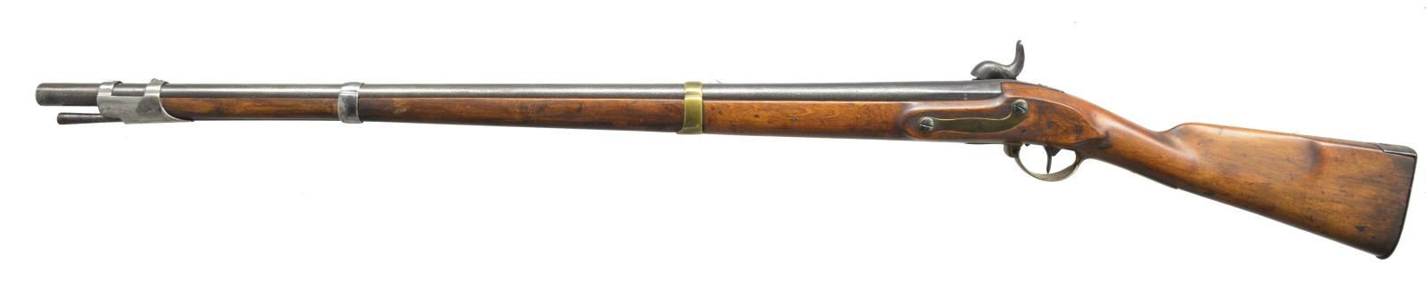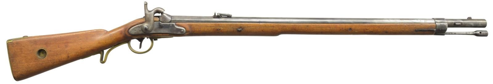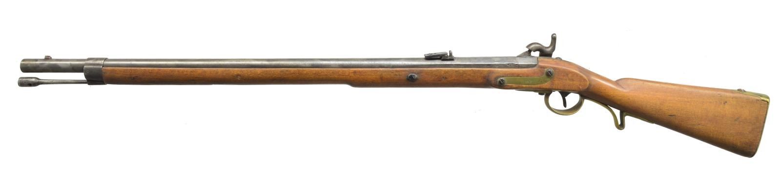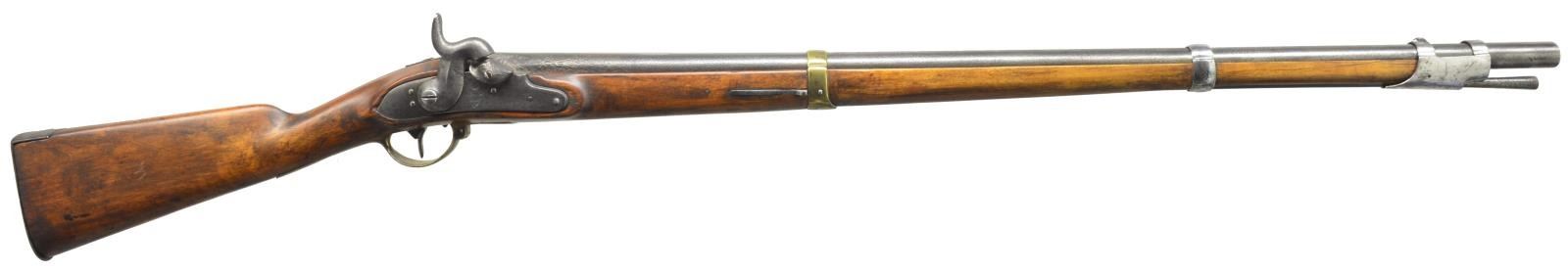 ALL: NSN. 1) NIELSE 1825 CONVERSION. Cal. 76. Bbl. 36". Bolster style conversion. Bbl. & lock are dated 1825. 3 Band walnut stock. Trigger guard, side plate & center band are brass, other fittings are iron. Peak of buttplate stamped "181 / 20 / 22 I H". Trumpet tipped iron ramrod. CONDITION: cleaned gray metal showing general pitting becoming very heavy in breech area. Refinished stock shows cracks & chips around buttplate, top tang, & lock areas. Dark pitted bore. (01-18294/DS). 2) P.J. MALHERBE & CIE BELGIAN RIFLE. Cal. 58. Bbl. 33" rifled w/ blade front sight & graduated leaf rear sight. Right side bayonet lug. Island lock. 2 Band walnut stock w/ brass fittings & slotted tip iron ramrod. CONDITION: metal has faded to a light brown patina. Stock is broken through head & wrist area w/ added wood, plastic filler & plug type repairs, with large missing wood repair. Dark pitted bore. (01-18351/DS). 3) EUROPEAN CONVERSION RIFLE. Cal. 72. Bbl. 33 1/4" rnd. w/ oct. shank & rifled bore. Blade front sight w/ folding leaf rear sight. Key fastened walnut stock w/ brass fittings. Right side of butt has brass compass base. Iron ramrod. CONDITION: metal has cleaned gray appearance w/ pitting in breech area. Refinished stock shows handling marks w/ cracks on right side of forearm. Dark lightly pitted bore retains sound rifling. (01-18375/DS). ALL ANTIQUE. $750-1,250.