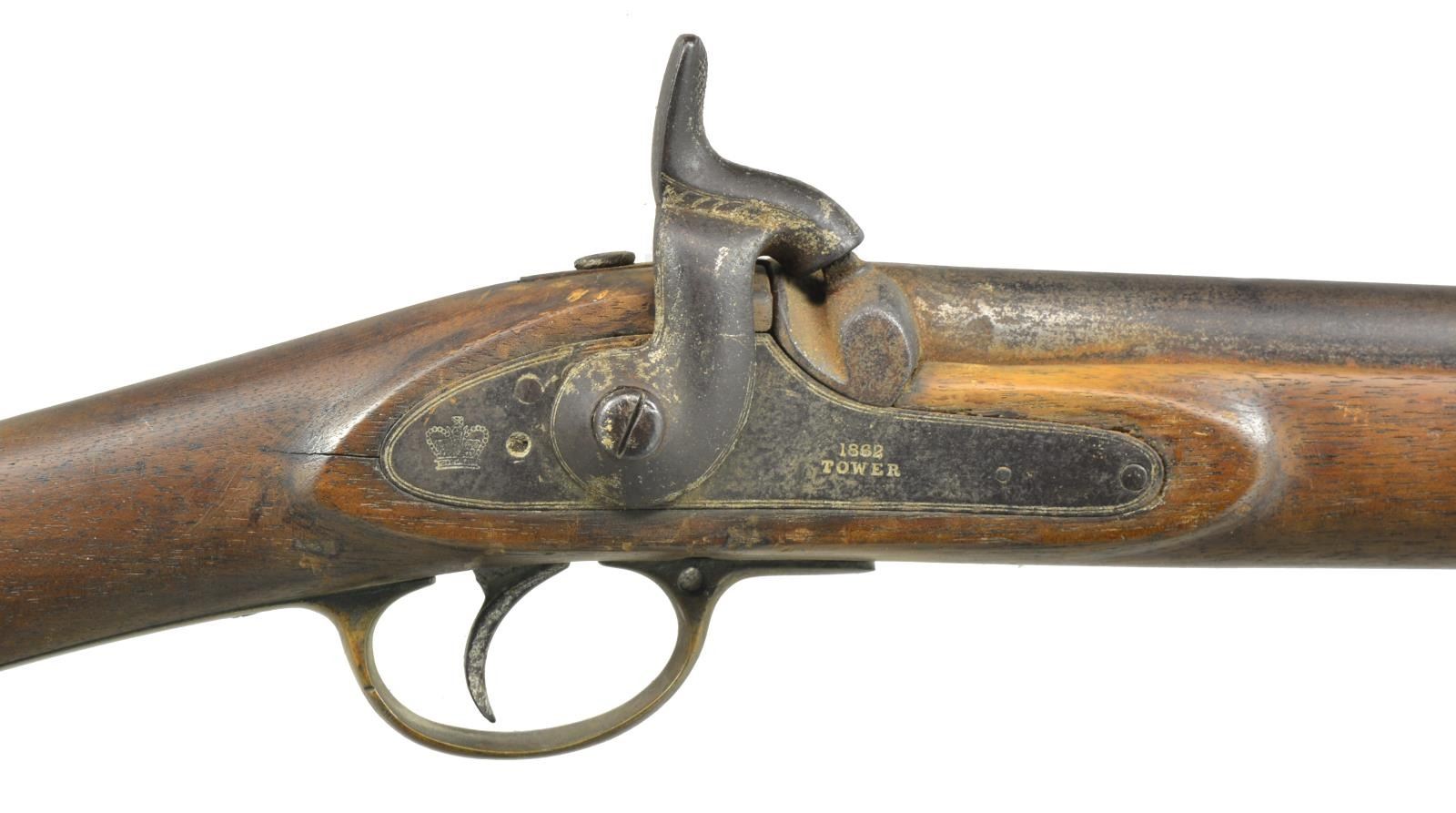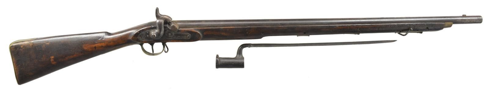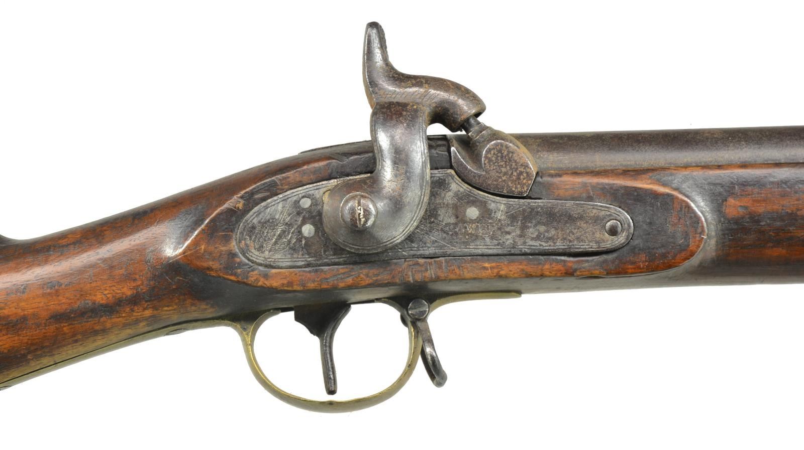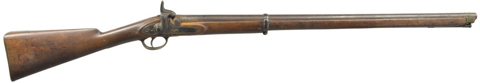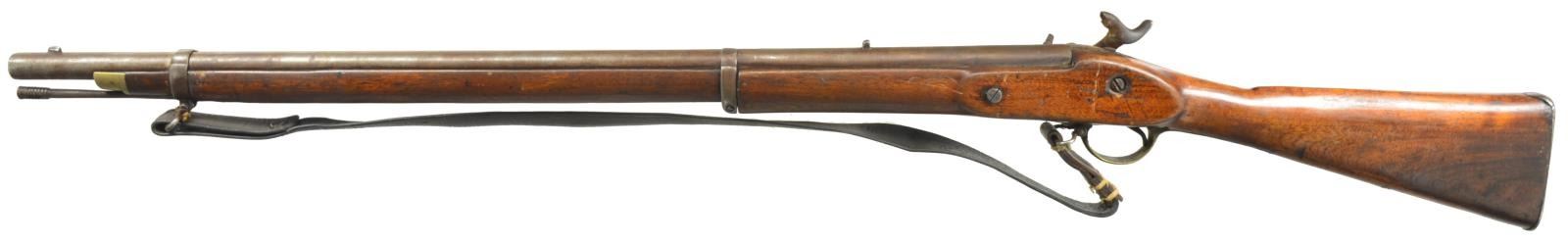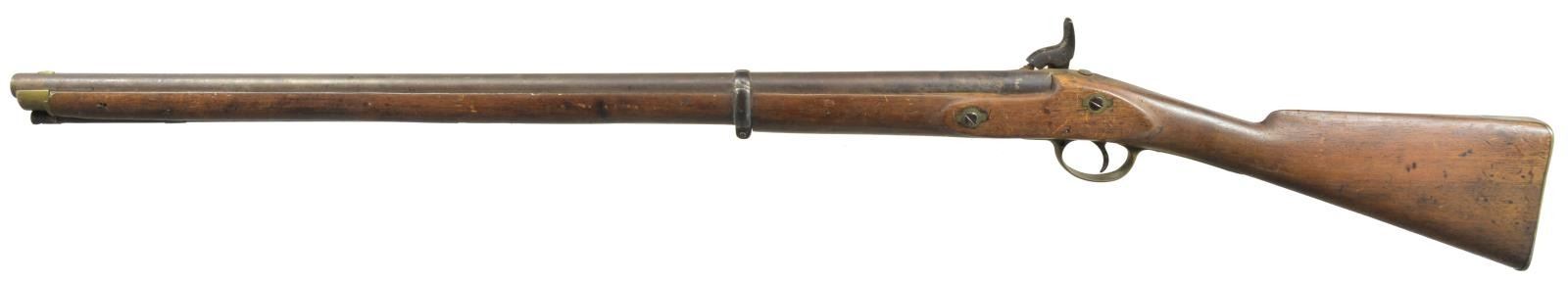 ALL: NSN. 1) Cal. 75. Bbl. 33 1/4" smooth bore w/ base only for front sight. Percussion conversion of a Lovell Pattern 1835 Musket. Tower marked percussion lock. Pin fastened walnut stock w/ brass fittings. UNATTACHED ACCESSORIES: Brown Bess triangular bayonet. CONDITION: metal has dark patina appearance w/ light pitting. Stock has age darkened worn appearance w/ dents & marks having sm. cracks & chips in tang & lock areas. Dark pitted bore. (01-18290/DS). 2) Cal. 62. Bbl. shortened to 32" w/ replacement blade sight. Assembled percussion musket. 1862 Dated Tower lock. Cut down walnut stock w/ brass fittings having 1 iron split band remaining. Slotted tipped ramrod held by 1 added bass pipe. CONDITION: metal has mottled brown patina appearance showing surface corrosion w/ heavy pitting in breech area. Stock shows wear & handling marks w/ sm. crack behind lock. Dark pitted bore. (01-18376/DS). 3) Cal. 71. Bbl. shortened to 32 3/8" w/ replacement front sight & fixed V notch rear sight. Assembled percussion musket. 1856 Dated Tower lock. Walnut stock is cut to 2 band configuration w/ brass fittings. Slotted tipped ramrod. Leather sling on original swivels. Left ear of stock is "C.S.A.". Right side of stock is stamped "484". CONDITION: metal has a mottled dark gray brown patina showing corrosion pitting. Hammer cup is chipped. Stock is broken at head w/ nail type repairs showing numerous chips around lock & top tang. Lock is not functioning. Dark pitted bore. (01-18377/DS). ALL ANTIQUE. $600-1,000.