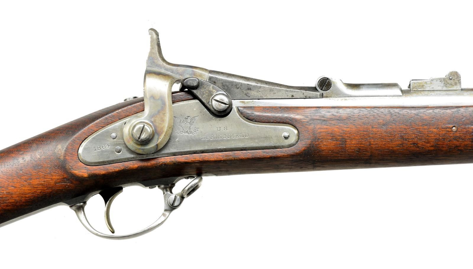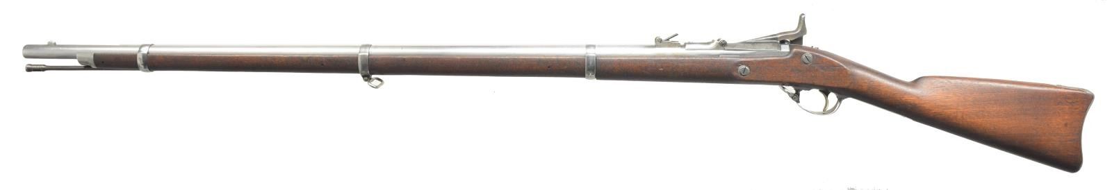 RIFLE. Cal. 50-70. NSN. Bbl. 36 5/8". Barleycorn front sight w/ folding leaf rear sight. Breech block is dated 1866 over eagle's head. 1864 Dated Springfield lock w/ case colored conversion hammer. 3 Band walnut stock. Slotted tipped iron cleaning rod. CONDITION: bbl. & hardware have bright cleaned appearance w/ lg. areas of very light pitting. Hammer retains 90% light & fading case colors. Sanded & refinished stock showing dents & handling marks. Bore is generally bright w/ sound rifling showing sm. spots of pitting. (01-18014/DS). ANTIQUE. $600-900.