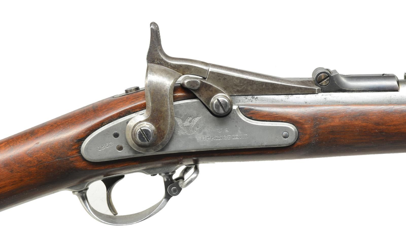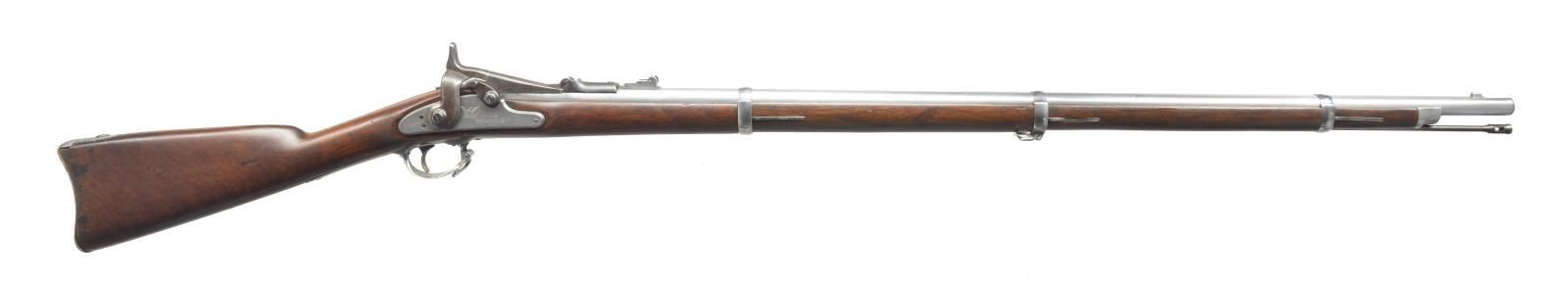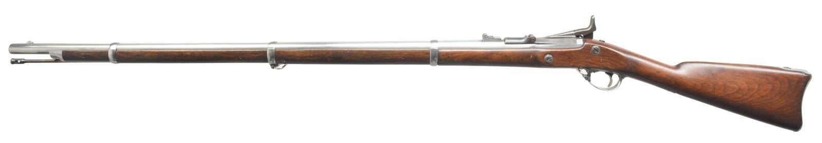 RIFLE. Cal. 50-70. NSN. Bbl. 36 5/8" w/ barleycorn front sight & folding leaf rear sight. 1866 Dated breech block w/ eagle's head. 1863 Dated Springfield lock. 3 Band fastened walnut stock w/ sling swivels & slotted tipped rod. CONDITION: bbl. & fittings have bright cleaned appearance showing sm. spots of pitting. Action & lock have faded gray appearance. Heavy sanded & refinished stock w/ sm. dents & marks. Bore retains intact rifling showing scattered pitting. (01-18015/DS). ANTIQUE. $600-900.