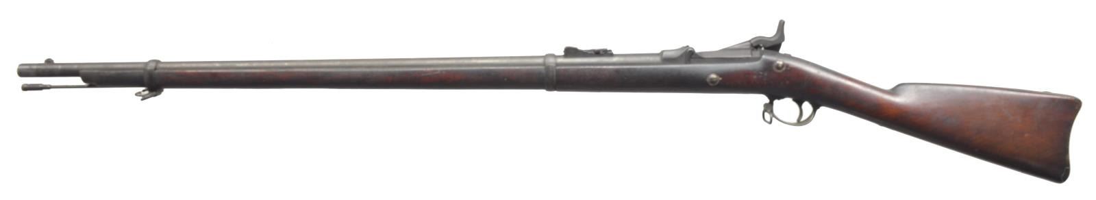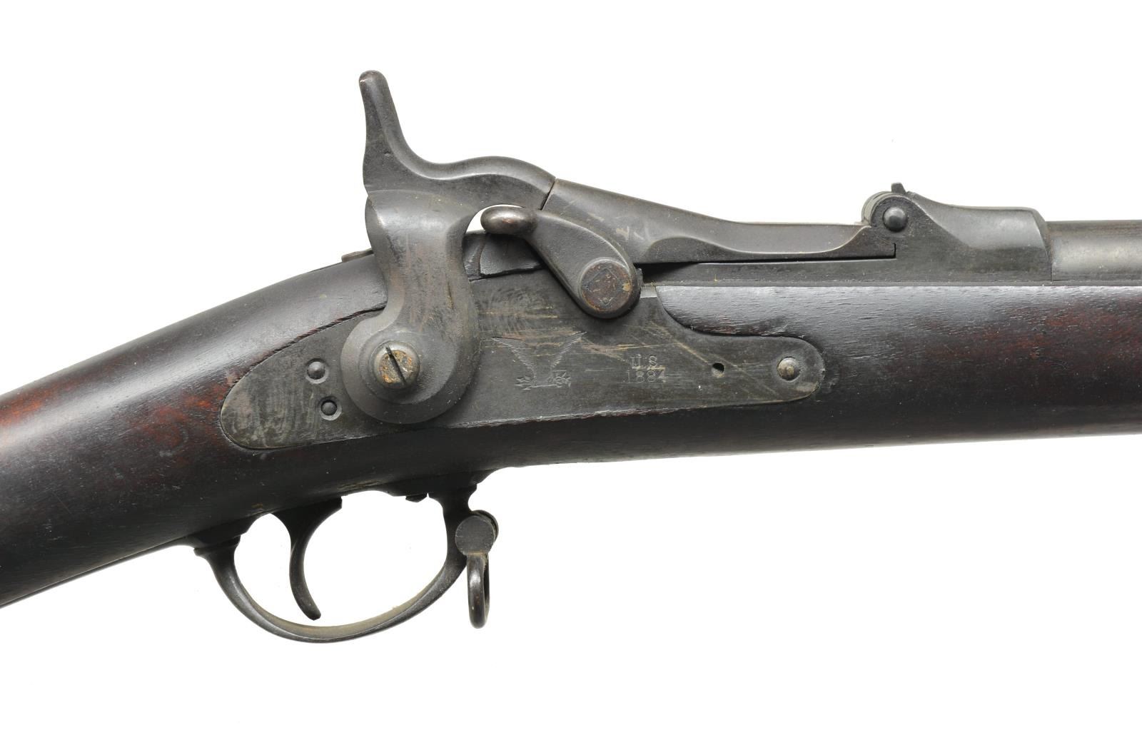 Cal. 45-70. S# 6644. Bbl. 32 5/8" w/ blade front sight w/ Model 1873 rifle rear sight. 1873 Dated high arch breech block. 1884 Dated replacement lock. Correct short comb 2 band walnut rifle stock. Left side has "RGS" cartouche. Toeline has circle "R" firing proof w/ inspectors initials "JH". Slotted tip ramrod. Pre Custer rifle mfg. Jan. - March 1874. CONDITION: metal has acquired a dark storage related patina. Original stock finish shows sm. dents & handling marks w/ areas of age darkened finish. Bore is generally bright retaining strong rifling. (01-18285/DS). ANTIQUE. $500-700.