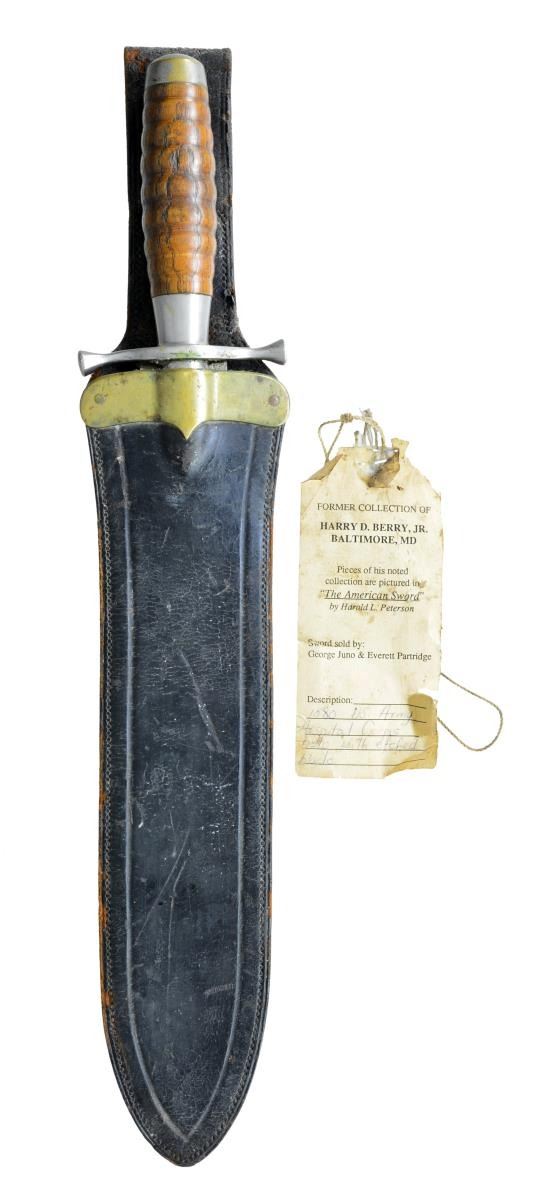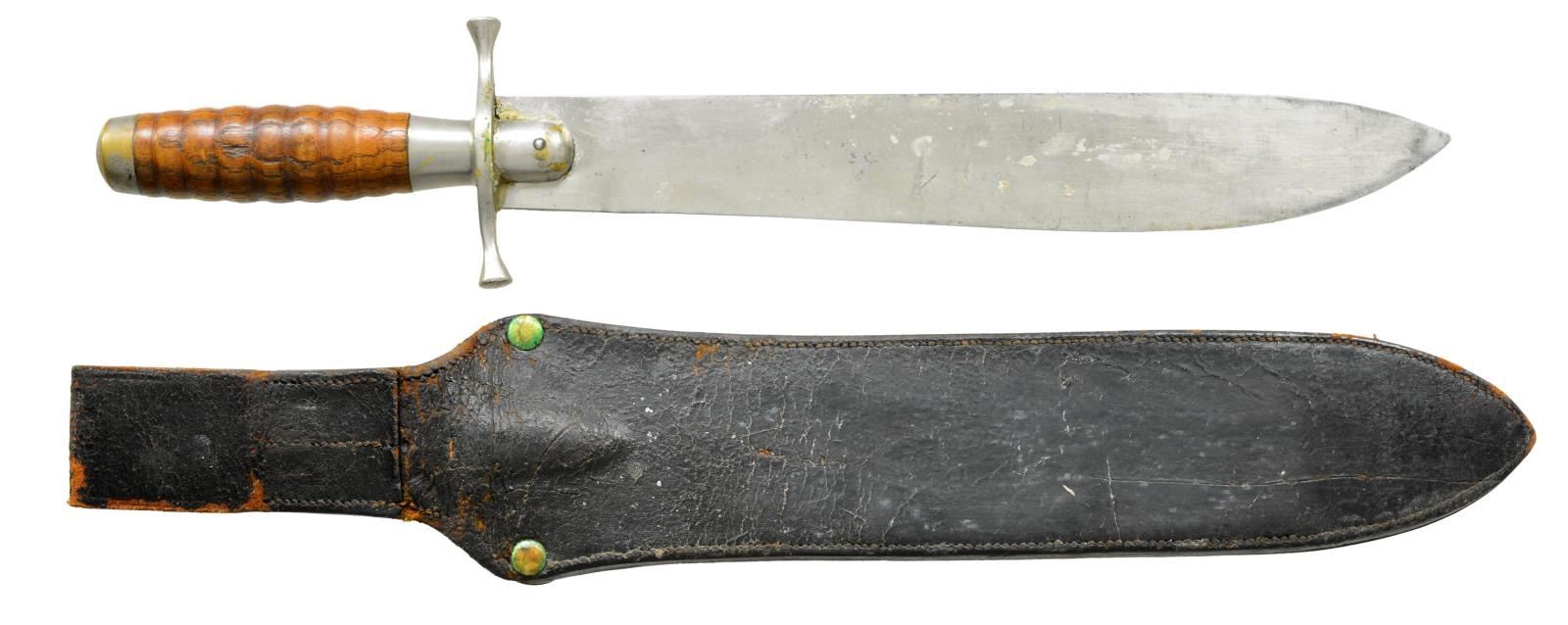 16 1/2" Overall, wide 12" blade is etched in lg. panel “HOSPITAL CORPS / U.S. ARMY” w/ brass mounted leather scabbard. You will not find a much better example than this one, once in the famous edged weapon collection of Harry Berry. CONDITION: fine overall, blade other than some greasy stains retains most of its luster including etched panel, scabbard is sound w/ craquelure, Arsenal marks on scabbard are only partially discerned. PROVENANCE: EX-Harry Berry Collection. (02-13875/JS). $800-1,200.