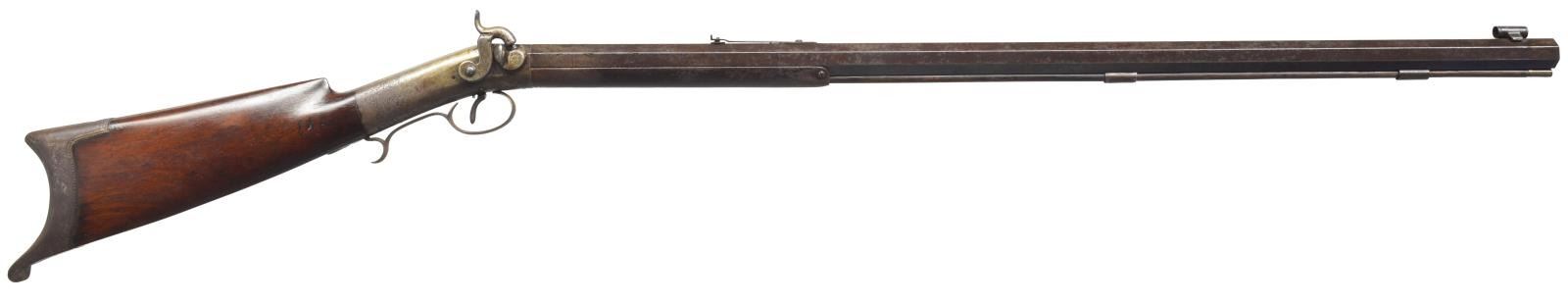 Cal. 38. S# 46. Bbl. 35" full oct. bbl., 52" overall, hooded front sight, adj. rear sight, marked on top flat “ALLEN & THURBEN CAST STEEL / WORCESTER”. This early production Worcester rifle dates 1847-1850. Side hammer, iron frame forming wrist, sparse engraving on frame, hammer, trigger guard & unique thick Schuetzen buttplate. Lightly figured walnut buttstock, unique Allen iron forestock & single set trigger. There are very few survivors, Paul Allen estimating no more than 20-30 were produced. PROVENANCE: Jim Serven, Santa Ana California; Phillip Van Cleave collection Nov. 4th, 1944; Paul Henry collection 1990. CONDITION: very good overall. Frame is overall mottled gray w/ crisp etching. Bbl. retains much of its brown finish. Stock well fit, forestock also retains some brown finish w/ scattered staining & light pitting. Mechanically fine w/ crisp, bright bore. (01-18559/JS). ANTIQUE. $1,000-2,000.