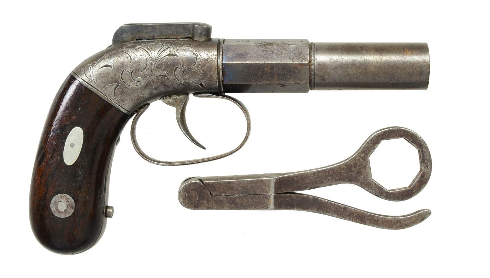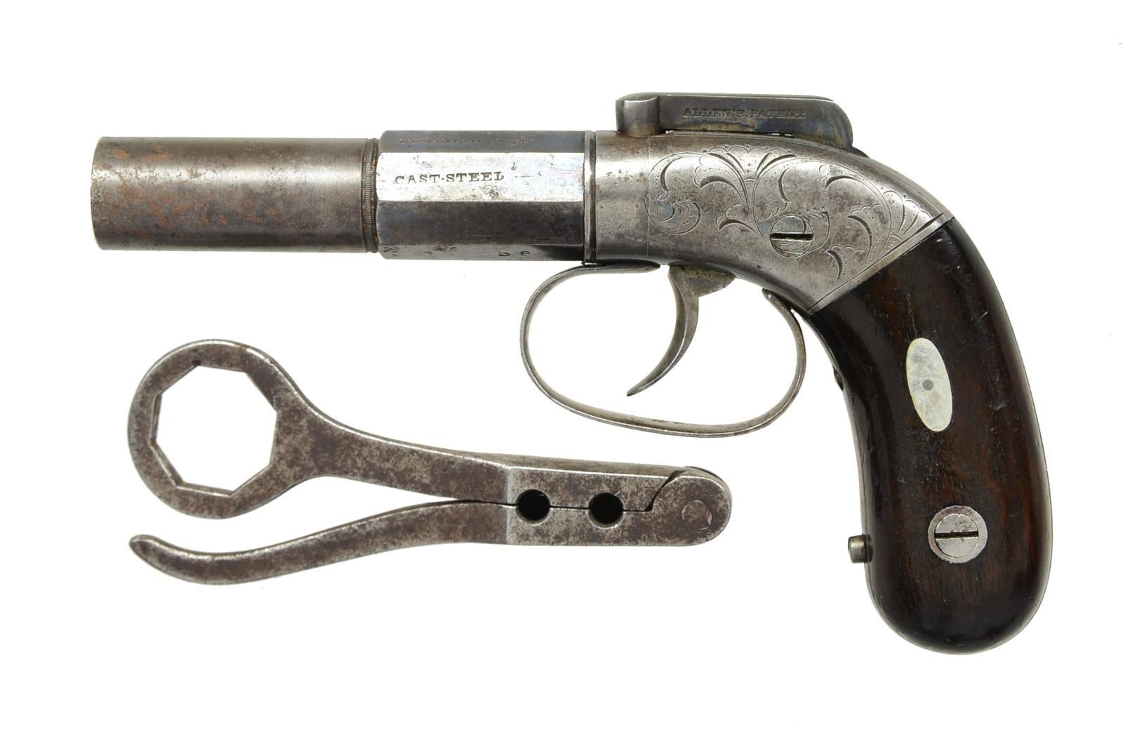 THURBER BAR HAMMER SINGLE SHOT PERCUSSION PISTOL. Cal. 38. S# 38. Bbl. 3" oct. to round bbl., marked on top three flats “ALLEN & THURBER”, “NORWICH C—T”, & “CAST STEEL”, bar hammer marked “ALLEN’S PATENT” on left side, engraved frame, walnut grips w/ sm. oval German silver escutcheons. CONDITION: fine overall, complete, original & matching, retaining about 20% original blue & case colors, hairline crack on left grip, mechanically fine, crisp rifled bore. PROVENANCE: Lifelong collection of early Allen pistols. (01-18591/JS). ANTIQUE. $600-1,000.