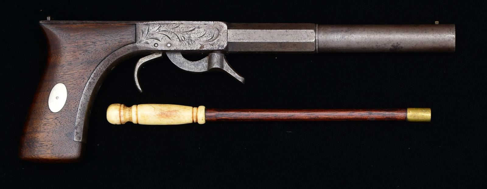 SINGLE SHOT PERCUSSION PISTOL. Cal. 32. S# 12. Bbl. 10" overall, 5 1/4" oct. to round bbl., top of frame marked “POCKET RIFLE / CAST STEEL / WARRANTED” & “MEAD & ADRIANCE” who were St. Louis jewelers selling this gun about 1836. This gun is pictured as figure 134 in Herschel Logan’s 1960 “Pictorial History of the Under Hammer Gun”. PROVENANCE: ex- Phillip Van Cleave collection; ex Paul Henry collection 1989. CONDITION: very good overall, complete & original, fairly sharp edges, discernible markings, mottled gray iron patina, traces of finish, pitting around breech. Pistol is accompanied by 7 1/2" bone & brass tipped cleaning rod as shown w/ it in included late 1992 article. (Brass tip is slightly too lg. for use on this pistol). PROVENANCE: Lifelong collection of early Allen pistols. (01-18602/JS). ANTIQUE. $600-900.