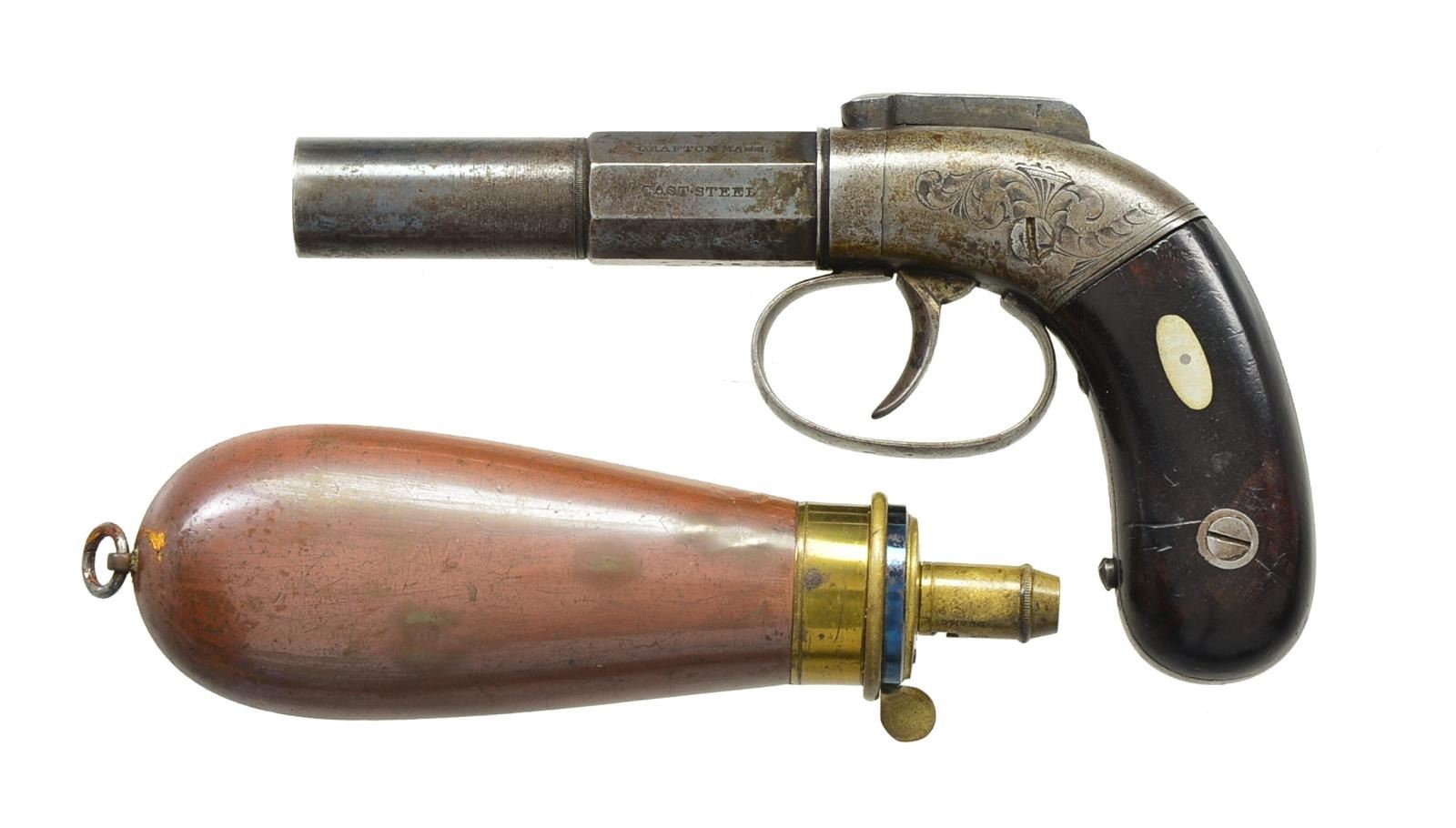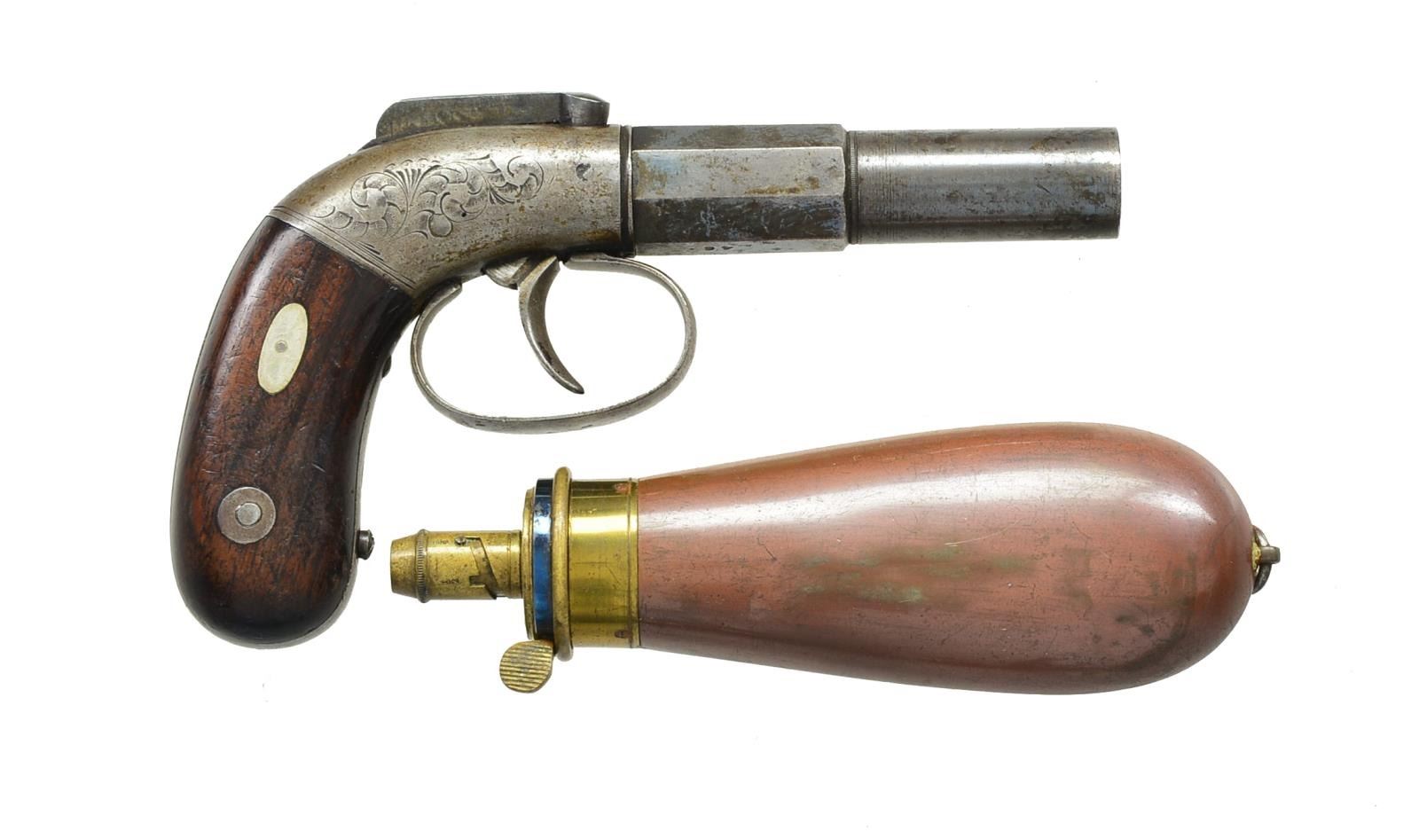 HAMMER PISTOL W/ FLASK. Cal. 36. S# 46. Bbl. 3" oct. to rnd. bbl. marked on top 3 flats “ALLEN & THURBER”, GRAFTON MASS” & “CAST STEEL”. Bar hammer marked on top “ALLEN’S PATENT”. Engraved framed & backstrap, lightly figured grips w/ vacant sm. German silver oval escutcheons. UNATTACHED ACCESSORIES: accompanying Dixon bag flask, which retains most of its original red varnish, fully functional, fire blue spring. CONDITION: fine overall; sharp retaining strong traces of bright finish, overall smooth gray/brown patina, crisp action & bore. PROVENANCE: Lifelong collection of early Allen pistols. (01-18578/JS). ANTIQUE. $500-800.