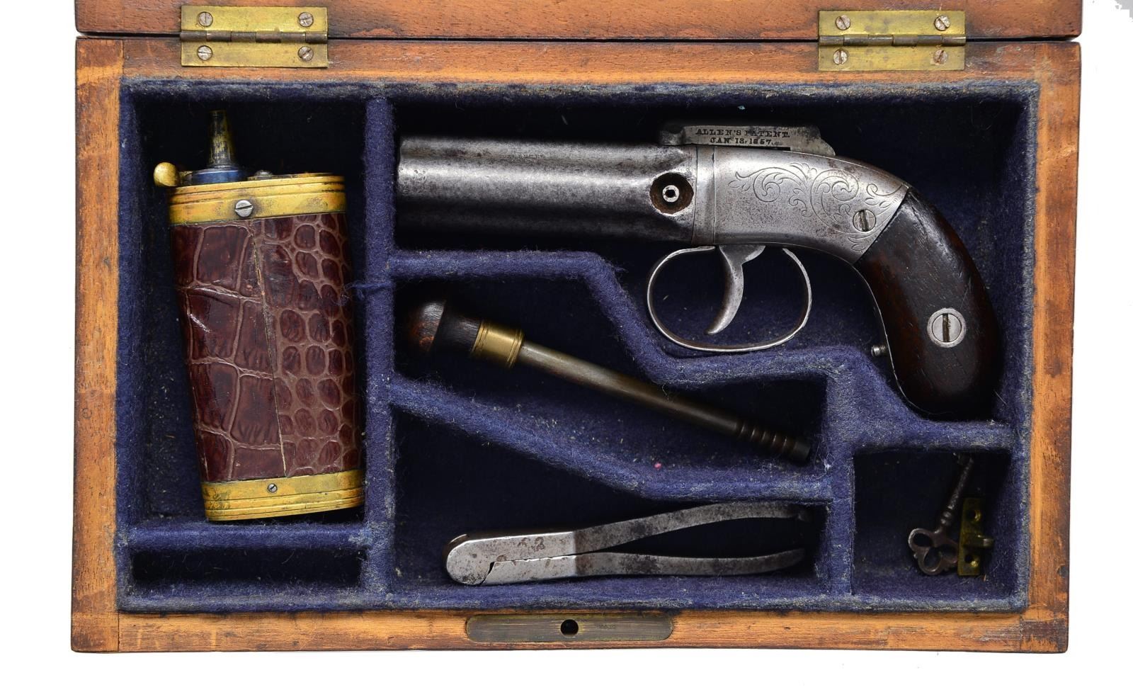 HAMMER PEPPERBOX PISTOL. Cal. .34. S# 528. 2.75” 4-Bbl. cluster, “PATENTED 1845” & “ALLEN & WHEELOCK” stamped on adjacent bbl. flutes, “ALLEN’S PATENT / JAN. 18, 1857” stamped on left side of bar hammer, engraved frame. CONDITION: good to very good overall, metal has an overall mottled gray patina, crisp markings, mechanically functional, clear smooth bores. Accompanying compartmentalized casing has 2 cavity, 3 compartment Dixon flask, reproduction rammer/cleaning rod. Walked mechanism on case is broken key & part of closure is in a newly lined case. PROVENANCE: Lifelong collection of early Allen pistols. (01-18616/JS). ANTIQUE. $800-1,200.