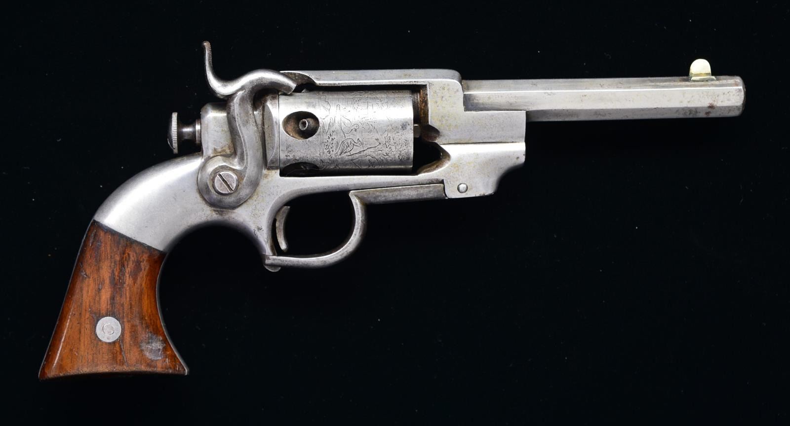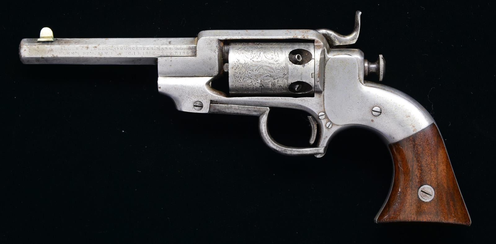 PERCUSSION POCKET PISTOL. Cal. 28. S# 527. Bbl. 4" oct. bbl. w/ 2 line Allen & Wheelock address & patents on left side, rolled engraved cyl. scene of game, Allen patent hinged trigger guard/rammer. 8" Overall. CONDITION: very good overall; complete & matching, gray metal, discernable markings & cyl. scene, mechanically fine w/ dirty rifled bore. PROVENANCE: Lifelong collection of early Allen pistols. (01-18579/JS). ANTIQUE. $700-900.