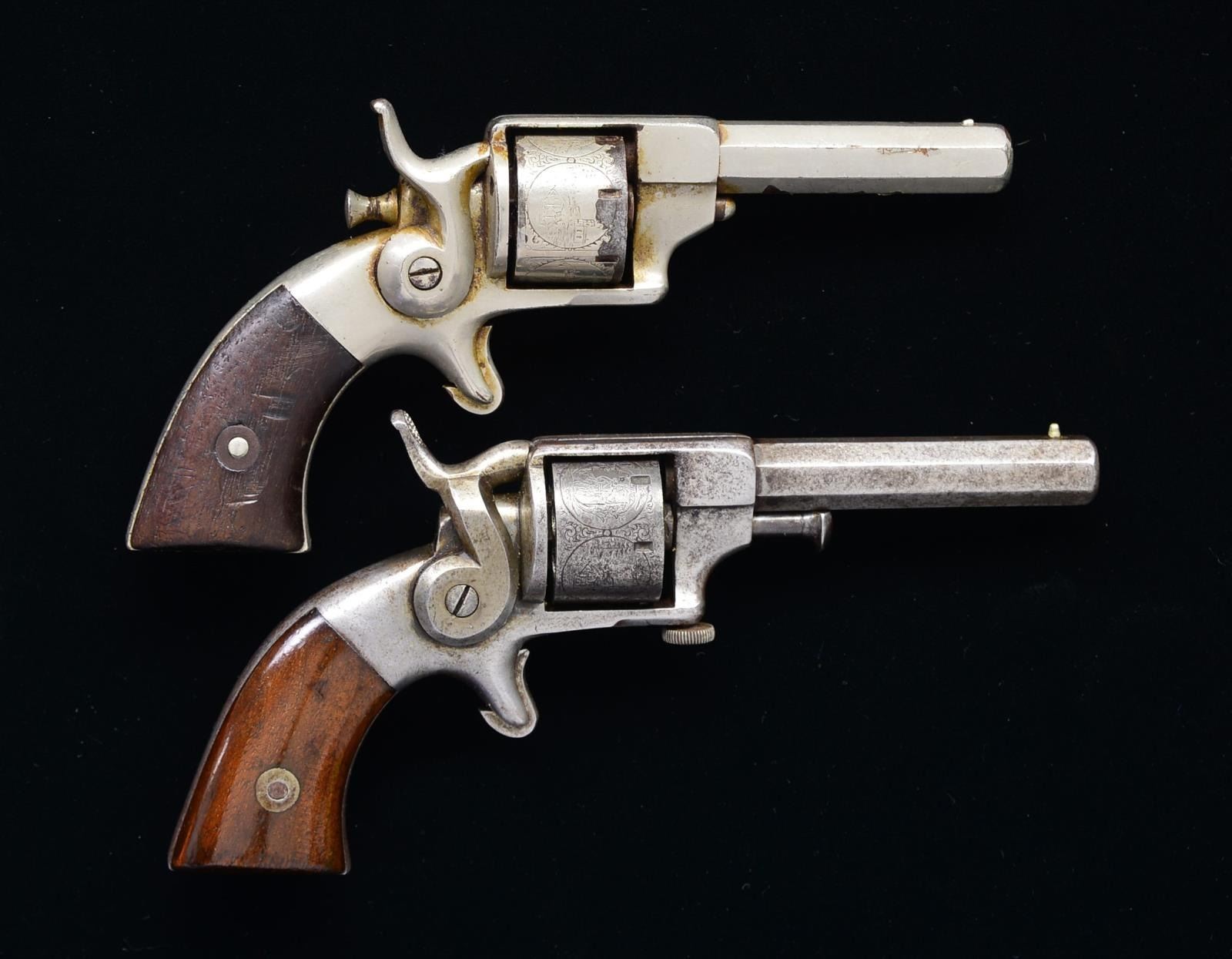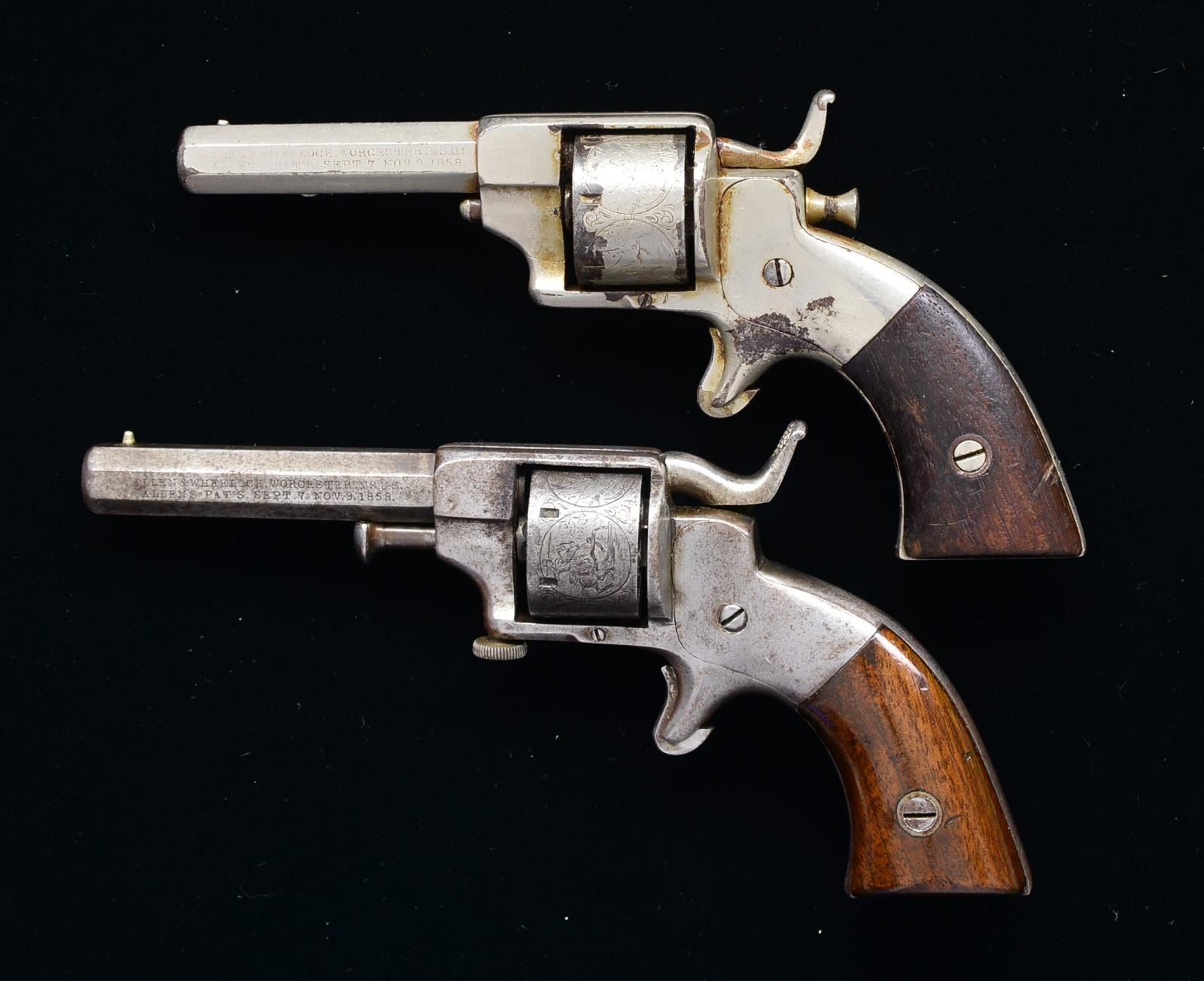 7-SHOT REVOLVERS. 1) 1ST MODEL. Cal. 22 RF. S# 393. Bbl. 2.5" bbl. stamped “ALLEN & WHEELOCK WORCESTER MASS / ALLEN’S PAT’S SEPT 7, NOV 9, 1858”. This earliest model has the unique “hourglass” shaped cyl. pin knob at rear of frame, later production had more traditional cyl. pins entering from front of frame. Other early characteristics include sighting groove in top strap. CONDITION: good to very good overall, retains most of its nickel plating, flaking in areas w/ pitting. Mechanically cyl. does not index, pitted bore. (01-18613/JS). 2) 2ND MODEL. Cal. 22 RF. S# 466. Bbl. 3" bbl. stamped “ALLEN & WHEELOCK WORCESTER MASS / ALLEN’S PAT’S SEPT 7, NOV 9, 1858”. This is scarcest of the sidehammer 22s, being transition from 1st model having first front entry cyl. pin still w/ sighting groove in top strap only seen on early guns, roll engraved cyl., pin held by knurled headed screw at bottom of frame. No more than 100 of these transitions thought made. PROVENANCE: ex- Phillip Van Cleave collection; ex Paul Henry collection. CONDITION: very good overall, gray patina, good markings, mechanically functional w/ clear rifled bore. PROVENANCE: Lifelong collection of early Allen pistols. (01-18614/JS). ANTIQUE. $600-1,000.