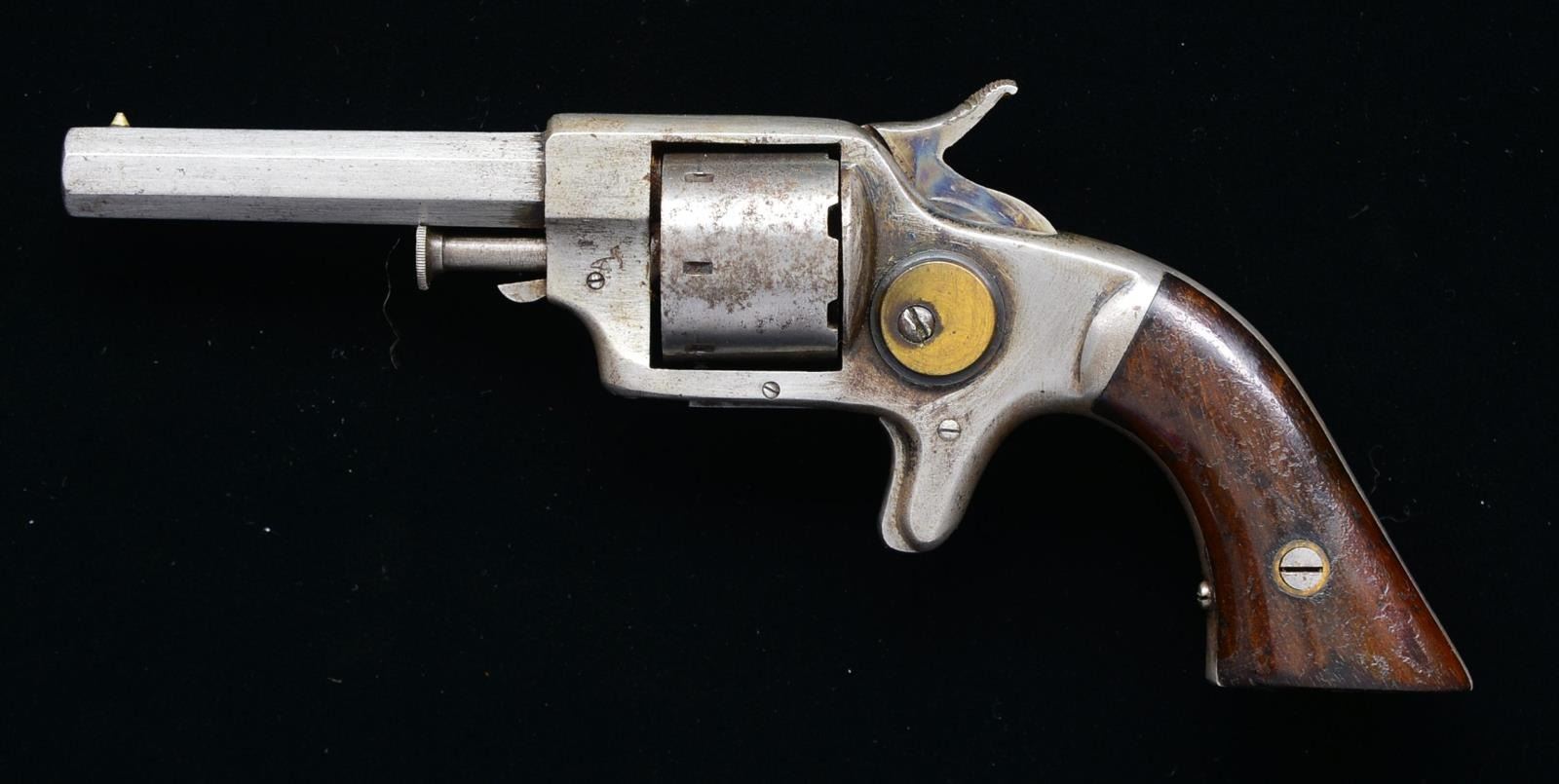 LIPFIRE POCKET REVOLVER. Cal. 25 Lipfire. S# 51. Bbl. 3" oct. bbl., 7" overall. Solid frame w/ circular brass rnd. side plate on left side. 7 Shot cyl. has distinctive notches cut for cartridge lips at rear. This gun was made 1861-1862 & is a fine survivor w/ less than 200 mfg. CONDITION: good to very good overall; complete & matching, totally unmarked as all production examples are, fine action w/ dirty rifled bore, grips retain most of their original varnish. PROVENANCE: Lifelong collection of early Allen pistols. (01-18573/JS). ANTIQUE. $400-800.