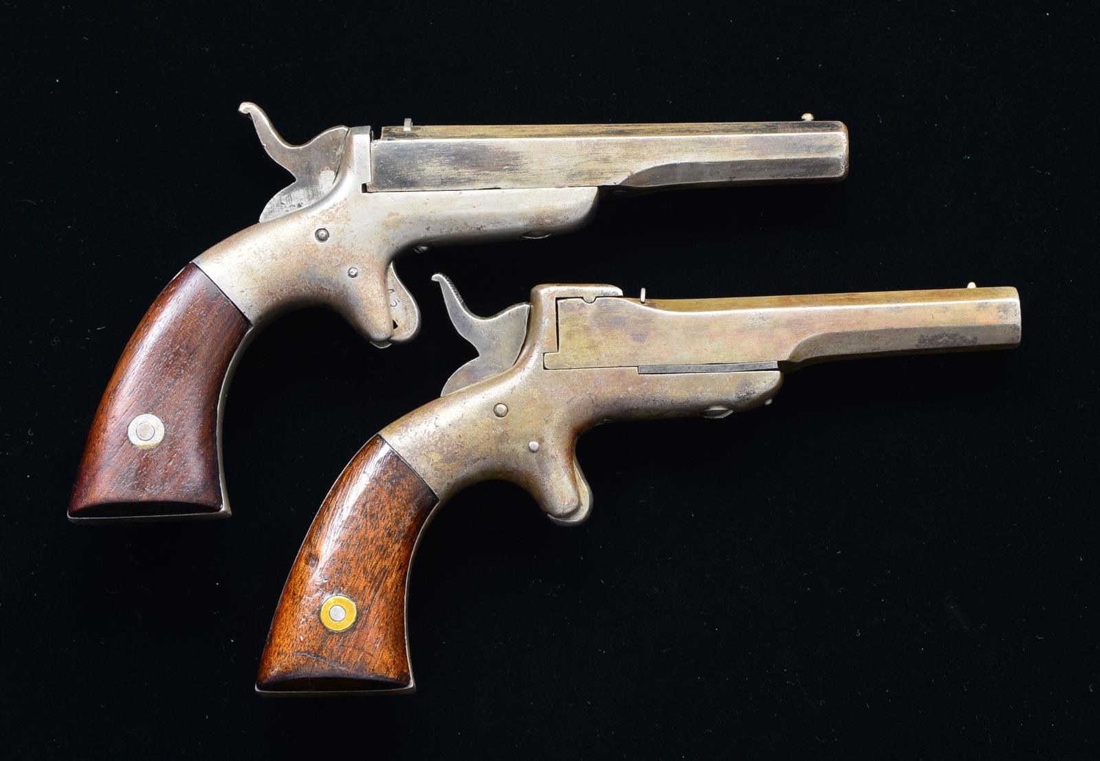 PISTOLS. 1) W/ EXPERIMENTAL FULL OCT. BBL. Cal. 32 RF. S# 245. Bbl. 4" oct. bbl. 7" Overall. “ALLEN & WHEELOCK” on left side of bbl. CONDITION: very good overall; traces of finish, will not hold full cock, dirty rifled bore. (01-18605/JS). 2) Cal. 32 RF. S# 386. Bbl. 4" full oct. bbl. marked “ALLEN & WHEELOCK WORCHESTER MASS” on left side. Full oct. bbls. are very scarce, as a vast majority were half rnd. CONDITION: very good overall; smooth iron patina, w/ staining, light pitting, complete & matching, mechanically fine w/ dirty rifled bore. PROVENANCE: Lifelong collection of early Allen pistols. (01-18606/JS). BOTH ANTIQUE. $600-1,000.