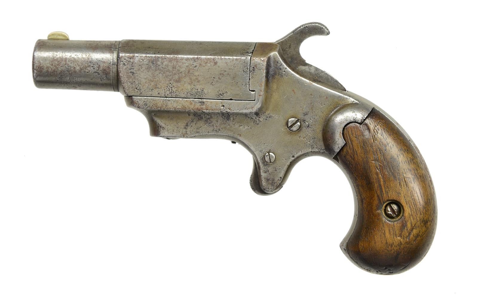 Cal. 41 RF. S# 1320. Bbl. 2 1/2" oct. to rnd. bbl., 4 3/4" overall. Bbl. marked “E. ALLEN & CO. WORCHESTER MASS / ALLEN’S PAT. MCH. 7 1865”. CONDITION: good to very good overall; complete & original, discernable markings, iron patina, mechanically functional w/ good rifled bore. PROVENANCE: Lifelong collection of early Allen pistols. (01-18565/JS). ANTIQUE. $800-1,200.