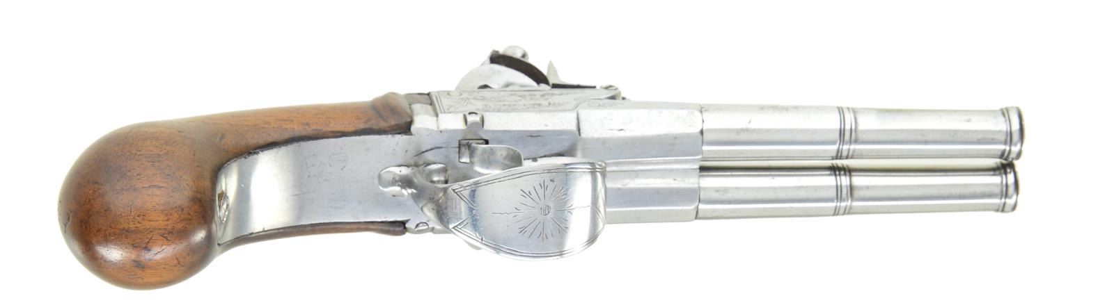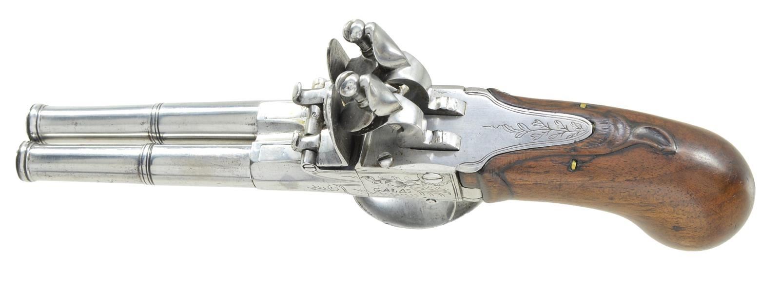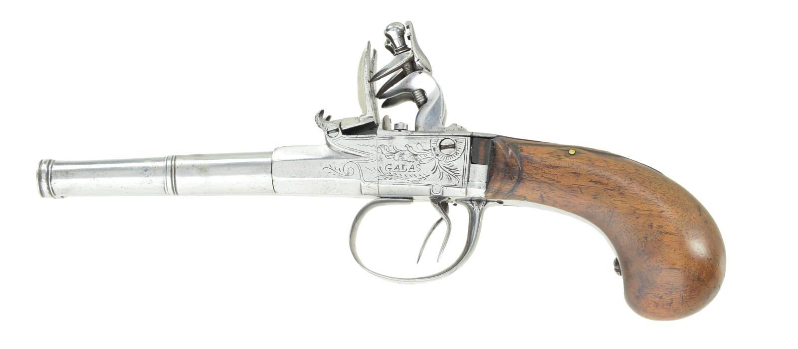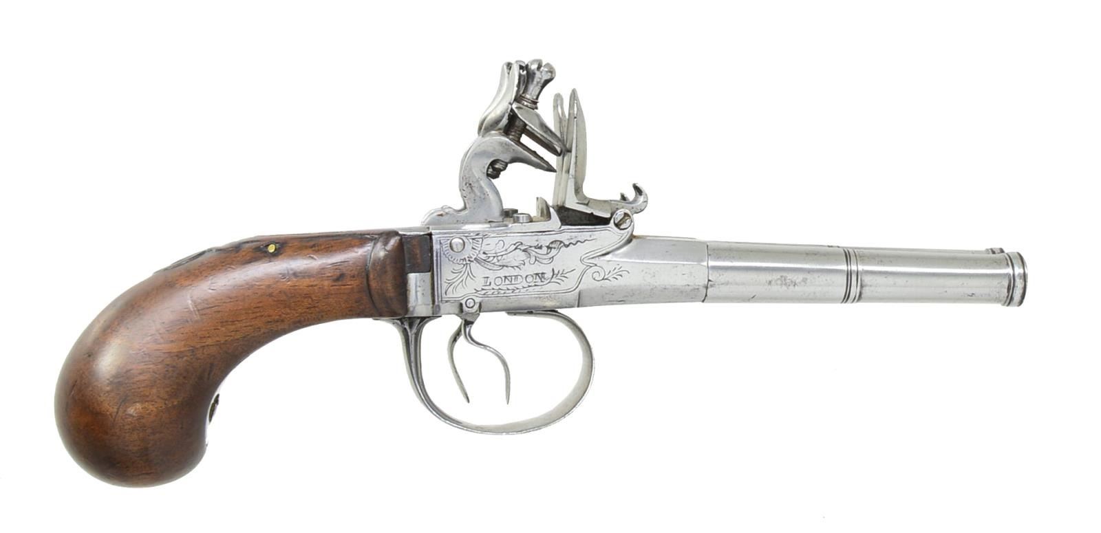 BOXLOCK FLINTLOCK PISTOLS. Fine pair of dbl. bbl. flintlock pistols. BOTH: Cal. 45. NSN. 10" Overall. Bbls. 3 1/2" screw on 2 stage rnd. w/ flared cannon muzzles, engraved iron mountings. Each pistol marked “LONDON” on right side & “GALAS” opposite. Bulbous bag grips w/ moldings. CONDITION: very good to fine overall, iron is overall polished to a gray/bright patina. Mechanically functional w/ clean rifled bores. PROVENANCE: From the Collection of John "Tim" Breth Jr. (01-17788; 01-17790/JS). ANTIQUE. $1,500-2,000.