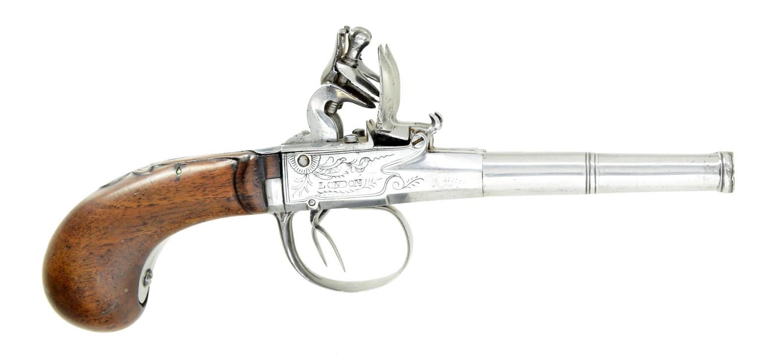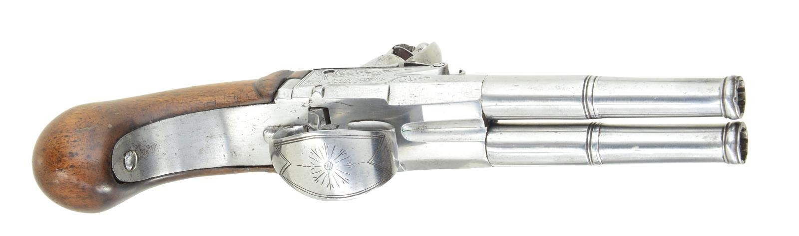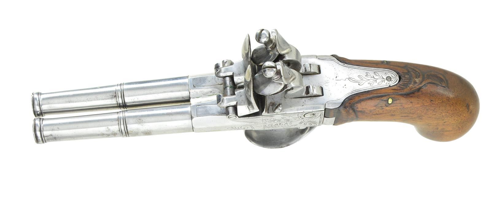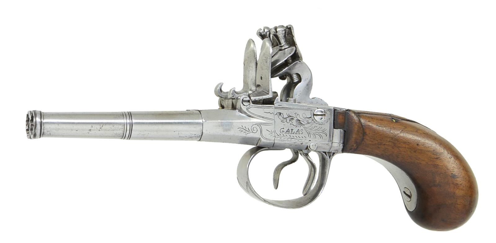 BOXLOCK FLINTLOCK PISTOLS. Fine pair of dbl. bbl. flintlock pistols. BOTH: Cal. 45. NSN. 10" Overall. Bbls. 3 1/2" screw on 2 stage rnd. w/ flared cannon muzzles, engraved iron mountings. Each pistol marked “LONDON” on right side & “GALAS” opposite. Bulbous bag grips w/ moldings. CONDITION: very good to fine overall, iron is overall polished to a gray/bright patina. Mechanically functional w/ clean rifled bores. PROVENANCE: From the Collection of John "Tim" Breth Jr. (01-17788; 01-17790/JS). ANTIQUE. $1,500-2,000.