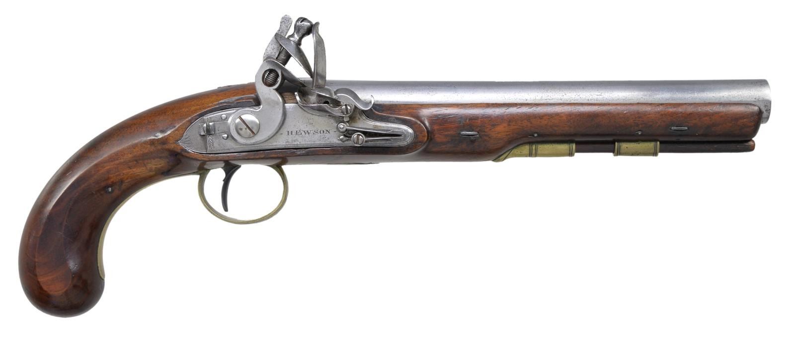 Cal. approx. 64. NSN. Bbl. measures 8 3/4". Bbl. marked on the top, “- - LONDON - -“. Left side of the bbl. has 2 crowned crossed key proofs. Bbl. tang has engraved decoration. Lockplate is engraved at the rear & is marked, “- HEWSON -“ under the pan. There is a slide safety behind the cock. Engraved brass trigger guard w/ pineapple top finial. Brass ramrod thimble & entry thimble. Iron side plate/belt bar. CONDITION: bbl. has been heavily cleaned inside & out to a bright finish. Lock has been cleaned in the same manner. Brass parts have been polished but have begun to acquire a more mellow patina. Wood is quite sound. Bore is shiny. (01-18421/BF). ANTIQUE. $800-1,200.