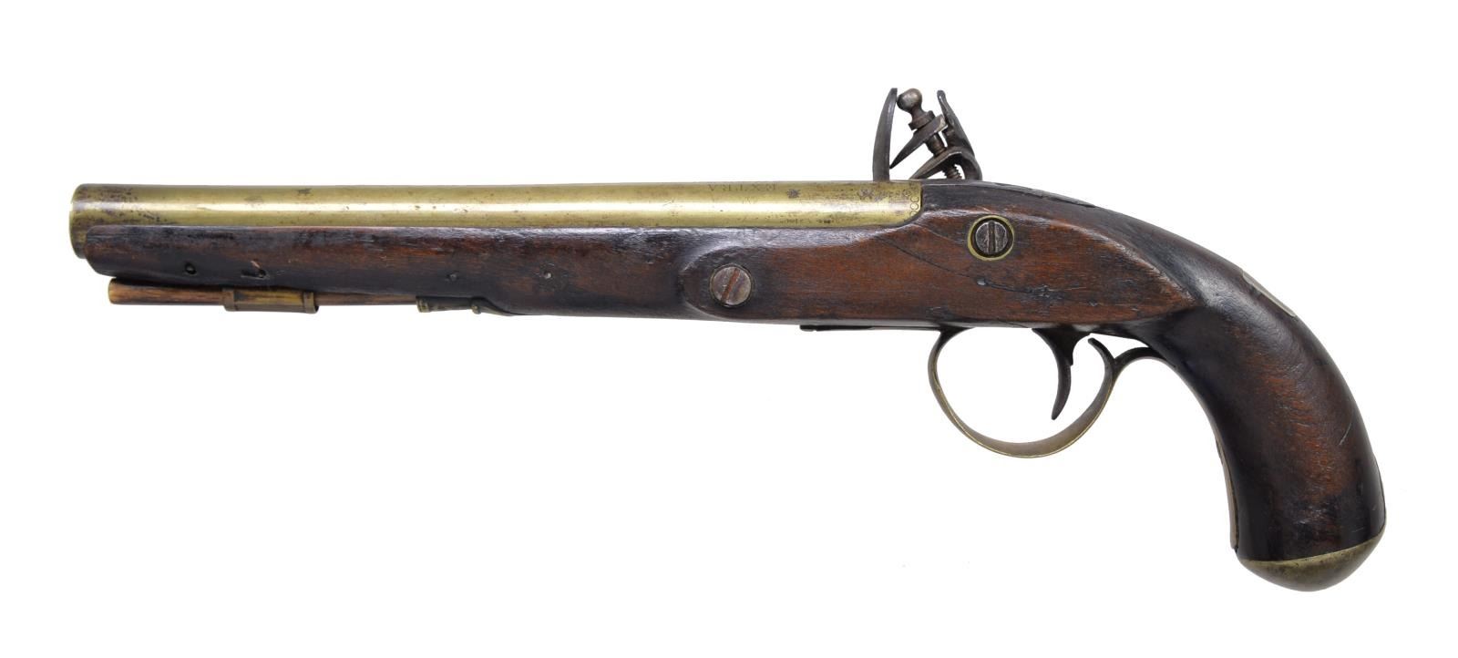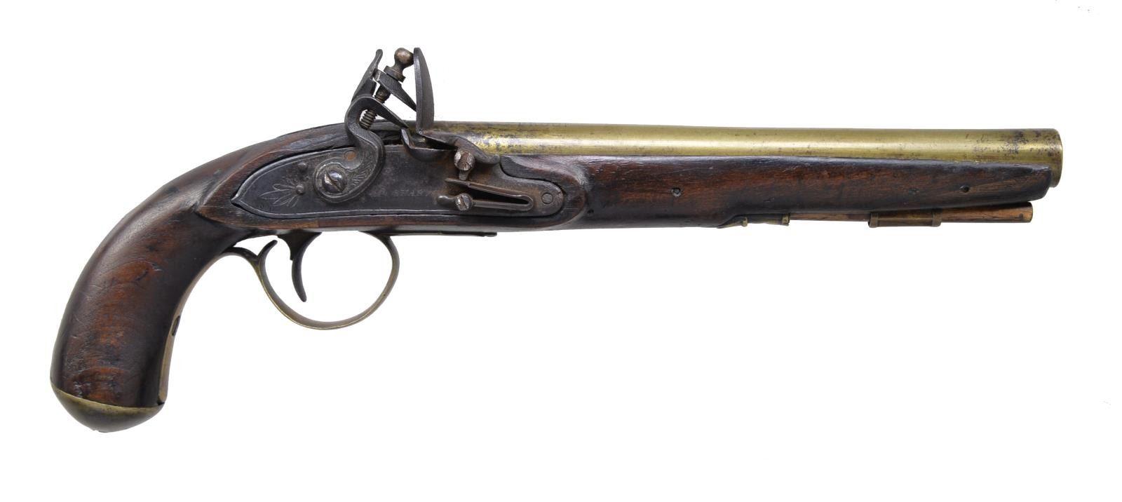 Cal. approx. 54. NSN. Bbl. 9". Brass bbl. engraved on the top, “EXTRA SHARPE PROOF”. There are 2 British proof marks on the left side of the bbl. The end of the breech is decorated w/ stamped circles. Iron bbl. tang w/ engraved decoration. Similarly engraved iron lock & cock. Lock marked, “SHARPE”. Decorated brass trigger guard w/ plain buttplate, entry thimble & ramrod thimble. There is a silver rectangular escutcheon at the wrist. Bbl. is pinned to the stock. CONDITION: brass has a mellow mustard patina. Lock has a dark patina. Lock holds half cock. Stock shows expected wear w/ 2 sm. tight cracks on the left side opposite the lock. There is a sm. pieced repair on the right side of the bbl. channel near the muzzle. Good bore. (01-18167/BF). ANTIQUE. $500-750.