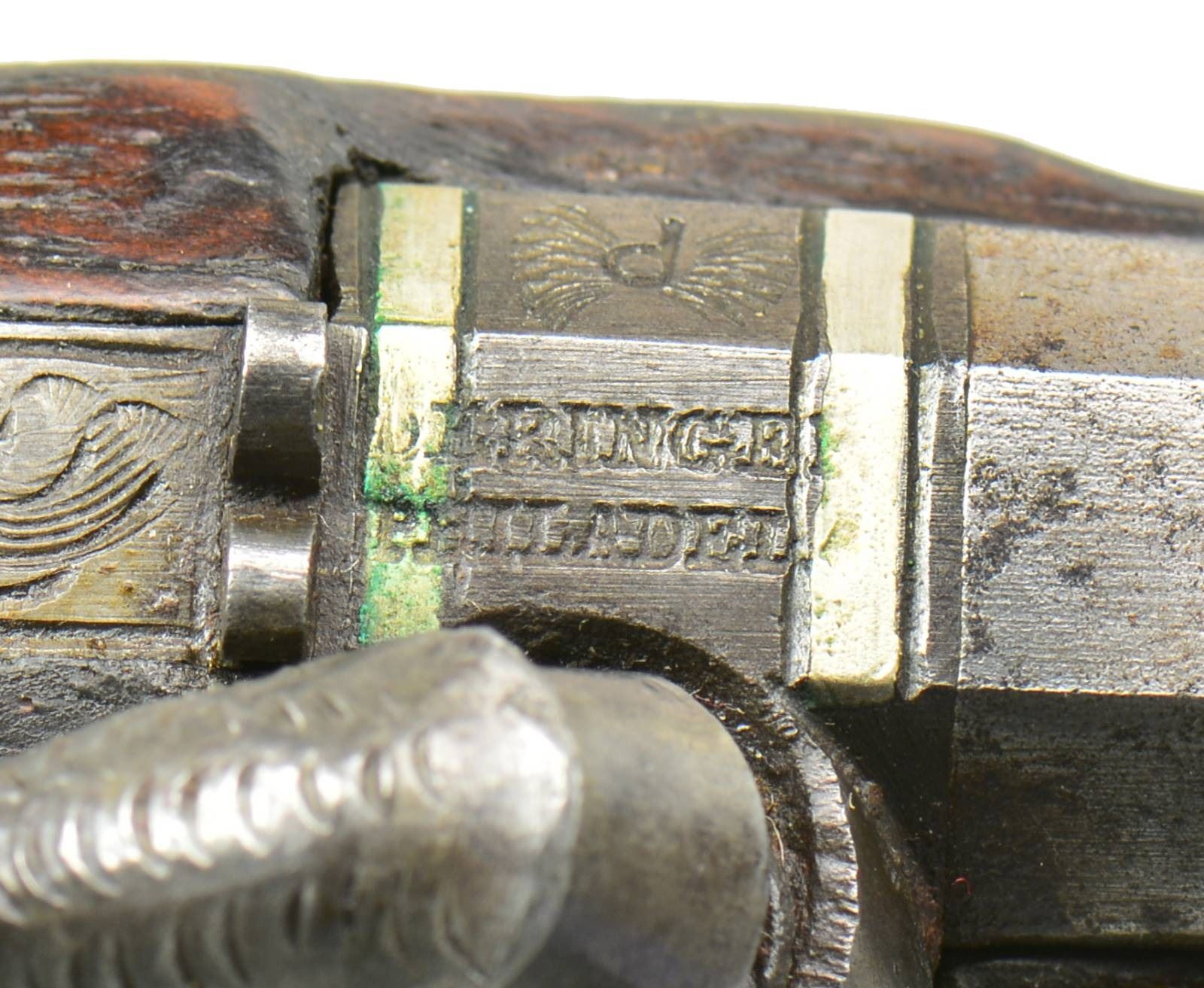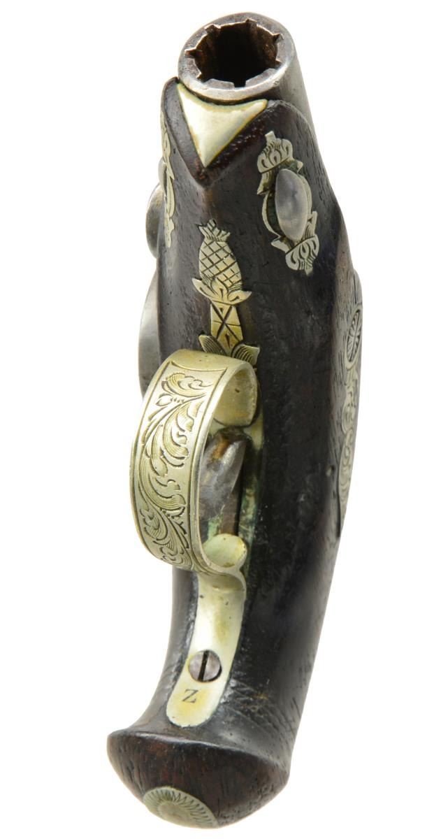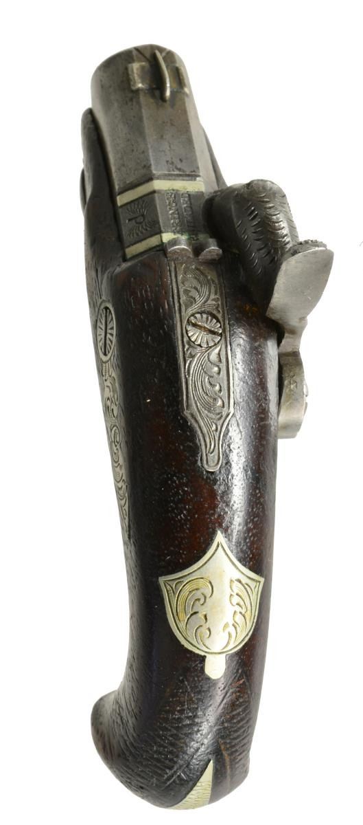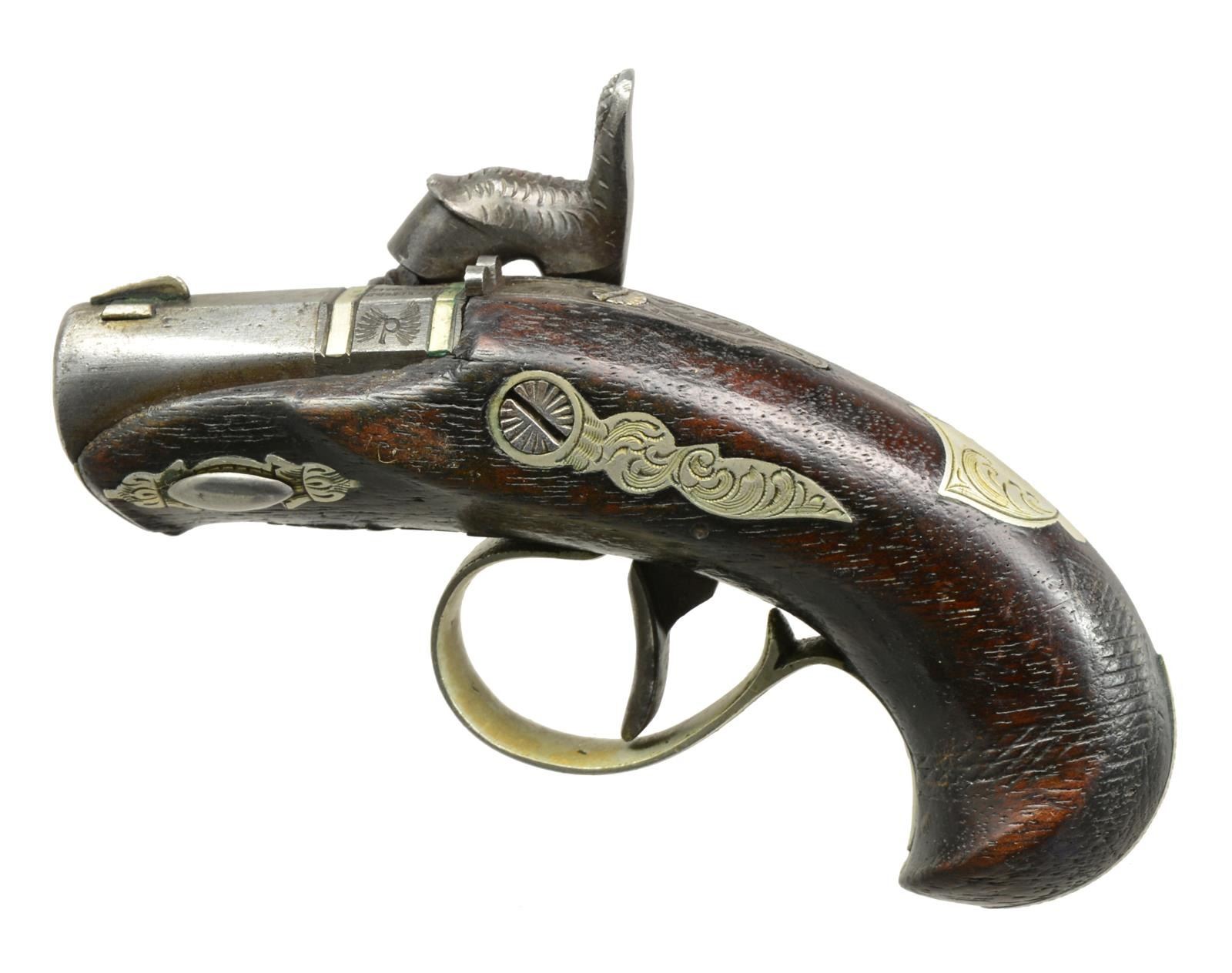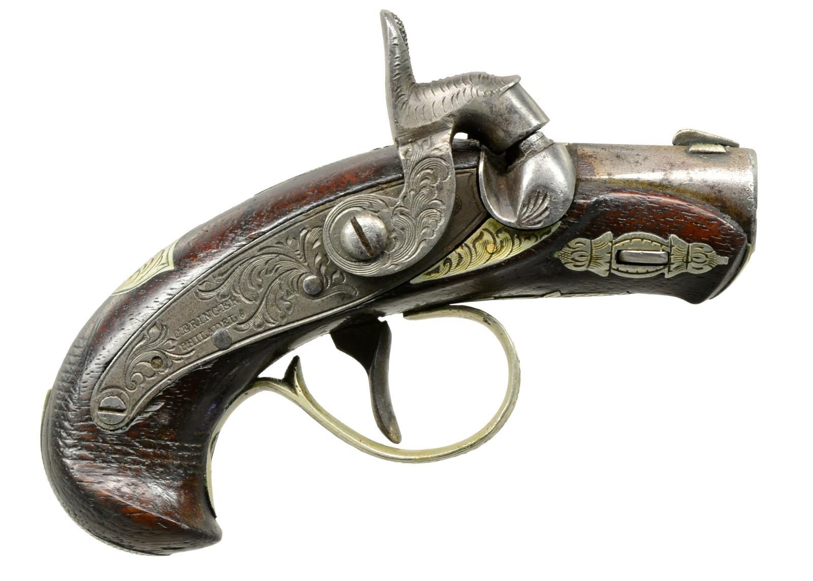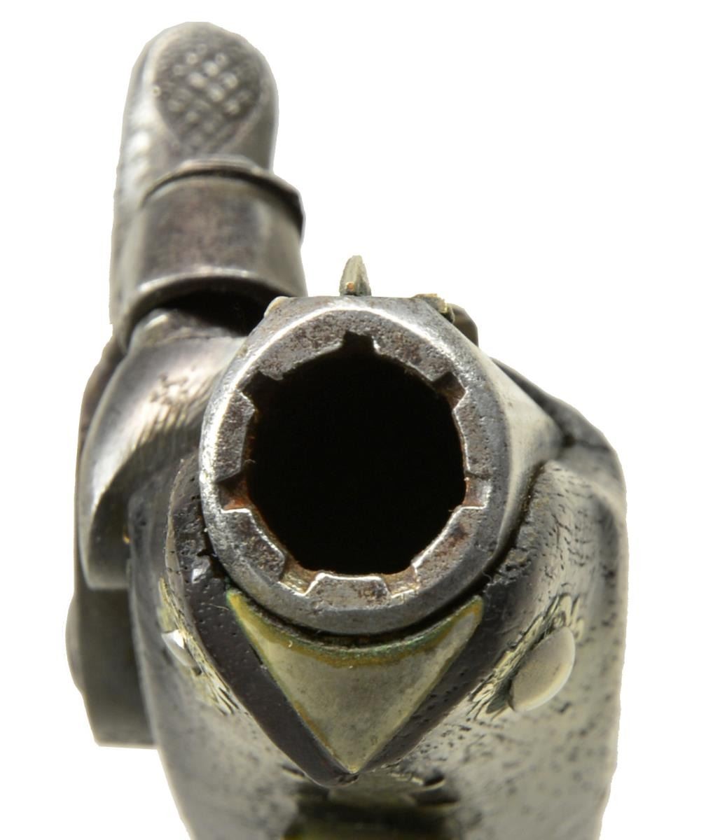 Cal. 36. NSN. 3 31/32" Overall. Bbl. 31/32". This is the 1st example of a Henry Deringer I have cataloged w/ less than a 1 inch bbl. & less than 4 inches overall. This is a classic Henry Deringer w/ German silver engraved mts, engraved breech, lock, hammer & bolster. Rarely are seen these truly diminutive “peanut” sized derringers. CONDITION: very good to fine overall, appears original & complete. PROVENANCE: Richard Kirchoff, 1999. From the Collection of John "Tim" Breth Jr. (01-17742/JS). ANTIQUE. $3,000-4,000.