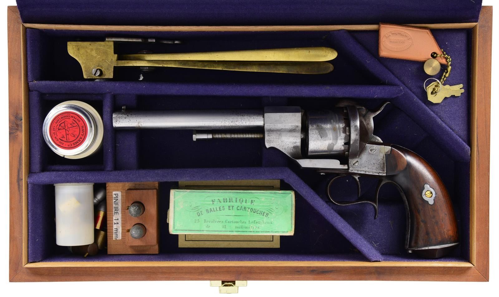 Cal. 12mm Pinfire. S# 8170. Bbl. 6 3/8" rnd. 6 Shot rnd. cyl. Right side of frame is marked "EIBAR". 2 Piece walnut grips. Mfg. under license from Lefaucheux by Orbea Hermanos of Eibar, Spain. UNATTACHED ACCESSORIES: modern display box. Box contains brass 2 cavity bullet mold, wrapped 2 piece box containing 25 - 12mm cartridges, 10 assorted original or repro. 12mm pinfire cartridges along w/ 8 unused brass pinfire cases & components. Also includes 2 case keys & Navy Arms no. 11 percussion caps. CONDITION: metal has areas of bright cleaned appearance showing light pitting blending w/ uncleaned areas showing a brown patina finish. Sanded & refinished grips show wear & handling marks. Right panel is broken next to action w/ improperly fitting wood repair. Bore retains largely intact rifling showing scattered pitting. (01-18195/DS). ANTIQUE. $300-500.