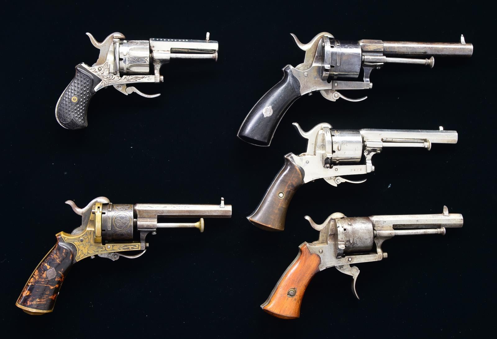 1) Cal. 7.65mm Pinfire. S# 2. Bbl. 3 1/4" oct. w/ replacement blade front sight. 6 Shot rnd. cyl. Iron folding trigger action w/ 2 piece hardwood grips. CONDITION: metal has faded to gray showing light pitting. Grips show light wear & handling marks. Dark bore w/ spots of pitting. Functioning action. (01-18017/DS). 2) BELGIAN PROOFED. Cal. 7.65mm Pinfire. S# 2421. Bbl. 3 5/8" oct. w/ blade front sight. 6 Shot rnd. cyl. Spur trigger action w/ 2 piece hardwood grips. CONDITION: over 95% renickeled finish. Grips show light wear. Dark lightly pitted bore. Good mechanics. (01-18024/DS). 3) GERMAN PROOFED. Cal. 7.65mm Pinfire. NSN. Bbl. 2 1/2" oct. w/ blade sight. 6 Shot fluted cyl. Nickel finished action w/ spur trigger has simple open pattern floral engraving. Ornate hard rubber grips. CONDITION: 80% nickel. Very good grips. Action lacks spring tension. Dark bore. (01-18026/DS). 4) BELGIAN PROOF. Cal. 7.65mm Pinfire. NSN. Bbl. 3 1/2" oct. w/ blade sight. 6 Shot rnd. cyl. Brass action w/ folding trigger & fancy hardwood grips. Action, cyl. & bbl. have floral pattern hand engraving. Left inside of grip marked "RDW". CONDITION: bbl. & cyl. have faded to brown patina. Brass frame has mild mustard patina appearance. Grips show wear & handling marks. Bore retains good rifling w/ signs of pitting. Good mechanics. (01-18046/DS). 5) Cal. 9mm Pinfire. NSN. Bbl. 4 1/8" rnd. w/ oct. shank & bead front sight. 6 Shot rnd. cyl. Folding trigger. Blue finish. 2 Piece ebony grips. CONDITION: 60% blue showing areas of fading. Grips show light wear. Bright bore w/ strong rifling. Sound mechanics. (01-18128/DS). ALL ANTIQUE. $750-1,250.