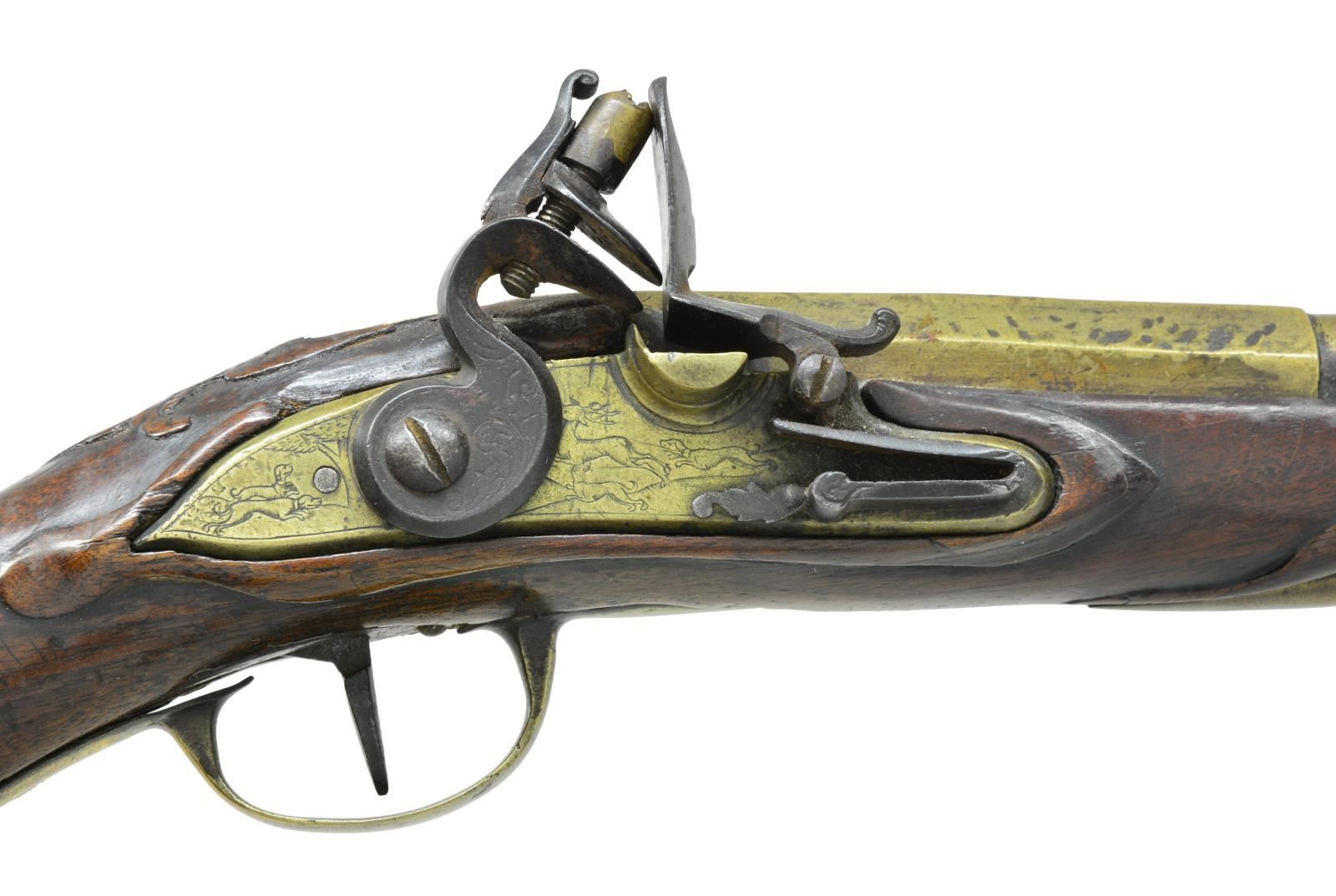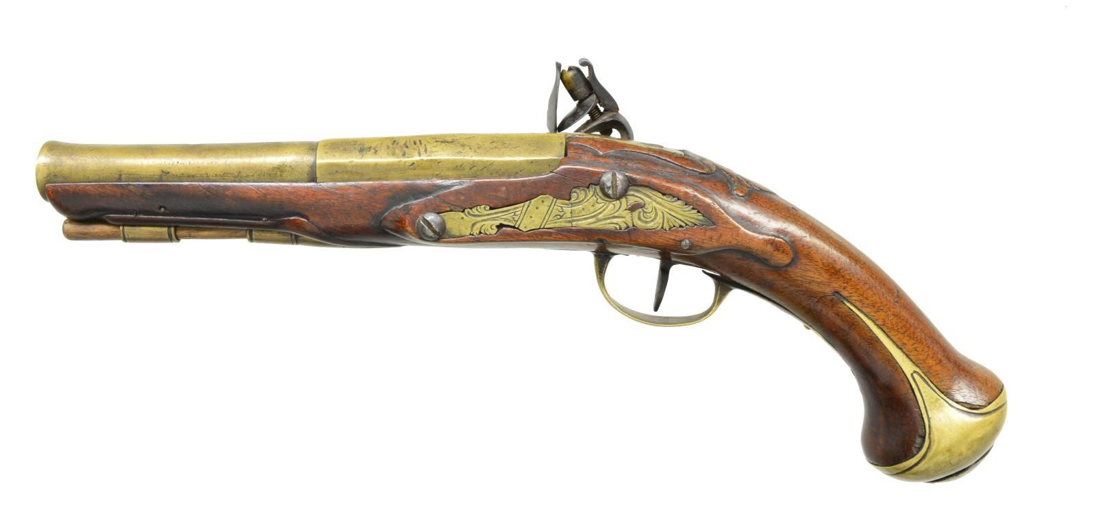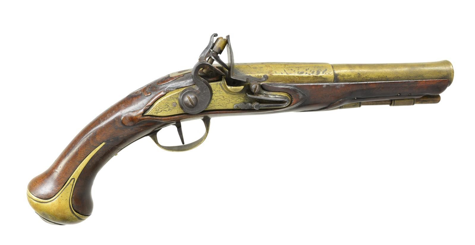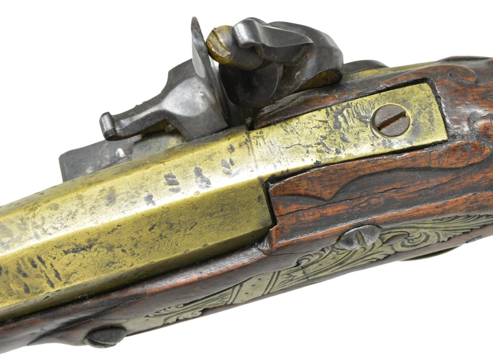 FLINTLOCK HOLSTER PISTOL. Cal. 42. NSN. 12 1/2" Overall. Bbl. 6 3/4" 2 stage oct. to rnd. tapered brass w/ flared muzzle & rarely seen brass tang. The only iron on this pistol is the trigger, trigger plate, cock, frizzen, frizzen spring, lock screws & internal lock mechanism. This is a beautiful pre-Revolutionary War flintlock w/ rarely seen brass lock. Lockplate is finely engraved w/ hunting seen of dogs chasing deer. Stock has good color w/ moldings. CONDITION: very good overall, all original & matching w/ exception of replaced top jaw screw. Brass has medium mustard patina. Vertical crack in center of engraved & pierced sideplate. Cock, trigger assembly, frizzen & frizzen spring have dark uniform iron patina. Stock is well fit w/ minor chipping & one sm. hairline opposite lock, hand worn patina. Mechanically fine w/ smooth clear bore. PROVENANCE: From the Collection of John "Tim" Breth Jr. (01-17776/JS). ANTIQUE. $1,500-2,000.