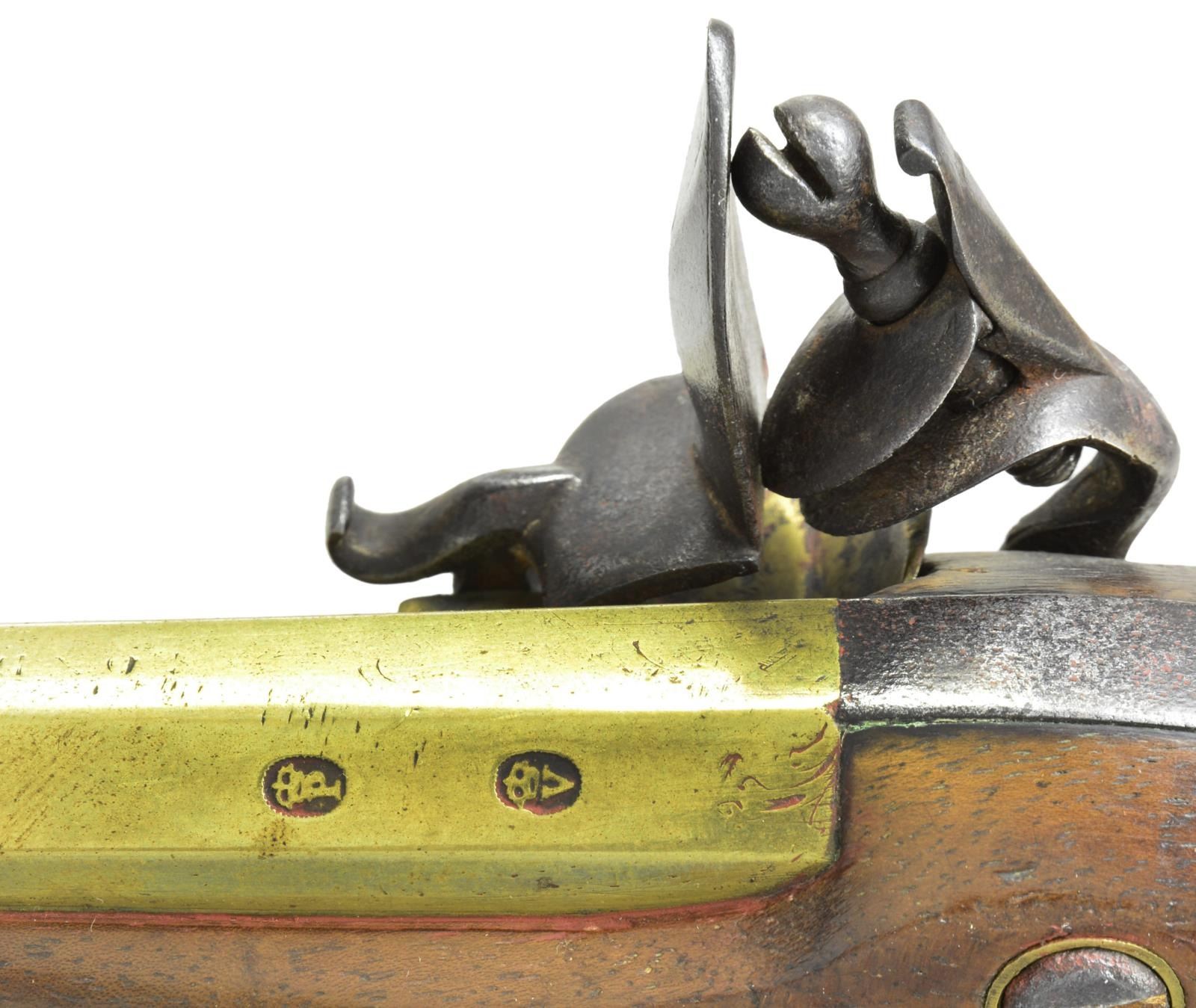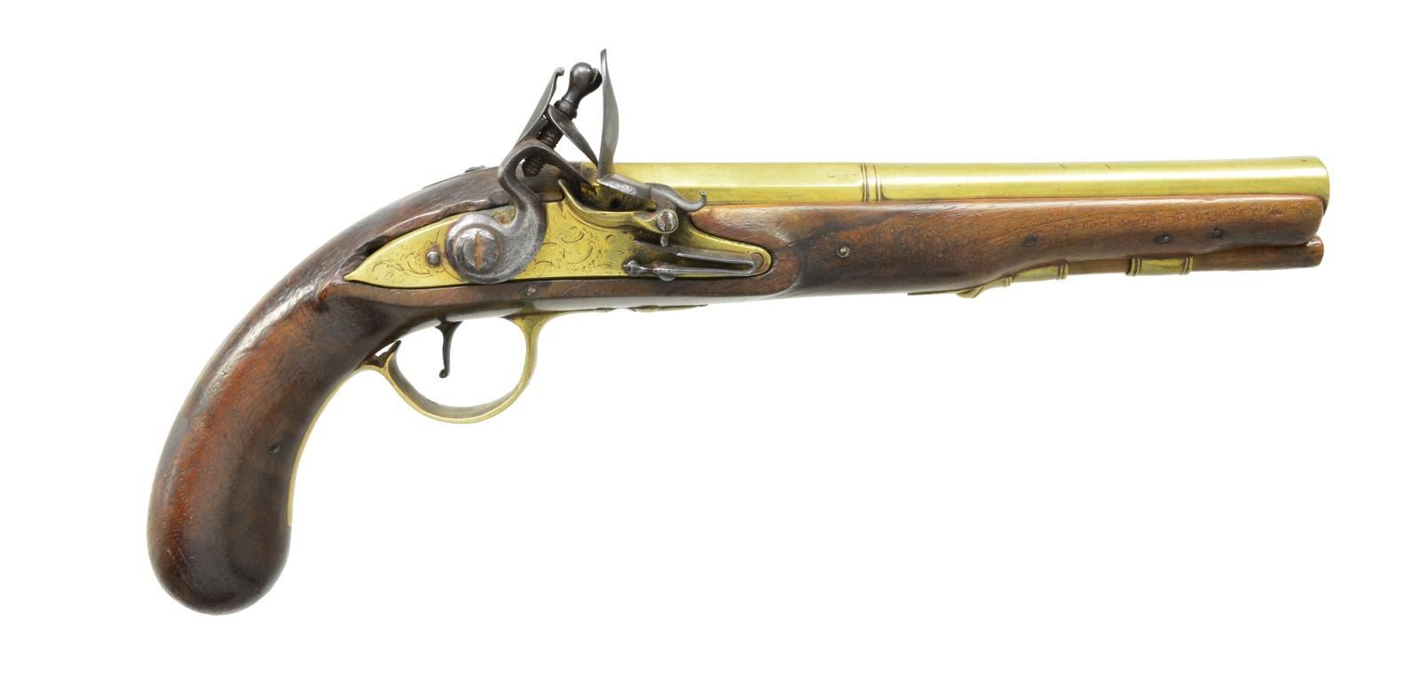 FLINTLOCK HOLSTER PISTOL. Cal. 60. NSN. 13" Overall. Bbl. 8 1/4" 2 stage oct. to rnd. tapered brass w/ flared muzzle, “LONDON” marked on top flat is barely discernible, commercial London proofs on left breech, brass lock has worn engraved design. Pistol appears restocked which would not be uncommon especially in America for even well worn but usable parts from this prewar pistol. CONDITION: very good overall, appears all original w/ professional wood restoration around lock & wrist. Brass has light mustard patina, iron has mottled dark gray patina w/ pitting. Mechanically sound w/ clean smoothbore. PROVENANCE: From the Collection of John "Tim" Breth Jr. (01-17777/JS). ANTIQUE. $1,200-1,500.