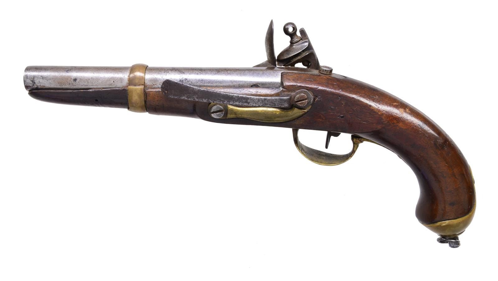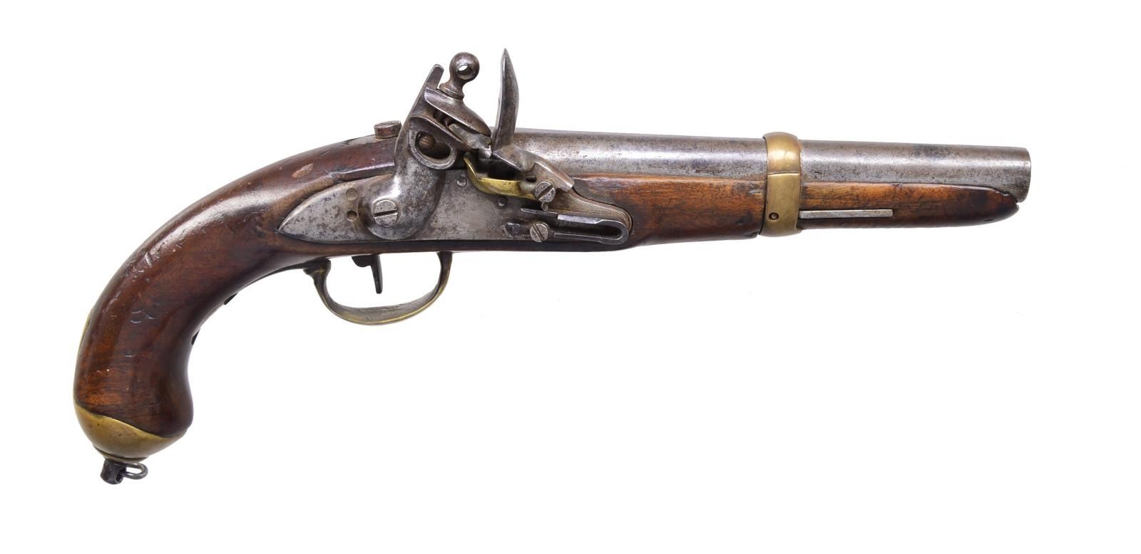 PISTOL. Cal. approx. 70. NSN. Bbl. 7 7/8". Bbl. & lock are unmarked. Brass pan, trigger guard, buttcap w/ lanyard ring, side plate & bbl. band. Iron belt hook attached at top side plate screw. CONDITION: iron has a medium gray patina. Brass has a pleasing mustard patina. Stock has expected dents & dings but no noticeable damage. Lock holds both full & half cock. (01-18166/BF). ANTIQUE. $700-900.