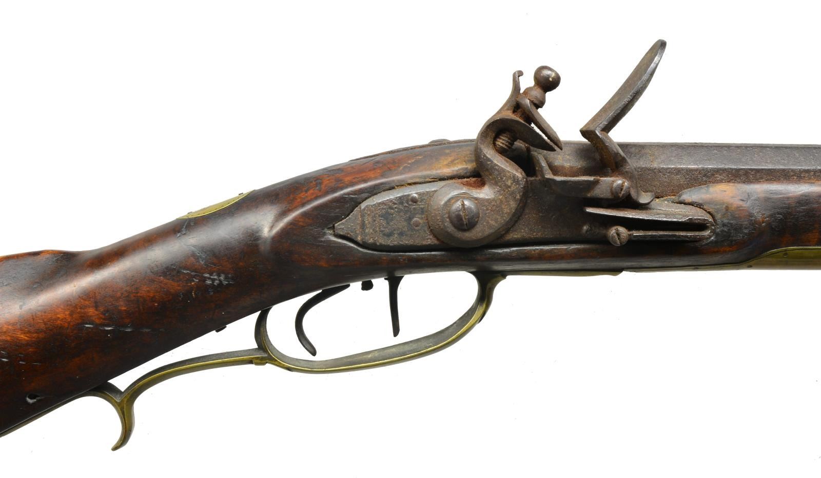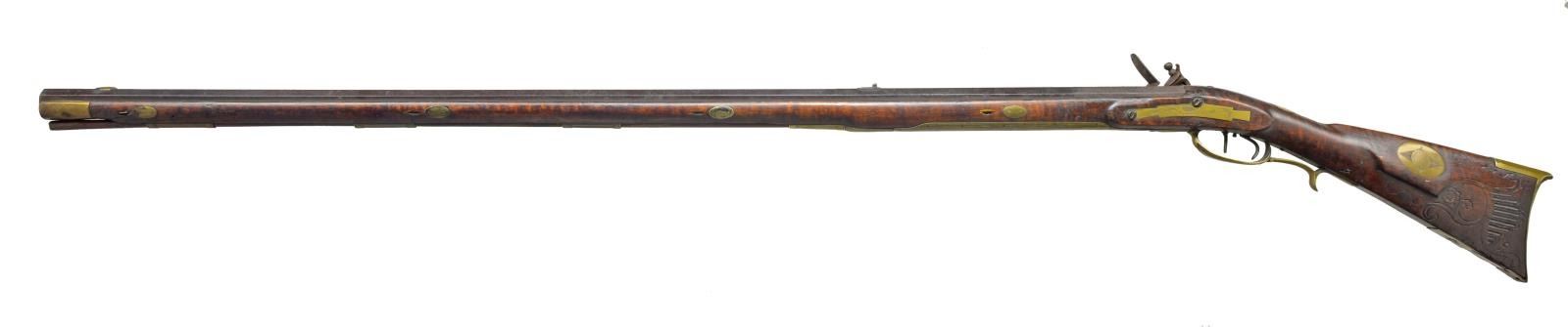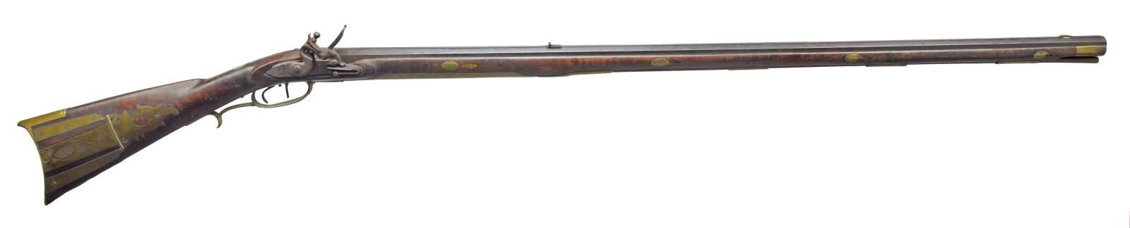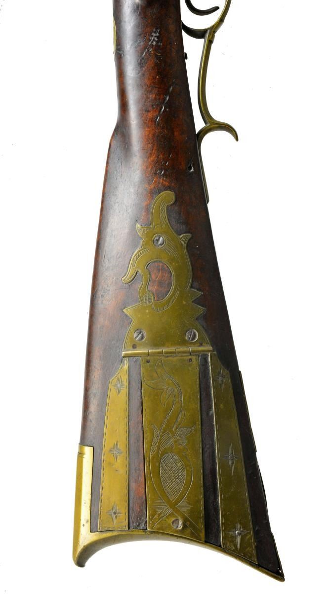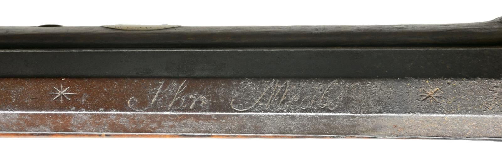 FLINTLOCK RIFLE, EX-KINDIG COLLECTION, CIRCA 1830. Cal. .48. NSN. 60” Overall, 44.5” oct. rifled bbl. signed in script “John Meals” between 2 engraved stars. Fixed notch rear sight & inset brass blade front sight. This rifle is pictured & described in "Kentucky Rifle Patchboxes & Barrel Marks" by Roy Chandler 1971. (page 267, figure 511) John Meals (1789-1852) is listed in 1820 census as manufacturer in Menallen, Adams County, Pennsylvania w/ 6 workers including himself. He is listed just before his death in the 1850 census as a gunsmith also in Adams County. Kindig states “I believe he worked about 1825 & later even though he used a number of details from an earlier period. His work definitely represents the Golden Age of Kentucky rifle making. John Meals was a good workman, especially for the period. He made charming patch boxes, all of them different. He apparently was a gunsmith who did not repeat his designs.” No two rifles by John Meals are alike; he was extremely creative w/ his designs. Rifle features curly maple stock w/ distinct incised C-scroll terminated in 8-petal flower w/ crosshatching in its center. Kindig points out “There is one little detail repeated in his engraving & also in his carving: a little leaf like design containing crosshatching or parallel lines in the crotches of the vine like details that generally end in C-scrolls.” Rifle is brass mounted w/ 4 piece pierced patch box w/ crosshatched engraved design, sideplate engraved en suite, large brass oval engraved w/ 4-pointed star on cheekpiece, engraved brass oval thumb plate, 8 inset engraved brass escutcheons rear of each keyway on fore stock, large brass pinned plate is found between trigger guard & ramrod thimble w/ no wood exposed in this area. Toe plate has central oval hiding patch box door release button. This may not be the finest Meals rifle made, but it may be the most unmolested & in beautiful attic condition. CONDITION: very good overall, original flint, complete & original, bbl. & lock have dark iron patina w/ pitting around breech, signature is crisp. Brass has a medium patina. Toe plate is missing small pin at rear that mates w/ buttplate. Stock is sound, well fit, hand worn patina, small areas of erosion especially forward of frizzen, one small age crack on left side of forestock just rear of nosecap. Mechanically functional including set triggers, uncleaned dirty rifled bore. (01-18499/JS). ANTIQUE. $10,000-20,000.