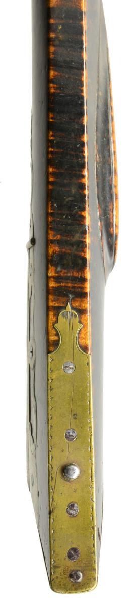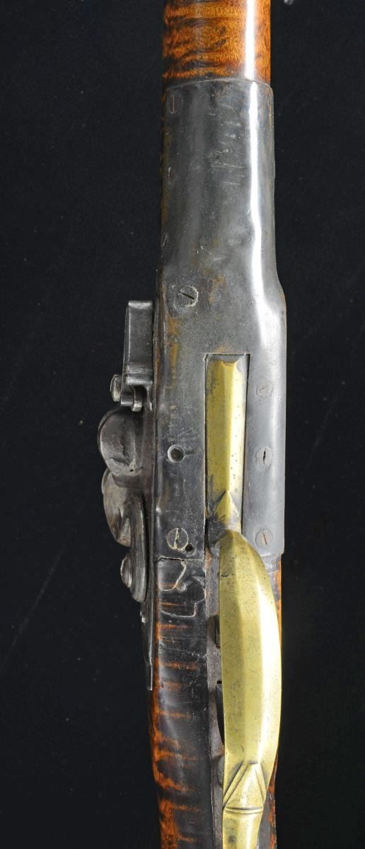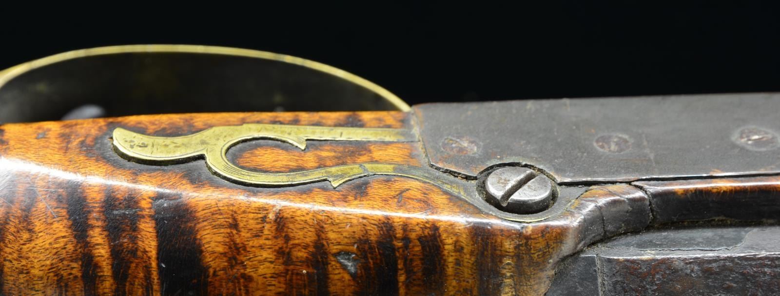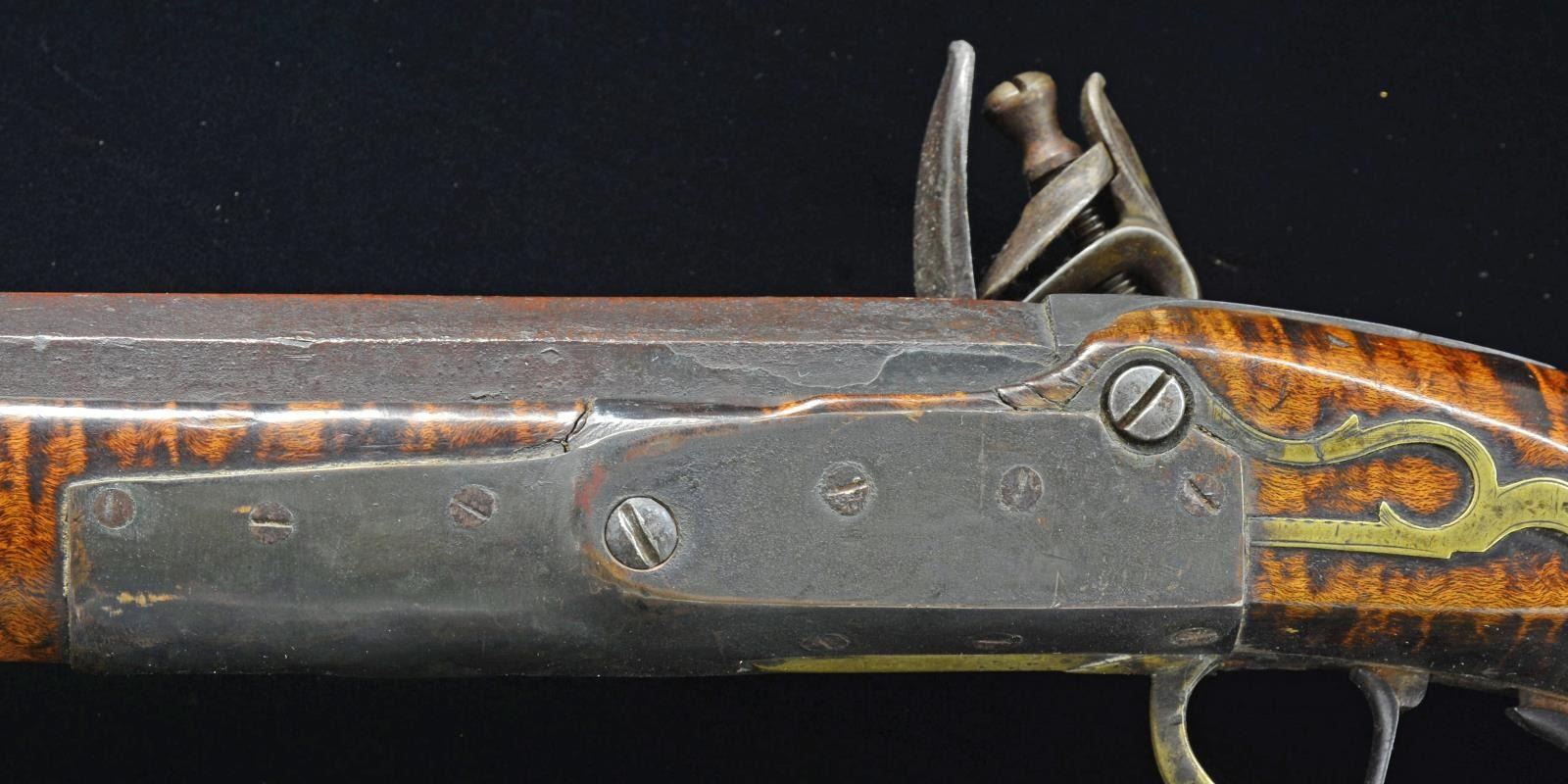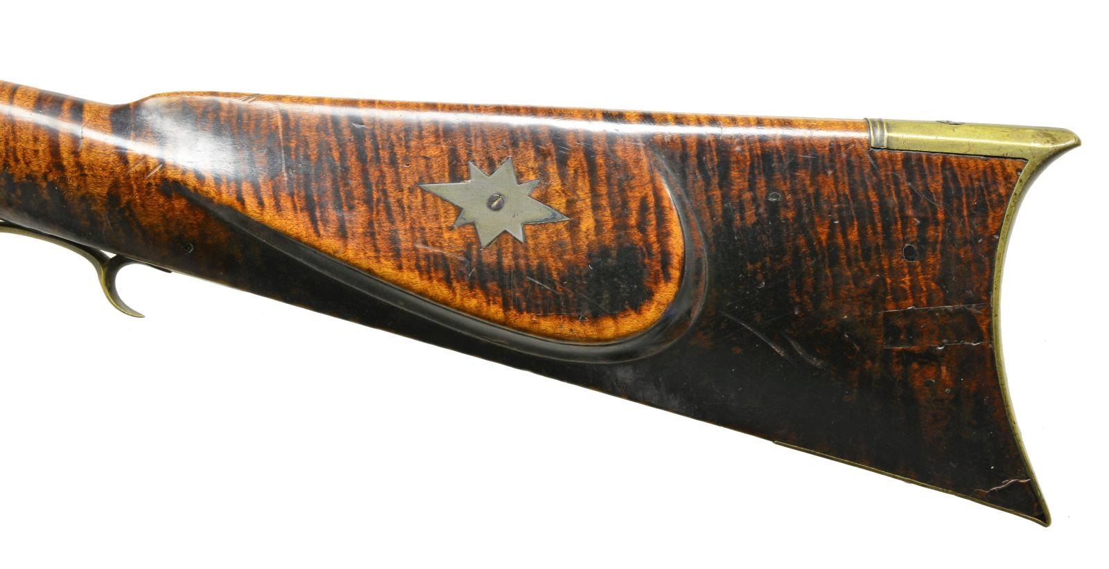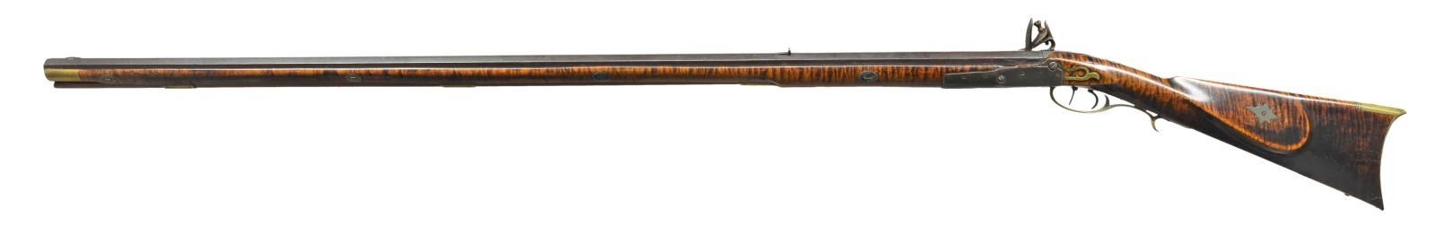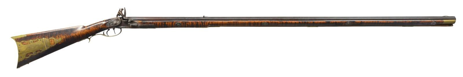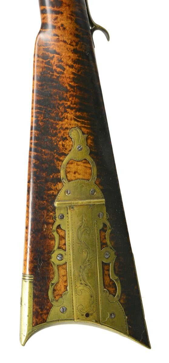 RIFLE. Cal. ???. NSN. 61 3/4" Overall. Bbl. 45" oct. w/ silver front blade sight, fixed iron rear sight signed in script “A McGILVRAY”. Alexander McGilvray worked in Harrisburg, Virginia 1820-1825. This is an attractive example, brass mounted, w/ silver hunting star in cheekpiece & void silver oval thumbplate, 8 keyway escutcheons are also silver, 4 piece pierced & engraved patch box. There is a clever well executed 5" x 2 1/2" sheet copper & screw repair to stock forward of trigger guard that is heavily patinaed today. CONDITION: very good overall, appears to be original flint, though cock & frizzen spring are replaced. Lock & bbl. have dark iron patina, brass has medium mustard patina, copper sheeting repair has olive/chocolate colored patina. Stock has hand worn patina retaining some of its original dark finish in protected areas. PROVENANCE: Eagle Museum, Strasburg Pennsylvania. From the Collection of John "Tim" Breth Jr. (01-17782/JS). ANTIQUE. $2,000-3,000.