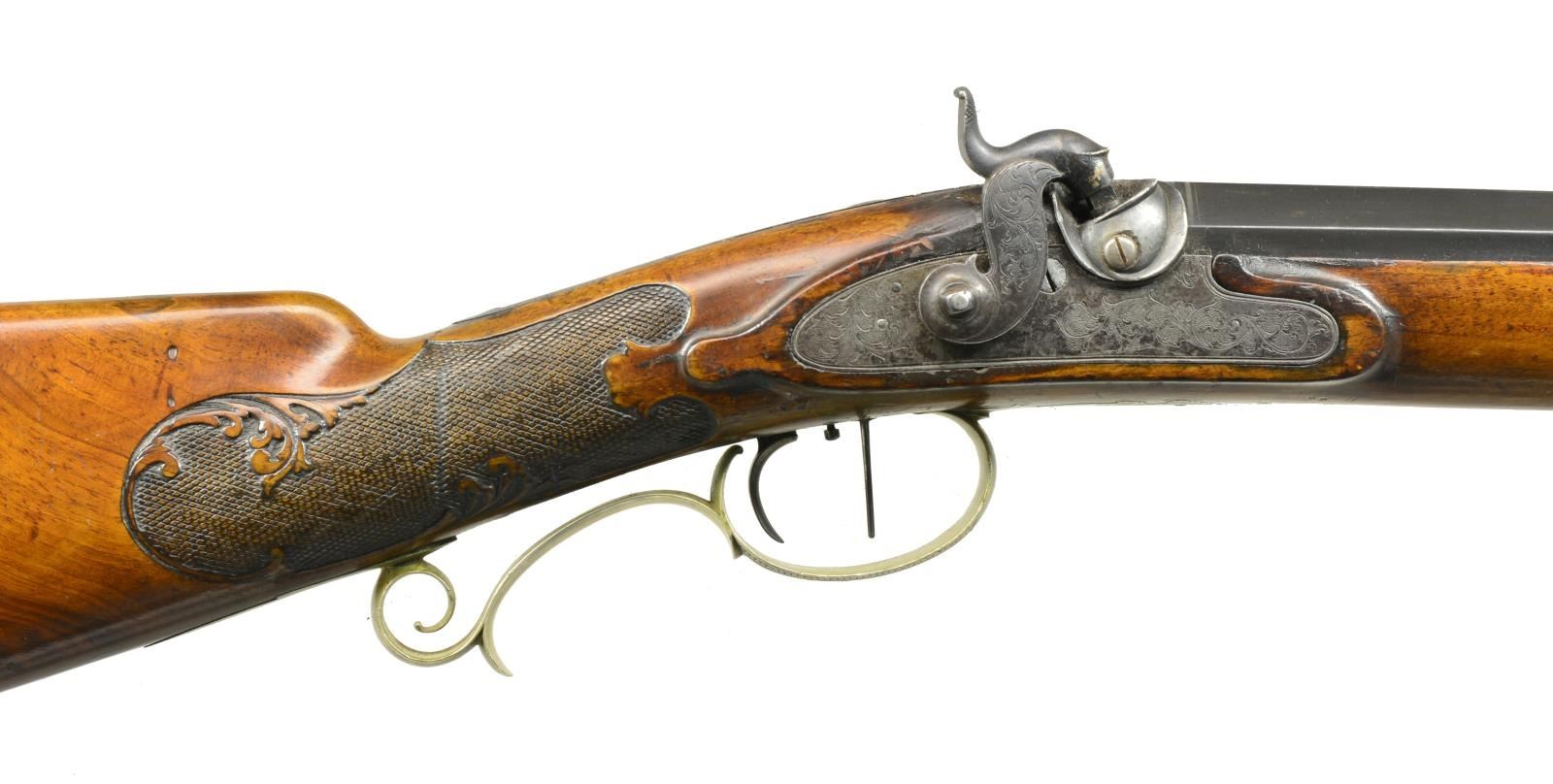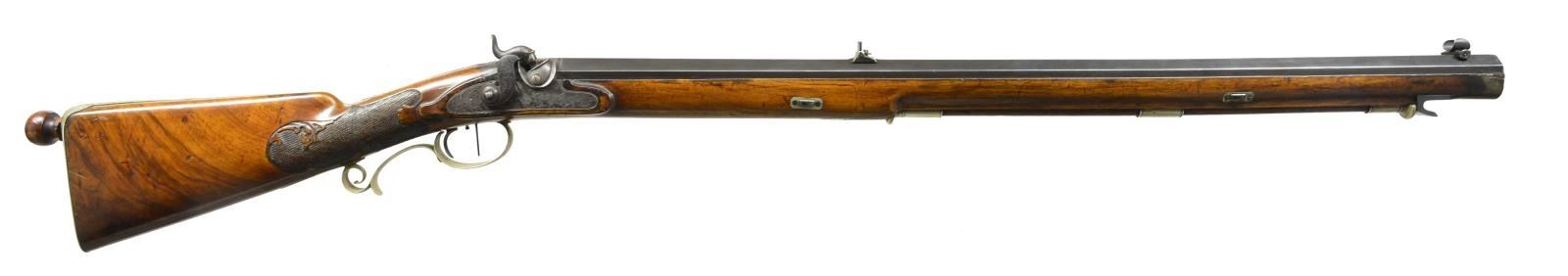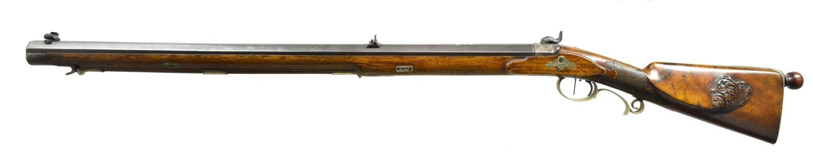 BREUER OF WEISSENBERG. Cal. 60. NSN. Bbl. 35 1/2" Heavy octagonal, appears to have been realigned & is now approx. 60 caliber (.620 grooved diameter). Bbl. measures 1.41" across flats at muzzle & 1.55" at breech end. Bbl. is sighted w/ elevation adj. deep U notch rear & windage adj. post front. Maker's name is inlaid in silver on rear top flat. Patent breech & breech iron are nicely scroll engraved & letter "R" is inlaid in silver on tang. Lock & hammer are engraved w/ matching shaded scroll. Triggers are double set. European walnut stock is German silver mounted, extends to muzzle w/ horn cap & has a broad iron hook at muzzle end for bench resting block. False ramrod is in German silver pipes. Trigger guard has scrolled grip & is engraved en suite w/ lock. German silver buttplate has hole at heel to receive bullet starting rod. Right hand shadow line cheekpiece is relief carved w/ acanthus scroll. Checkering at grip is flat topped w/ fancy borders w/ carved scroll intrusions. Weight is 18 lbs. CONDITION: good, bbl. reblued, other iron parts mottled gray patina. Wood w/ old oil refinish w/ numerous dents & marks is sound. Checkering worn, German silver hardware has been lightly cleaned. Bore is lightly pitted w/ strong rifling. Lock & triggers work. An interesting high quality rifle. (01-18079/MGM13). ANTIQUE. $1,250-2,000.