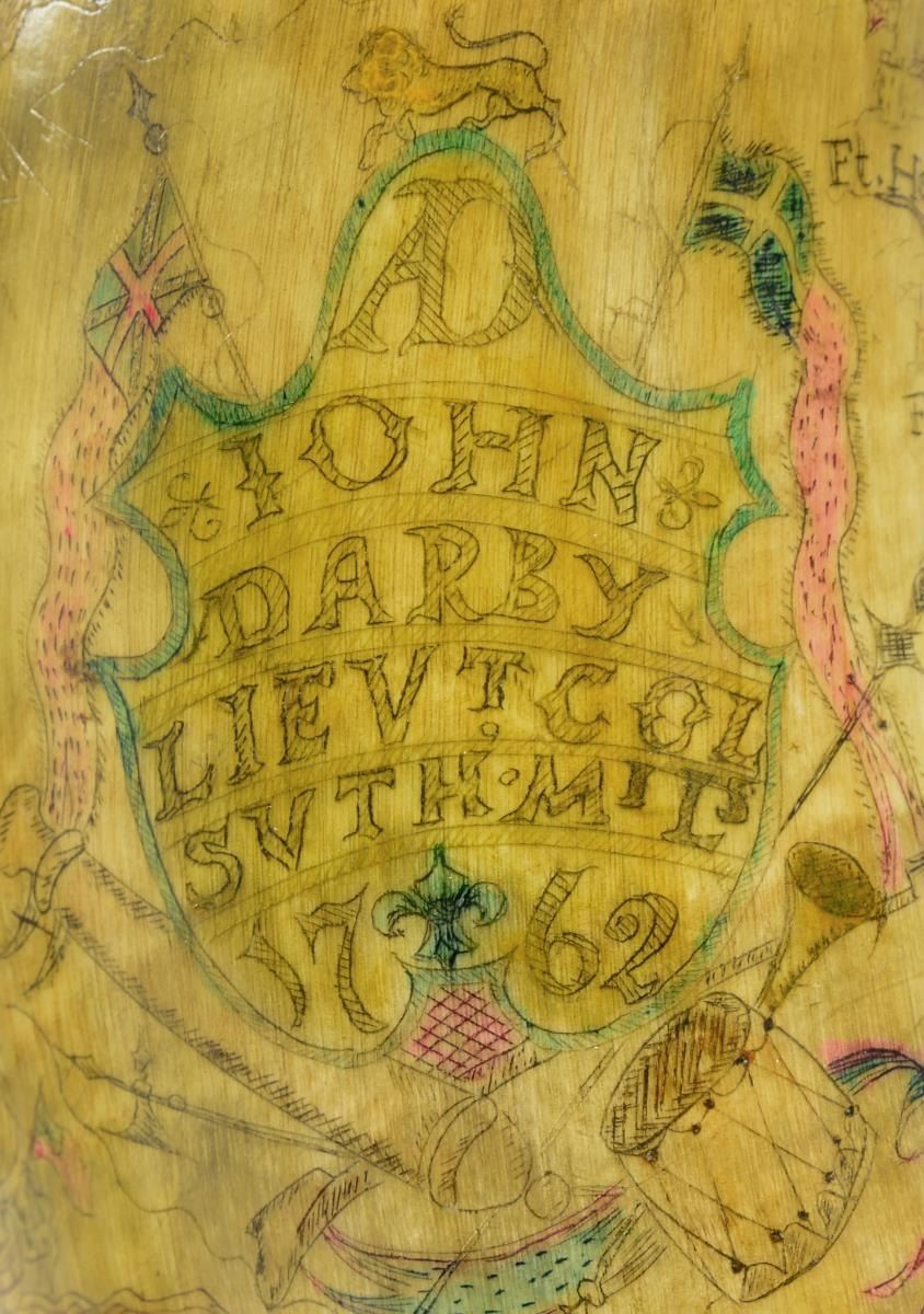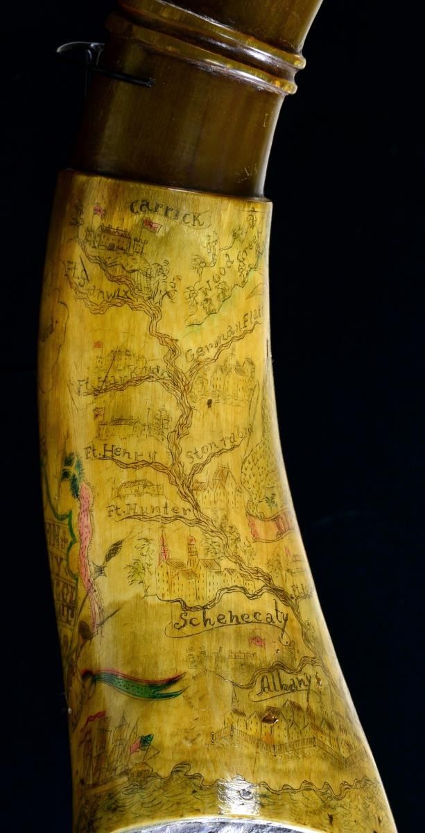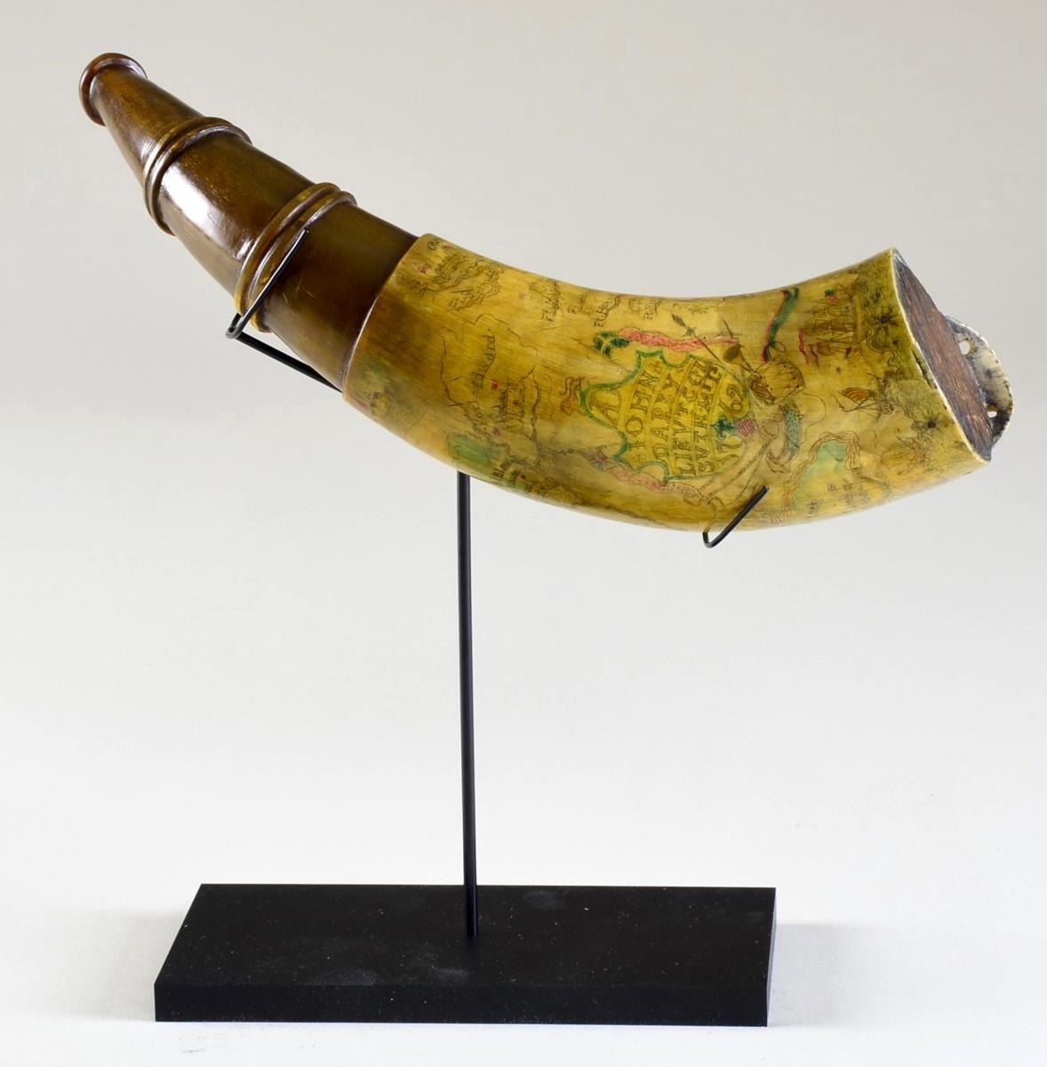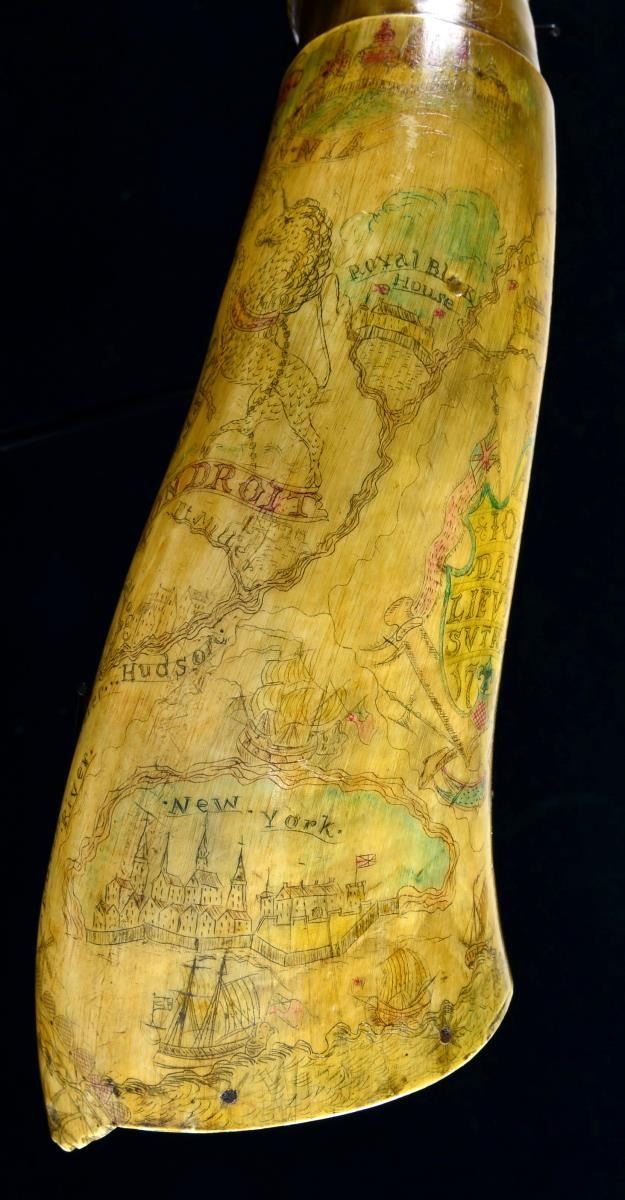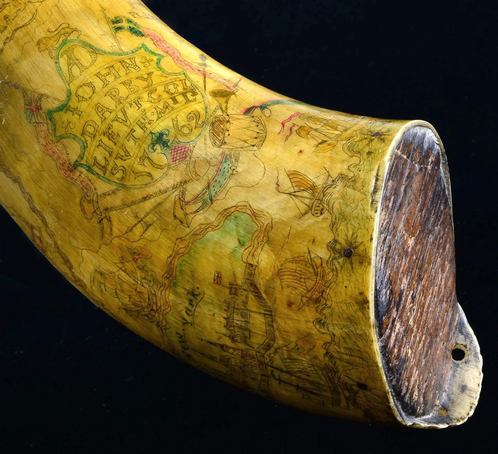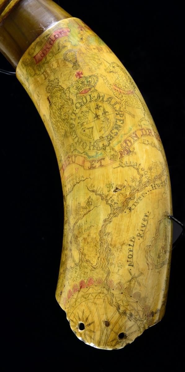 This exact horn is pictured in John Dumont’s American Engraved Powder Horns, 1978. 12” overall. This professionally carved horn has superior artistic detail and addition of colors & fine surface make this a remarkable piece of historic art. The central panel of shield: “JOHN / DARBY /LIEUt COL / AD 1762” above a panoply of arms, British flags, lion. New York City is shown w/ ships in the harbor w/ British flags, all the normal cities along the rivers, Albany, Schenectady and Half Moon Tavern, and the various forts, many with interesting dialectic spellings. A large British coat of arms is topped with a vignette of London with ribbon reading “BRITANIA”. “Carrick” signed at the top is thought to be name of the professional carver of this horn. John Darby was a career British officer like his father & his son. He entered service with the 17th Regiment of Foot as a Captain in November of 1748. He became Major to the regiment in 1756 landing in Halifax with Col. John Forbes. He became Lieutenant Colonel in 1759, retiring in 1775. John Darby thus commanded the regiment for much of the Seven Years War, Pontiac’s Rebellion, and for its peacetime postings until the eve of the American Revolution. His father, John Darby, had served the Duke of Marlborough for over 36 years retiring as a Major. His son, William John Darby, also a career military officer who served throughout the Revolutionary War, was captured at Cowpens, later exchanged & returned to England in 1783. There are differing opinions as to the age of this horn. It may not be contemporary to the date on the horn. REFERENCE: pictured page 55, plate 72 John Dumont, America Engraved Powder Horns, 1978. UNATTACHED ACCESSORIES: scan copy of book excerpt. CONDITION: very good overall as cleaned, good discernible scrimshaw with faded colors, few small insect holes, retains lanyard holes in lobed extension. Plug has old age crack. PROVENANCE: Ex-Wester A. White Collection; Ex-Donald Handrick Collection. From the Collection of John "Tim" Breth Jr. (02-13786/JS). $12,000-15,000.