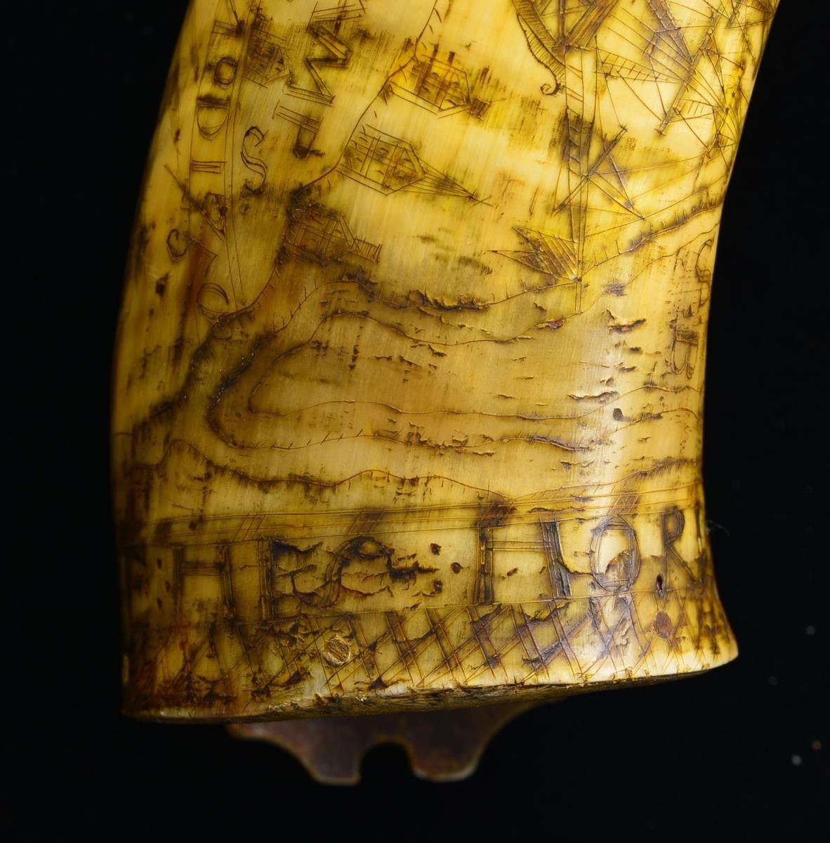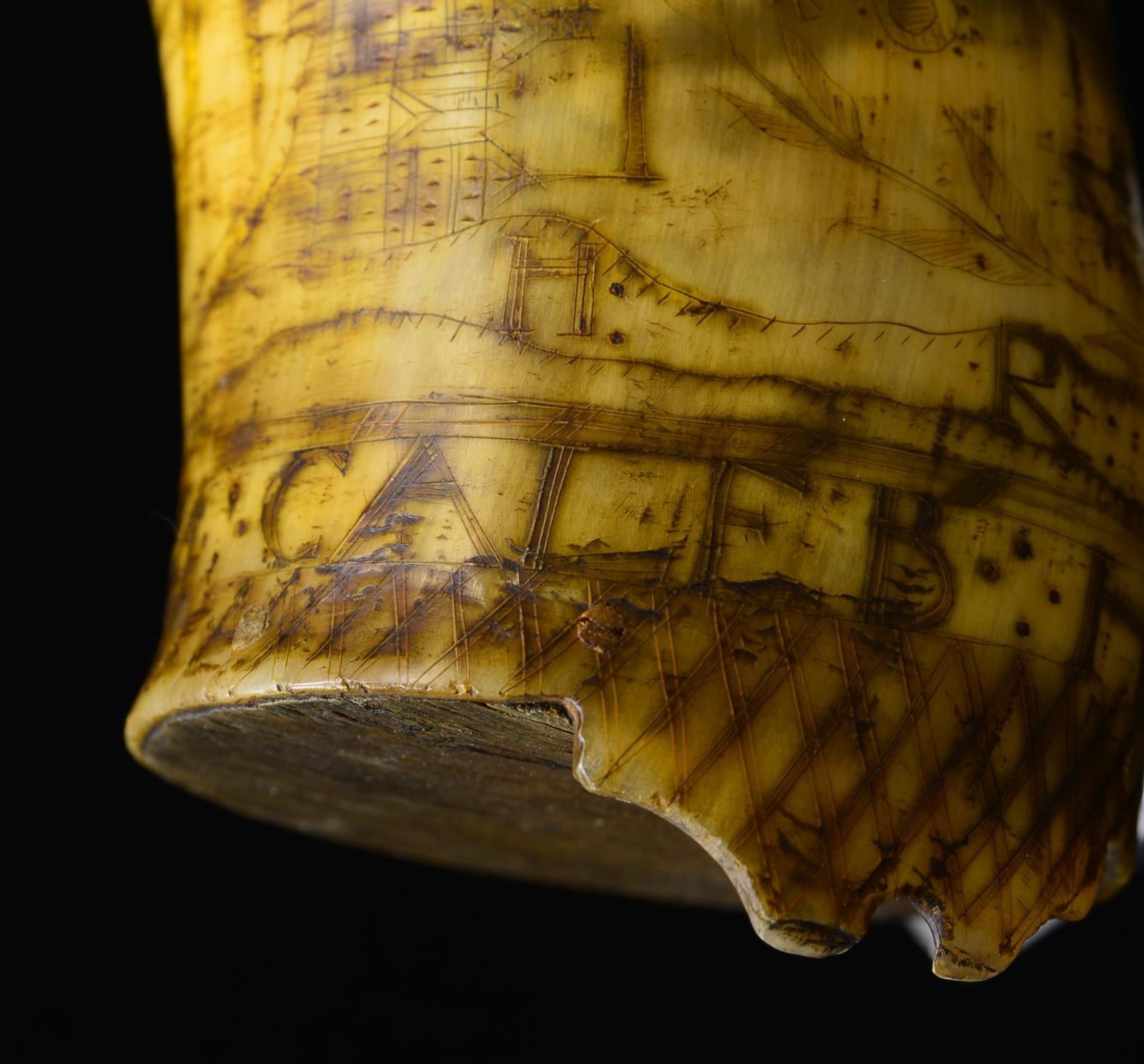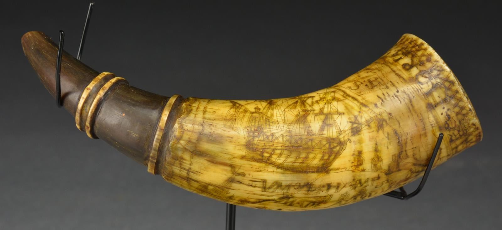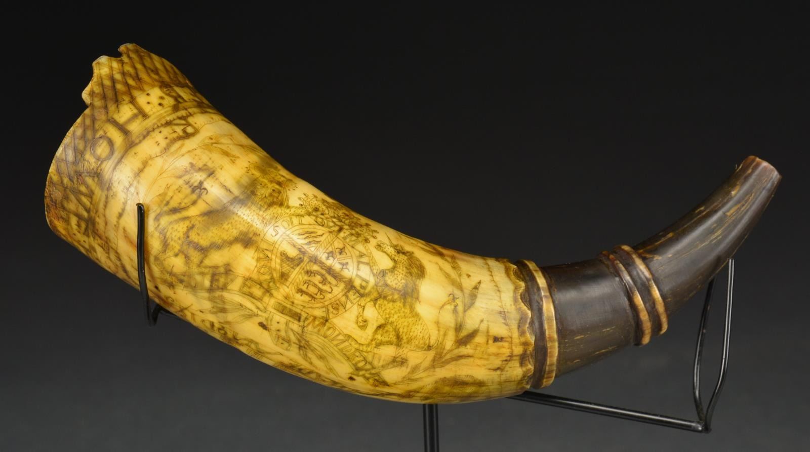 Small 8 1/2" pistol or priming horn carved around perimeter of base “CALEB HOWE HIS HORN” & below a sailing ship w/ British flag: “VMo N. HAMPS”. A lg. well carved British coat of arms, a row of houses & initials “F. B”, “H. R”, L. G.”, “H”, & S.B.” complete the scrimshaw design filling virtually all the usable surface. Crosshatched design is found on bottom border & notched drapery motif at top, 3 carved rings on spout. Caleb Howe born December 31, 1723, Framingham, Mass, was killed by Indians June 28, 1755, Hinsdale, New Hampshire. Caleb Howe was a veteran of the 1st French & Indian wars in the 1740s. In 1750, the date of this horn, Caleb & his family lived in Fort Sawtell & he worked as Constable. CONDITION: good to very good overall, well patinaed surface w/ minor reductions & wear, lobed extension at base is broken at the hole for lanyard. Residual color can be seen in traces where once polychromed. PROVENANCE: From the Collection of John "Tim" Breth Jr. (02-13785/JS). $3,000-5,000.