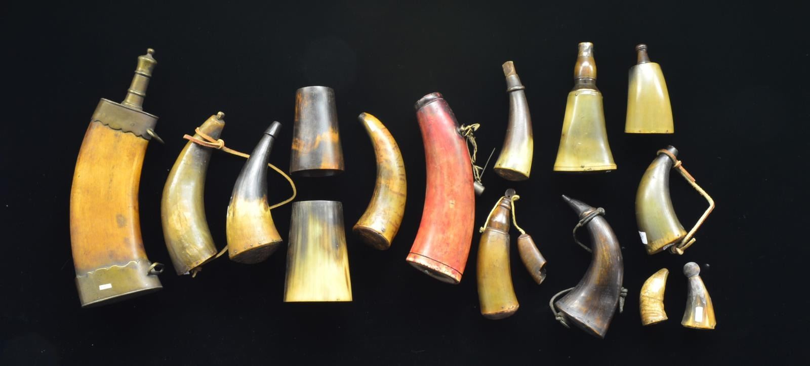 1) Heavy brass mounted flattened powder horn, European w/ screw off brass charger, intertwined initials applied on one side. 2) “SALT HORN”. Cow horn plugged on top end w/ ivory plug w/ central hole for filling & 8 sm. holes for “shaking”. Unknown vintage. 3) 2" carved horn bottle or priming horn w/ wood plug. 4) 2 1/2" sm. priming horn. 5) 3" horn bottle, or priming horn skillfully made w/ horn plugs & carved horn spout. 6) 4" translucent horn bottle w/ 2 piece screw on carved horn top. 7) 4" horn cup. 8) 3 1/1" horn cup. 9) 5" sm. pistol powder horn w/ light circular decoration, carved wood plug & carved horn powder measure attached by string. 10) 5 1/2" powder horn w/ lg. wood plug. 11) 5 1/2" green powder horn. 12) 6 1/2" sm. powder horn, brass stud on wood base & original wood plug for spout. 13) 7 1/2" powder horn w/ carved wood plug in spelt. 14) 7" contemporary scrimshaw powder horn “John Huffnagel / SIXth PENNa REGt / COMny of CAP J. MAUSER / IN THE YEAR 1778 A.D.”. 15) Bag w/ several loose accessories, 3 wooden plugs for horns, carved horn measure, sm. carved wood spoon. CONDITION: good to very good overall. PROVENANCE: From the Collection of John "Tim" Breth Jr. (02-13800; 02-13814, 02-13841/JS). $700-900.