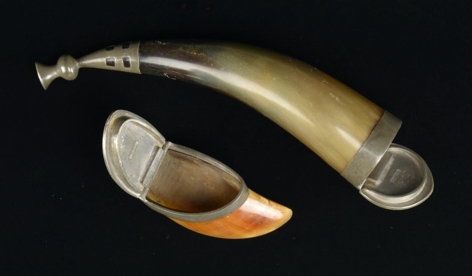 Interesting pair of "DURIE" marked snuff boxes made from a horn & hoof with pewter furniture. Peter Durie, Aberdeen trademark indicating the late 19th century. CONDITION: overall very good with some minor handling marks. (02-14025) $200-300.
