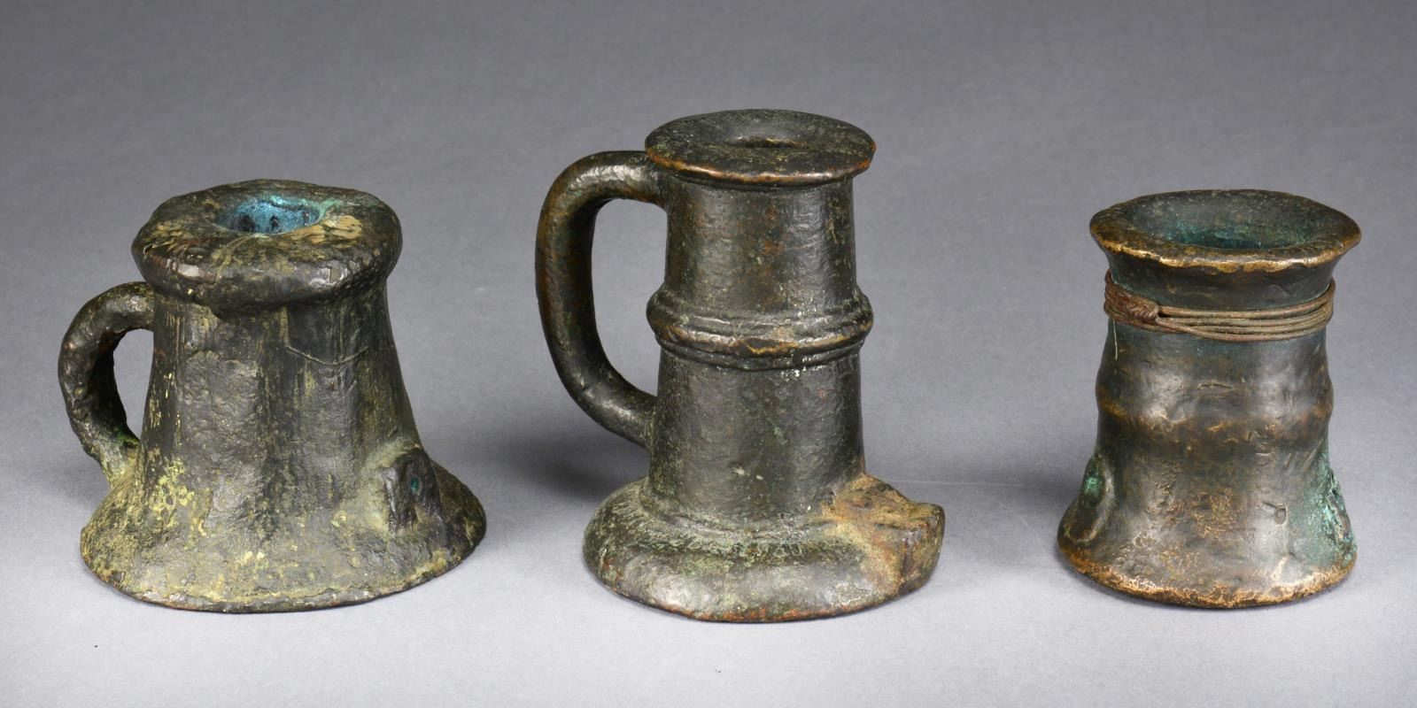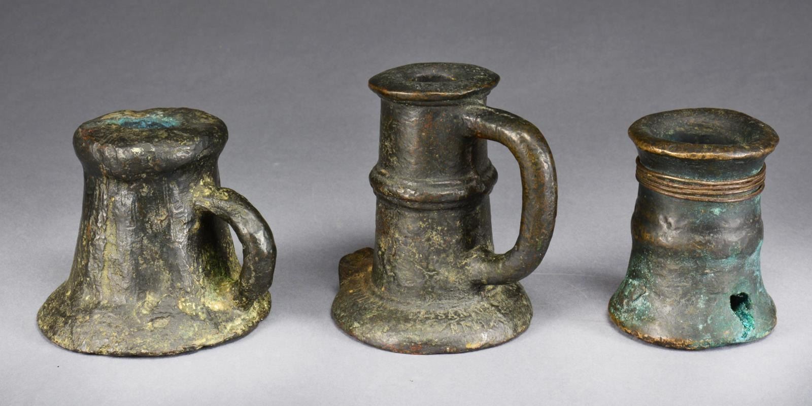 These heavy cast brass or bronze cannons were used for signaling purposes & to test the viability of gun powder. They were commonly referred to as “thunder mugs”. 1) 5 1/4” tall x 5 1/2” wide w/ a carrying handle. There is illegible cast in writing around the base. 2) 4 1/4" tall x 3 1/2" wide w/ no handle. 3) 4 1/4" tall x 5 1/2" wide w/ a carrying handle. CONDITION: all 3 show heavy use & great age w/ an ancient dark patina. #1 Appears to have a blocked touch hole. #2 Has a partially blown out touch hole. #3 Has an intact touch hole. PROVENANCE: From the Collection of John "Tim" Breth Jr. (02-13820/BF). $500-800