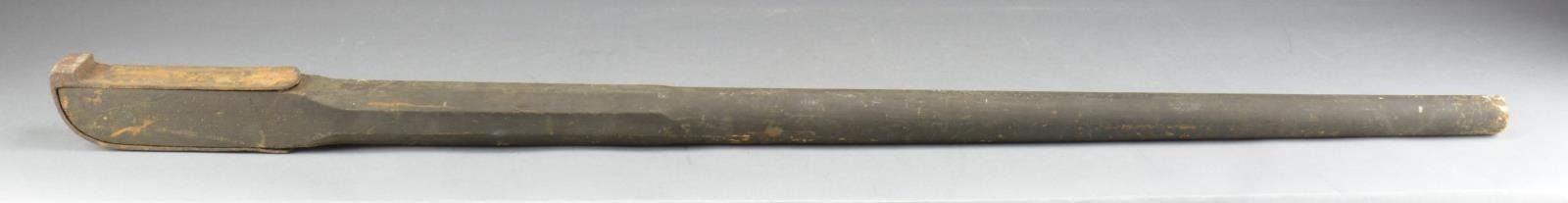 Overall length: 62 1/2". Width is 3" at the base. The artillery hand spike was used to adjust the horizontal aiming of a cannon. This example has a heavy wooden painted shaft chamfered toward the end. There is a heavy iron fitting at the base approx. 10" long attached on each side w/ 3 heavy iron nails. CONDITION: there is minor chipping at the end of the handle. Paint is 95%+ intact. Iron base shows a dark oxidized patina. (02-14238/BF). $400-600.