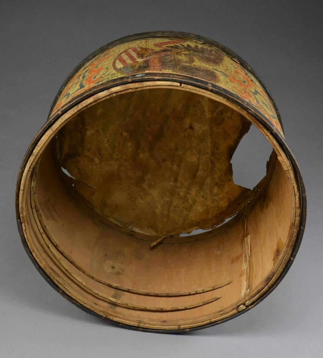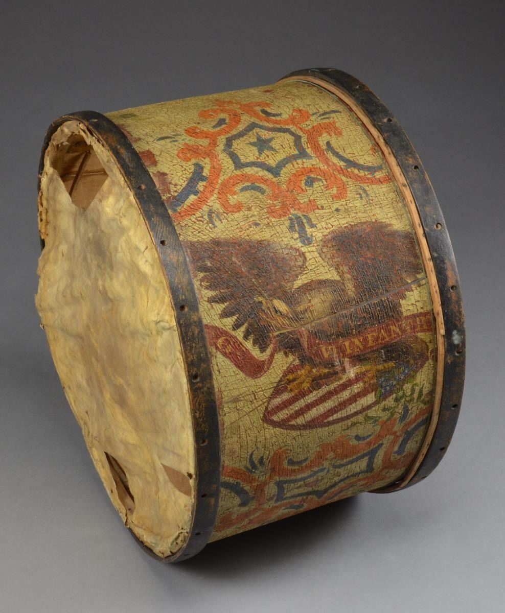 A spectacular example of a paint decorated base drum likely from Vermont, featuring a lg. profile view of a spread wing American eagle atop a federal shield w/ a red ribbon that appears to read, “REGT VT, INFANTRY”. Medium blue & orange flourished decorations are located above & below the polychromatic eagle. All decoration appears on a painted white field. Rims are painted black. Drum measures approx. 18 1/2" high & 28 1/2" in diameter. CONDITION: painted finish shows significant craquelure. 1 Partial head is intact, the other is missing. Both rims are complete & undamaged. The body of the drum has one 11" drying crack & one 17" drying crack. There are no ropes or tighteners. The drum may be slightly cut down. (02-14379/BF). $400-700.