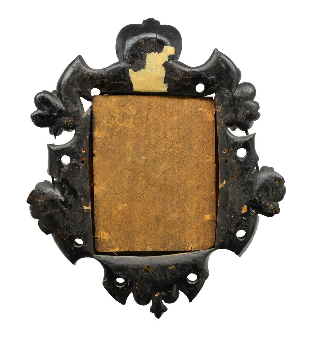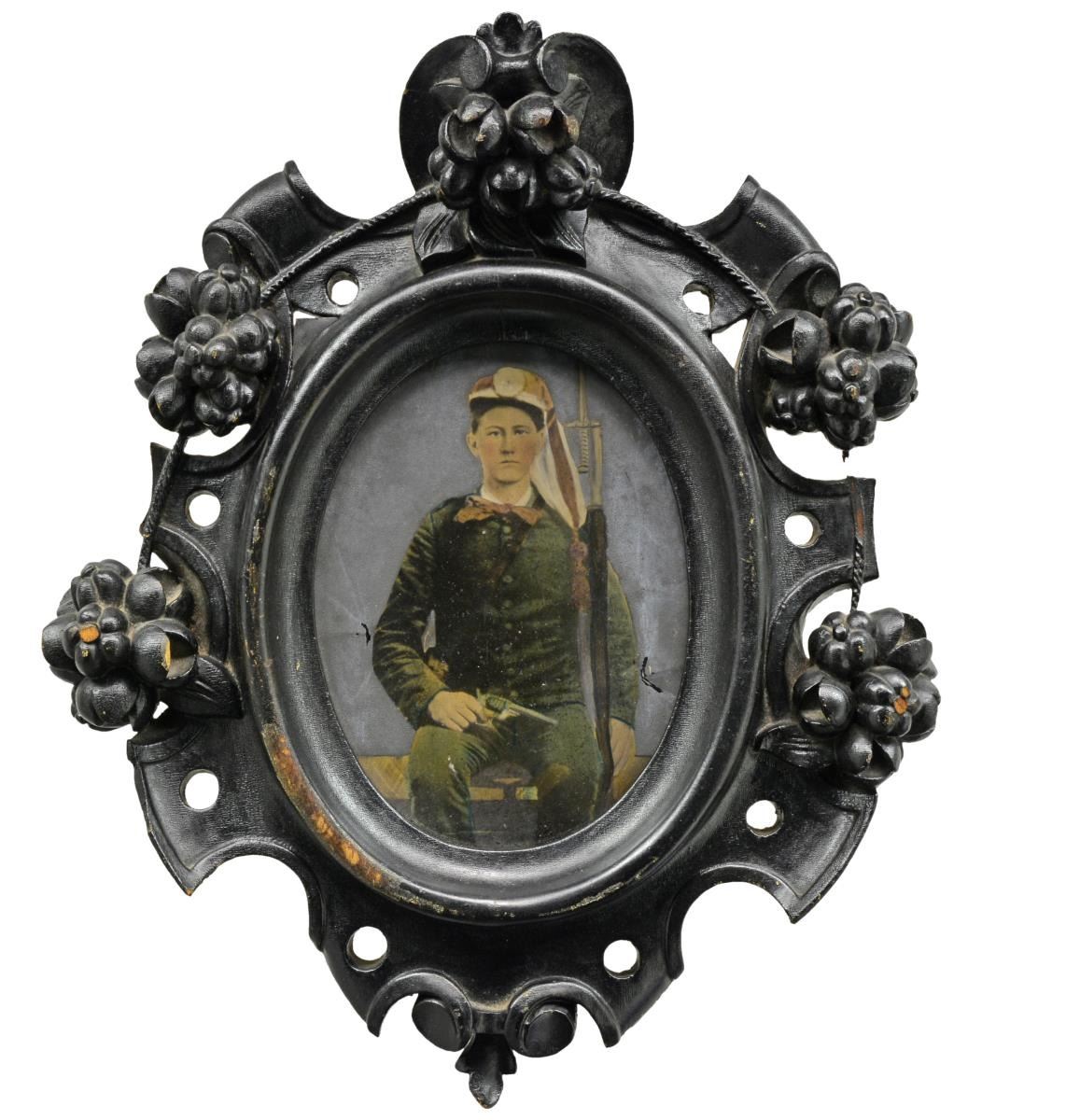 8” x 6” Oval tinted tintype in ornate carved wood frame which measures about 17” x 14” shows seated young soldier w/ rifle & saber bayonet holding a revolver & wearing a canteen on sling over shoulder. His uniform is tinted green, his long red & white fez has red tassel. CONDITION: good to very good overall, image has several light creases & a couple chips. Surface of image has light abrasions; details to face are very good. Carved wood frame retains much of its black paint w/ some chipping & scuffs to high points. (02-13585/JS). $800-1,200.