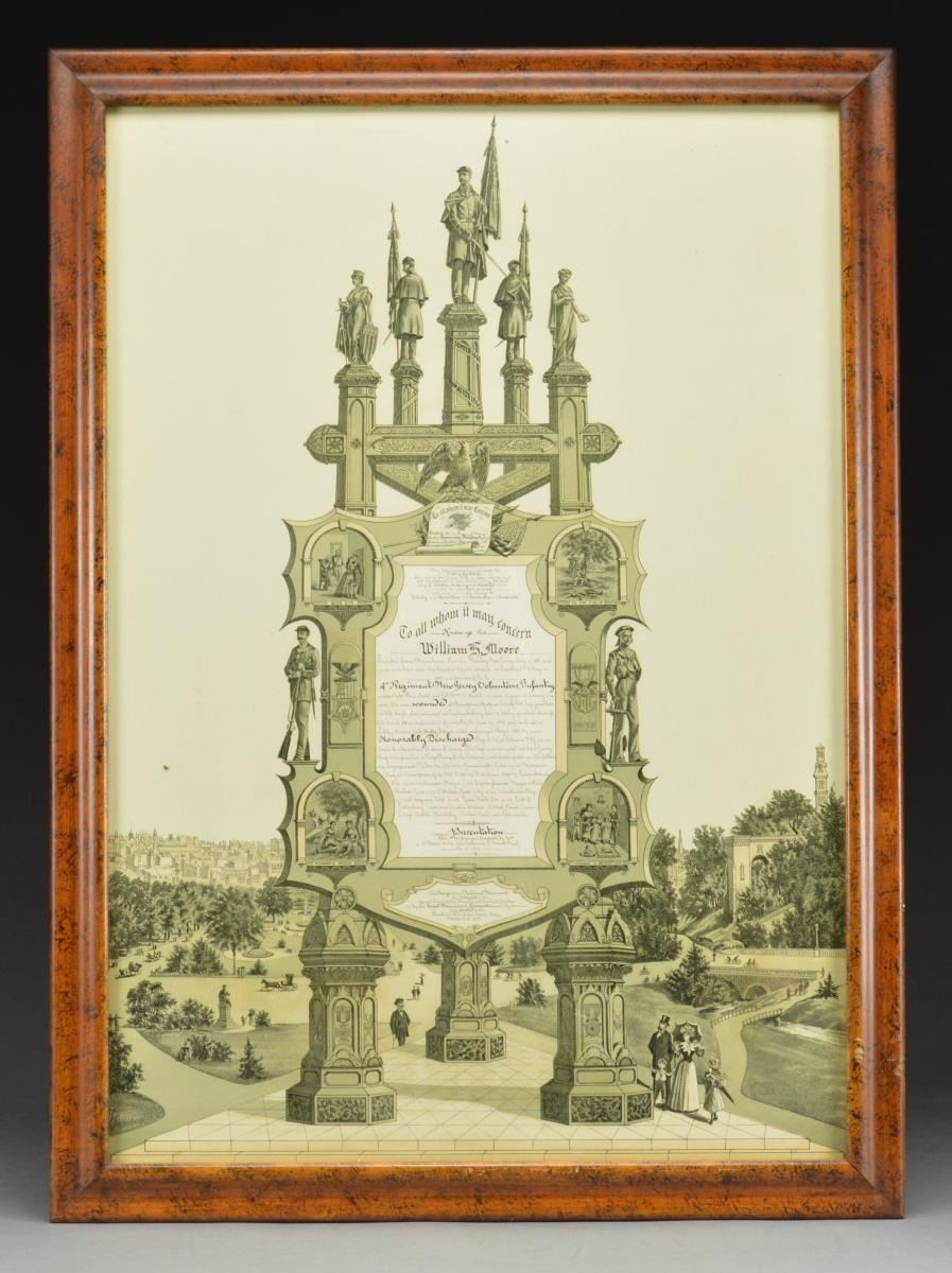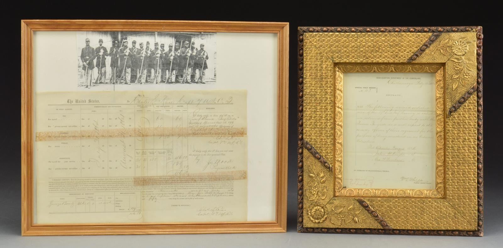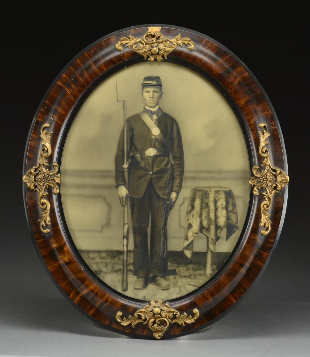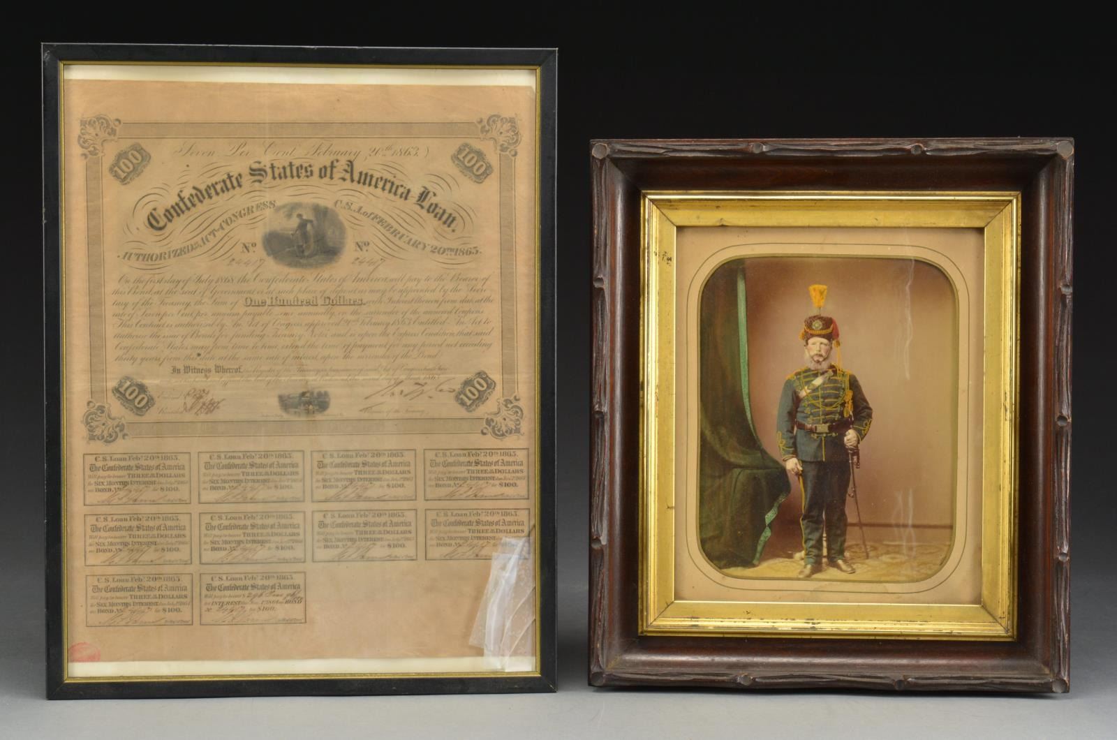 1) Approx. 8" x 10" hand -colored albumin photograph of militiaman posed w/ 1840 cavalry saber, fancy headgear w/ Maltese Cross insignia w/ “5” in center. His belt buckle has “RHG” painted on it. CONDITION: appears very good to fine w/ staining to mat, not removed from frame. 2) State of Virginia (West Virginia) military commission signed by Gov. Pierpoint for Capt. Hoffman Atkinson, 1st Regiment of Virginia mounted volunteers, signed May 28, 1862. CONDITION: good to very good overall, printed vellum has 2 folds, good applied embossed seal, all discernible, light soiling. 3) $100 Confederate bond on pink paper showing soldier standing by tree (Criswell 120). CONDITION: very good & complete, though clipped coupons. Frame has broken glass. 4) Confederate Louisiana $1000 bond & 6 Confederate notes (Criswell #s, 41, 42, 44, 66, 67, and 69). The bond is signed by Gov. Thomas Moore in 1862. CONDITION: not examined data from, all appear very good. Frame has broken glass. 5) 32" x 23" Frame, escutcheon, printed & calligraphy, for William Moore, 4th New Jersey volunteer infantry. CONDITION: appears very good overall, not removed from frame. 6) 19" x 23" Frame, Currier & Ives “Soldier’s Memorial” of Company K, 126th Regiment New York volunteers, printed 1862. CONDITION: appears good overall w/ yellowing & staining, not removed from frame. 7) 20" x 24" Frame, printed “Soldier’s Memorial” of battery H, 1st Vermont Artillery, 1864 Major & Knapp lithographers, NY. CONDITION: appears overall good to very good w/ staining, yellowing & sm. cracks in upper left quadrant on edges. Not removed from frame 8) Large 25" x 21" oval frame w/ gesso decoration. Full standing enlisted infantryman w/ pink & watercolor enhancements to image. CONDITION: very good overall, not removed from frame. 9) 15" x 17" Gilded gesso frame w/ about 8" x 10" February 12, 1864 dated document from Chattanooga Tennessee mustering 3 soldiers of the 57th Indiana infantry into veteran volunteer corps. CONDITION: appears very good though not removed from frame. 10) 17" x 8" Document concerning “Leave of Absence” of Capt. Charles S Rice, 7th USCT, dated August 13, 1864. CONDITION: stains horizontally on 2 folds as can be seen in photo, otherwise appears very good. (02-14464/JS). $600-800.