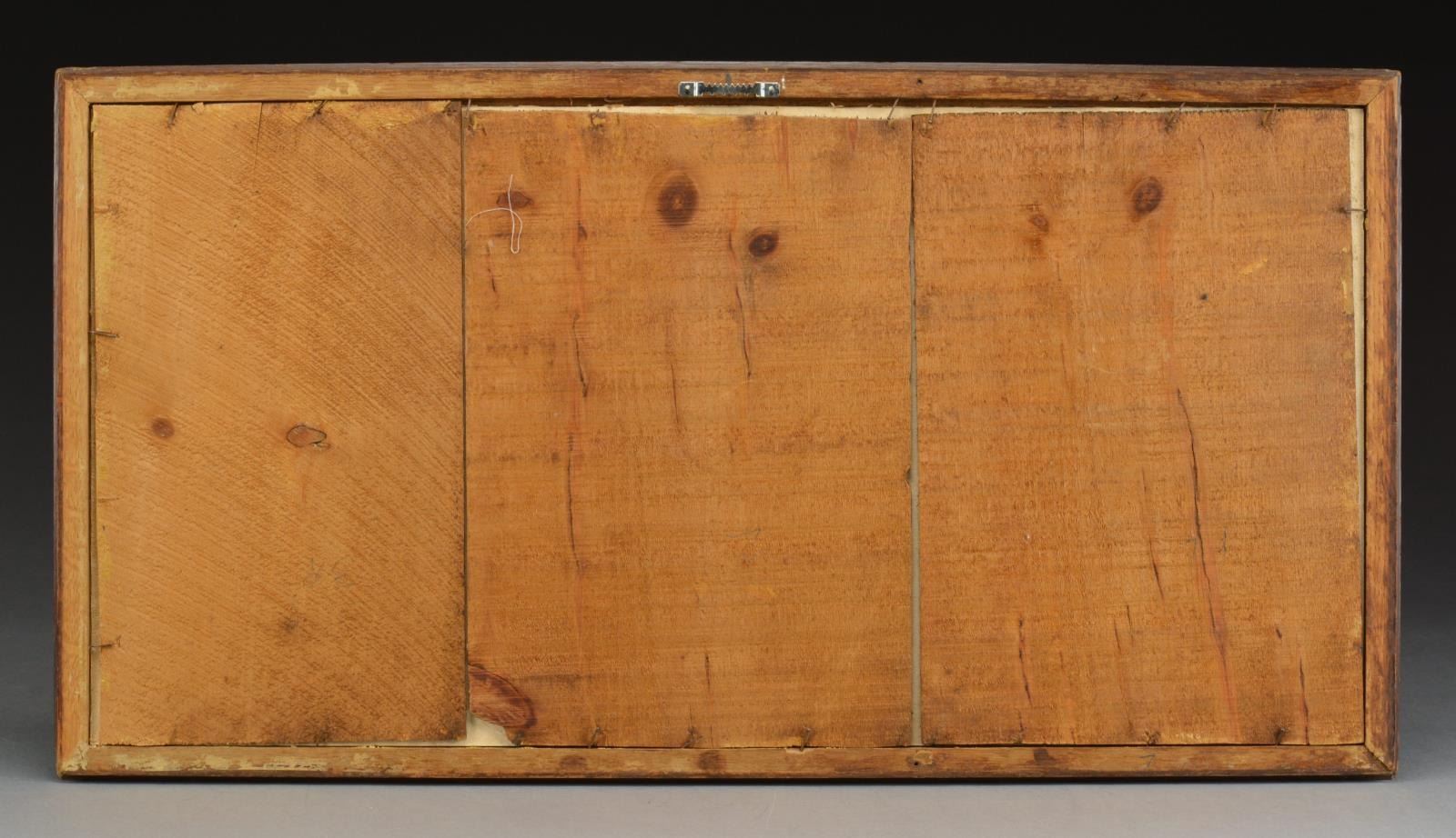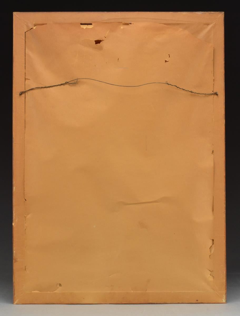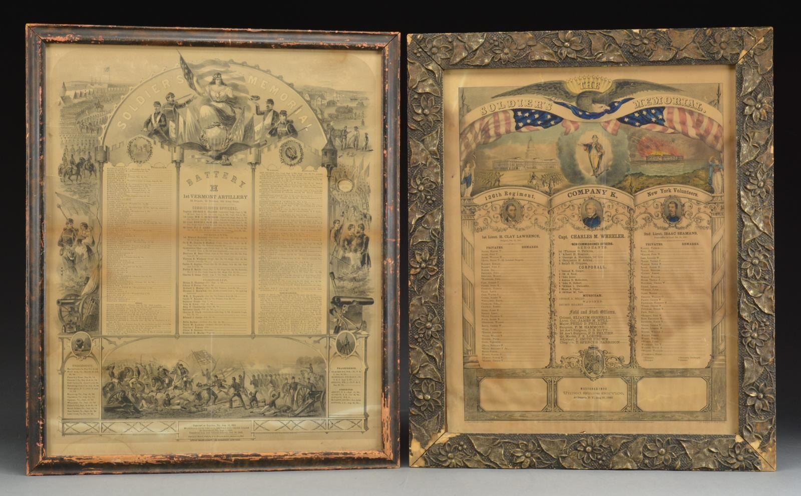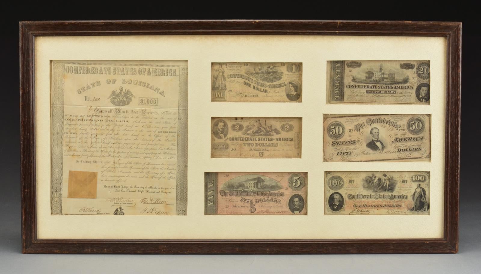1) Approx. 8" x 10" hand -colored albumin photograph of militiaman posed w/ 1840 cavalry saber, fancy headgear w/ Maltese Cross insignia w/ “5” in center. His belt buckle has “RHG” painted on it. CONDITION: appears very good to fine w/ staining to mat, not removed from frame. 2) State of Virginia (West Virginia) military commission signed by Gov. Pierpoint for Capt. Hoffman Atkinson, 1st Regiment of Virginia mounted volunteers, signed May 28, 1862. CONDITION: good to very good overall, printed vellum has 2 folds, good applied embossed seal, all discernible, light soiling. 3) $100 Confederate bond on pink paper showing soldier standing by tree (Criswell 120). CONDITION: very good & complete, though clipped coupons. Frame has broken glass. 4) Confederate Louisiana $1000 bond & 6 Confederate notes (Criswell #s, 41, 42, 44, 66, 67, and 69). The bond is signed by Gov. Thomas Moore in 1862. CONDITION: not examined data from, all appear very good. Frame has broken glass. 5) 32" x 23" Frame, escutcheon, printed & calligraphy, for William Moore, 4th New Jersey volunteer infantry. CONDITION: appears very good overall, not removed from frame. 6) 19" x 23" Frame, Currier & Ives “Soldier’s Memorial” of Company K, 126th Regiment New York volunteers, printed 1862. CONDITION: appears good overall w/ yellowing & staining, not removed from frame. 7) 20" x 24" Frame, printed “Soldier’s Memorial” of battery H, 1st Vermont Artillery, 1864 Major & Knapp lithographers, NY. CONDITION: appears overall good to very good w/ staining, yellowing & sm. cracks in upper left quadrant on edges. Not removed from frame 8) Large 25" x 21" oval frame w/ gesso decoration. Full standing enlisted infantryman w/ pink & watercolor enhancements to image. CONDITION: very good overall, not removed from frame. 9) 15" x 17" Gilded gesso frame w/ about 8" x 10" February 12, 1864 dated document from Chattanooga Tennessee mustering 3 soldiers of the 57th Indiana infantry into veteran volunteer corps. CONDITION: appears very good though not removed from frame. 10) 17" x 8" Document concerning “Leave of Absence” of Capt. Charles S Rice, 7th USCT, dated August 13, 1864. CONDITION: stains horizontally on 2 folds as can be seen in photo, otherwise appears very good. (02-14464/JS). $600-800.
