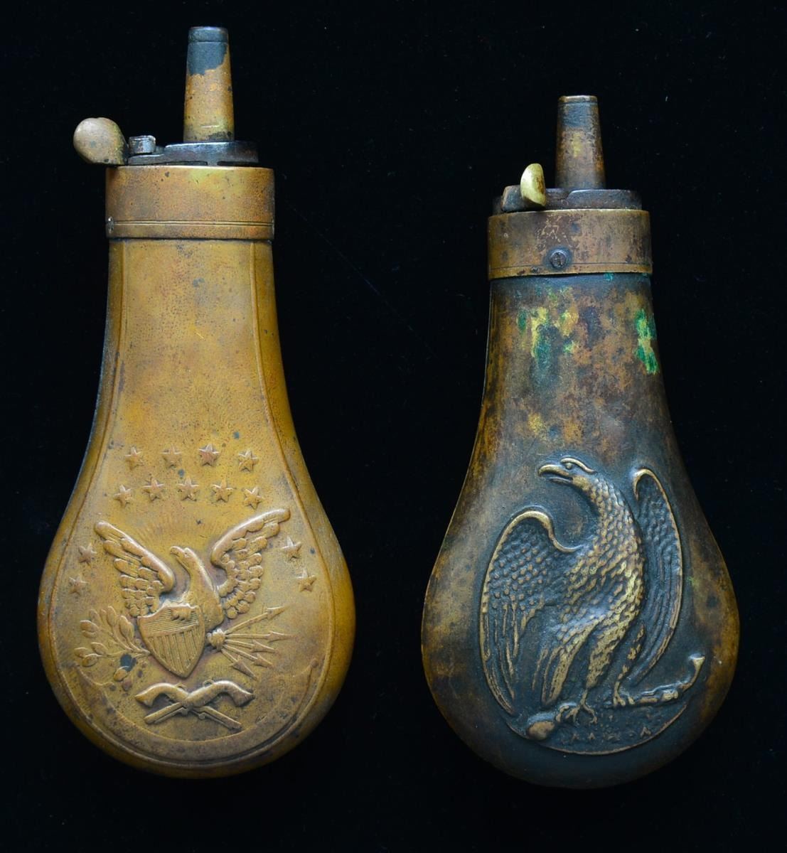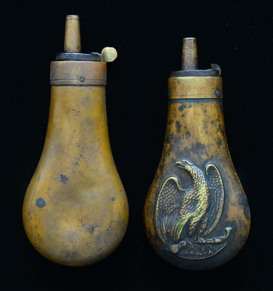 One example of each of the 2 most popular Civil War era pistol flasks. One w/ eagle w/ raised wings over pair of crossed pistols w/ 13 stars & the other a drooped wing eagle embossed on both sides w/ pistol in claws. CONDITION: good to very good overall. Flasks measure about 4-4 1/2" each including spouts. Slight denting, uncleaned w/ patina. (02-14126/JS). $300-400.