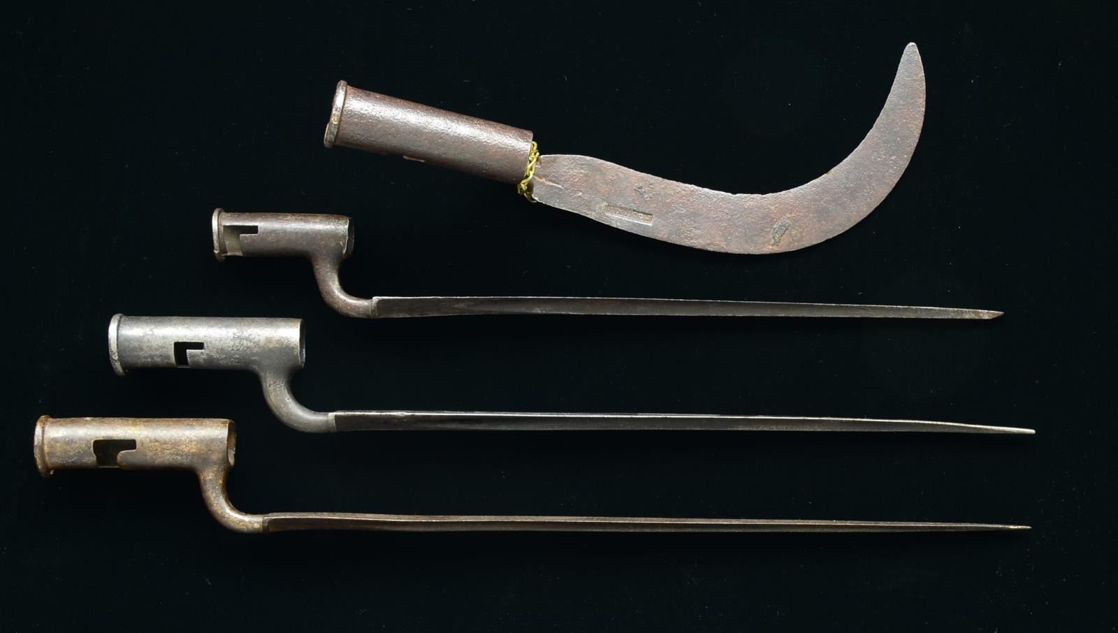 1) 21" Overall. 16 1/2" blade, 1 1/8" wide, indiscernible engraved letter & number on socket. 2) 16 3/4" Overall. 13 1/2" blade, 1 1/8" wide, blade marked “S&G Harvey”, “2” & “W.B”. 3) 19 1/2" Overall. 15" blade, 1 1/8" wide, blade marked “S. DAWES”, socket engraved “18”. 4) Bayonet converted to scythe-like tool w/ lg. indiscernible cartouche forward of ricasso. CONDITION: good overall, iron patina & pitting especially on #4 which is converted to a tool. #1 Has a hole drilled on top socket. #2 Has braised seam on top of socket. PROVENANCE: From the Collection of John "Tim" Breth Jr. (02-13818/JS). $600-800.