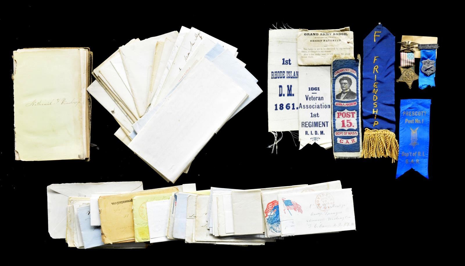 BADGE, GAR MEDAL, RIBBONS, LETTERS & MORE. A fine archive of material from a Nathaniel F. Winslow, Jr., a member of the First Rhode Island Detached Militia including his rare Bull Run badge. The badge consists of a top bar that reads, “BULL RUN JULY 21, 1861”, a blue ribbon & shield shaped badge w/ the Rhode Island seal, crossed rifle & cannon & the “F.R.I.D.M.”. / GAR membership badge w/ issue envelope that reads, “GRAND ARMY BADGE, OF CAPTURED CANNON METAL DESIGN PATENTED”. / 2 First Rhode Island D.M. veterans ribbons. / Prescott Dept. of R.I. GAR. ribbon. / Dept. of Mass Post 15. John A. Andrew pictorial ribbon. / Book titled, “The Campaign of the First Rhode Island Regiment in the Spring and Summer of 1861”, published in Providence in 1862. The first page of the book is inscribed “Nathaniel F. Winslow Jr.”. / Approx. 20-25 letters written during the war most of which were sent in patriotic envelopes. Letters have newsy content mentioning several Civil War notables & places. / Lg. group of post Civil War letters & documents relating to military service & civilian life. This is a fine group that has been preserved together for many years & deserves more research. CONDITION: Bull Run medal shows light wear but the ribbon is a bit tattered. GAR medal has some fading to the ribbon. Ribbons show light wear. Book is missing its cover & binding. Letters are in a good hand & easily read. (02-14765/BF). $800-1,200.