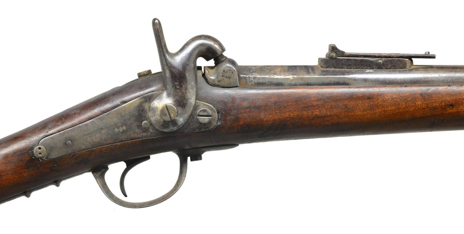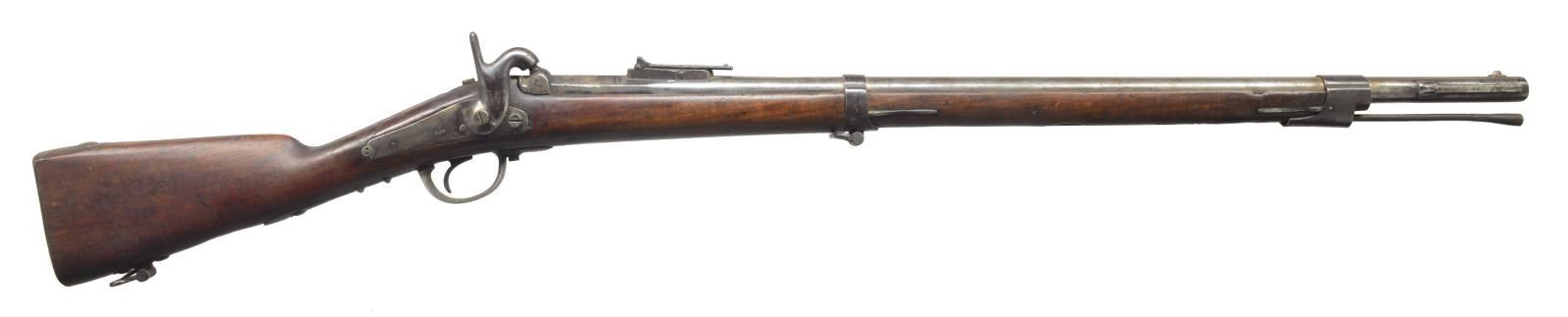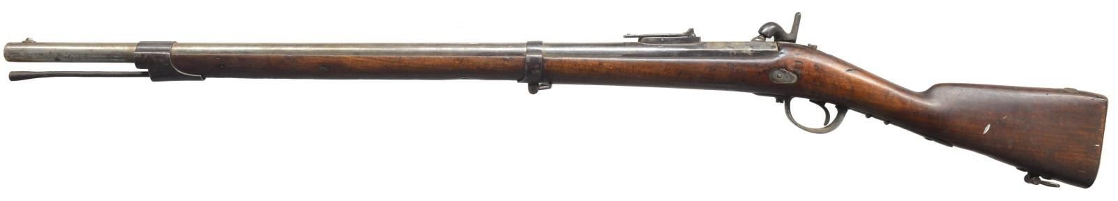 Cal. 75. NSN. Bbl. 34 1/4" rnd. w/ oct. shank. Blade front sight w/ graduated leaf rear sight. Island mounted lock marked "E. MONSEUR / LIEGE". Lock has added hand stamped "CSA" marking. 2 Band walnut stock w/ iron furniture & trumpet tipped iron ramrod. CONDITION: metal shows evidence of cleaning w/ areas of pitting having dents & wrench marks at breech end. Refinished wood has worn appearance w/ numerous dents & handling marks. Dark pitted bore. (01-18455/DS). ANTIQUE. $400-600.