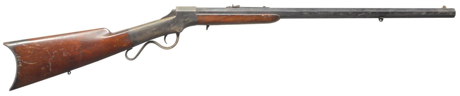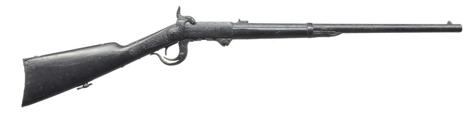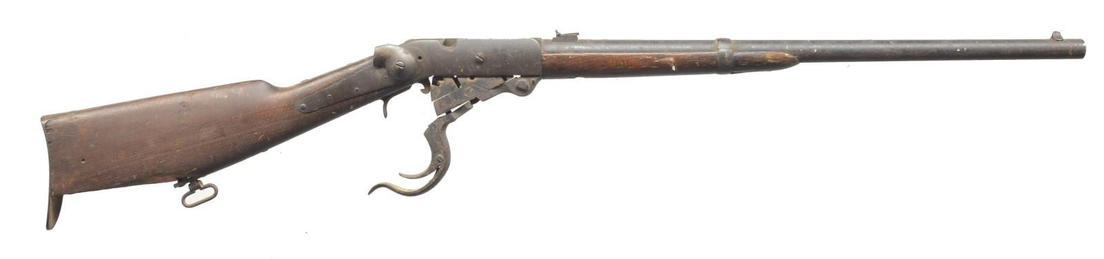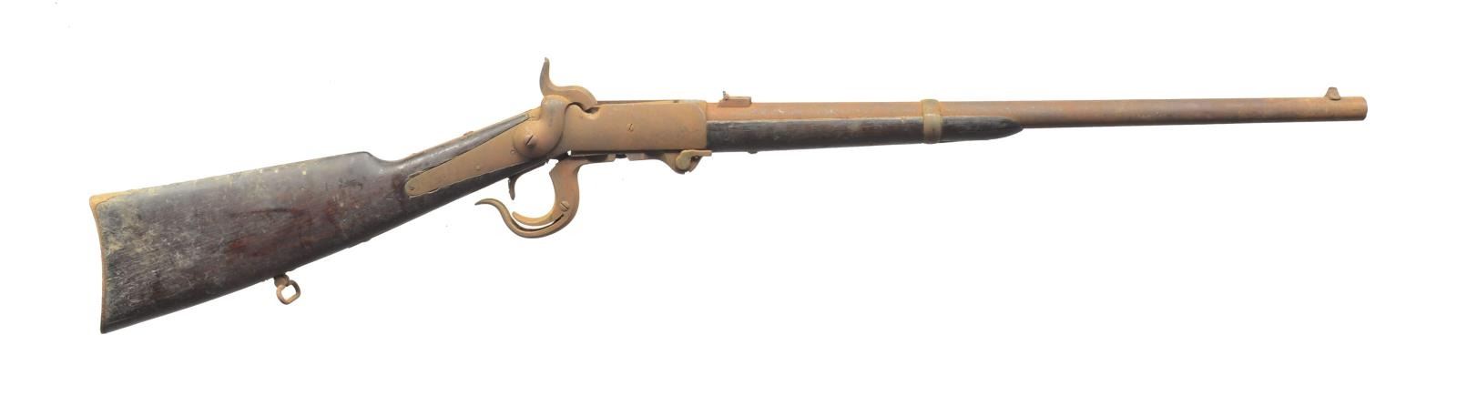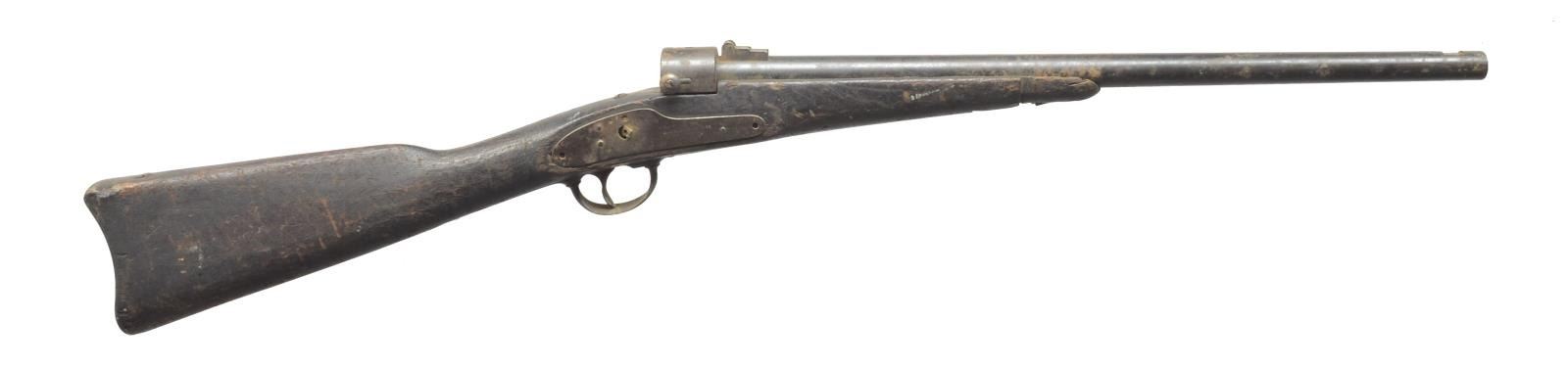 1) BALL & WILLIAMS BALLARD SPORTING RIFLE. Cal. 38 RF. S# 153. Bbl. 24" oct. w/ blade front sight & elevator adj. sporting rear sight. Lever operated single shot action w/ manually operated extractor. Walnut forearm & straight grip stock w/ crescent steel buttplate. Ball & Williams was the first mfg. of Ballards 1862-1865. CONDITION: metal has faded finish showing general light pitting w/ spots of red rust & heavy dents on action. Hammer spur is broken off leaving action non functioning. Wood has worn original finish showing numerous dents & marks. Dark pitted bore. 2) JOSLYN 2ND MODEL BREECHLOADING PERCUSSION CARBINE. Cal. 52 RF. S# 6022. Bbl. 22" w/ 2 leaf rear sight, front sight is removed. Single shot action w/ hood that rotates left for loading. Right side mounted island lock w/ saddle ring & bar on left side. Walnut stock w/ iron fittings. CONDITION: metal finish has faded to dark patina showing surface corrosion & pitting. Stock has dark worn appearance w/ numerous scratches & dents. Forearm band is missing. Lock tumbler is broken, hammer is missing. Dark rusted bore. / 3 BURNSIDE FIFTH MODEL BREECHLOADING CIVIL WAR CARBINES: Cal. 54. Bbl. 21" rnd. w/ blade front sight & single leaf rear sights. Fifth model carbines identified by guide screw at center of right side of receiver. Lever operated single shot actions. Band fastened forearm & straight grip walnut stocks w/ sling swivels & steel carbine buttplates. 3) S# 6935. Left side of action has saddle ring bar. Left side of stock has 2 clear "GC" cartouches. CONDITION: metal shows general red rust. Some action screws are replacements. Stock has dark appearance w/ mildew. Heavily rusted bore. 4) S# 16203. Left side of stock has "RHW" cartouche. CONDITION: metal has dark rusty appearance w/ general pitting & corrosion. Hammer is broken at neck. Action is not opening & closing properly. Forearm has worn appearance w/ numerous dents & marks. Stock is broken through wrist w/ lg. piece of wood missing between buttplate toe & swivel. Dark rusty bore. 5) S# unidentifiable. CONDITION: gun has dark charred appearance from fire damage. Action is frozen. Saddle ring bar has been removed from left side. (01-18387 (5) /DS). ALL ANTIQUE. $400-800.