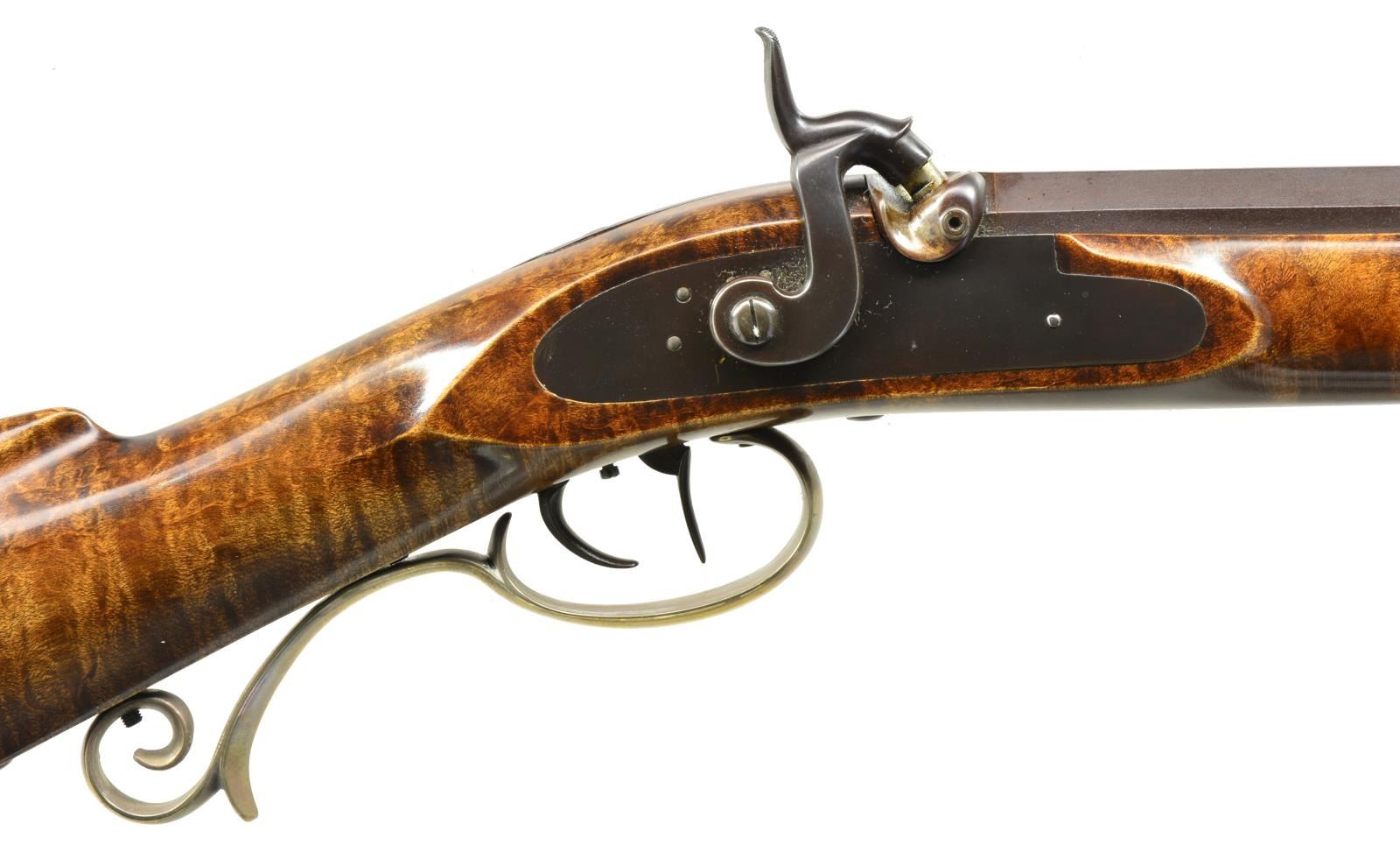 PLAINS RIFLE. Cal. 50. NSN. Dixie Gun Works 34 7/8" oct. bbl. measuring 1" across flats at muzzle. Top flat of bbl. has custom builder's initials "JM", that is also found on back of buttplate. German silver blade Rocky Mountain style front sight w/ full buckhorn elevator adj. rear sight. Dbl. set triggers. Bbl., lock & hammer have a finely browned finish. Pin fastened curly maple half length stock w/ shadow line cheekpiece & pewter nosecap. German silver fittings include finger curl trigger guard, crescent buttplate & toeplate. Iron sideplate has German silver teardrop & heart shaped inlays. Forearm has 4 German silver teardrop inlays on each side. Brass tipped hardwood ramrod held on iron under rib by 2 faceted German silver inlays. Weight: 10 lbs., 5 oz. CONDITION: bbl. & lock retain over 95% brown finish. Stock has very good gloss finish showing a few sm. marks. Bright bore w/ strong rifling. (01-18096/DS). ANTIQUE. $1,200-1,600.