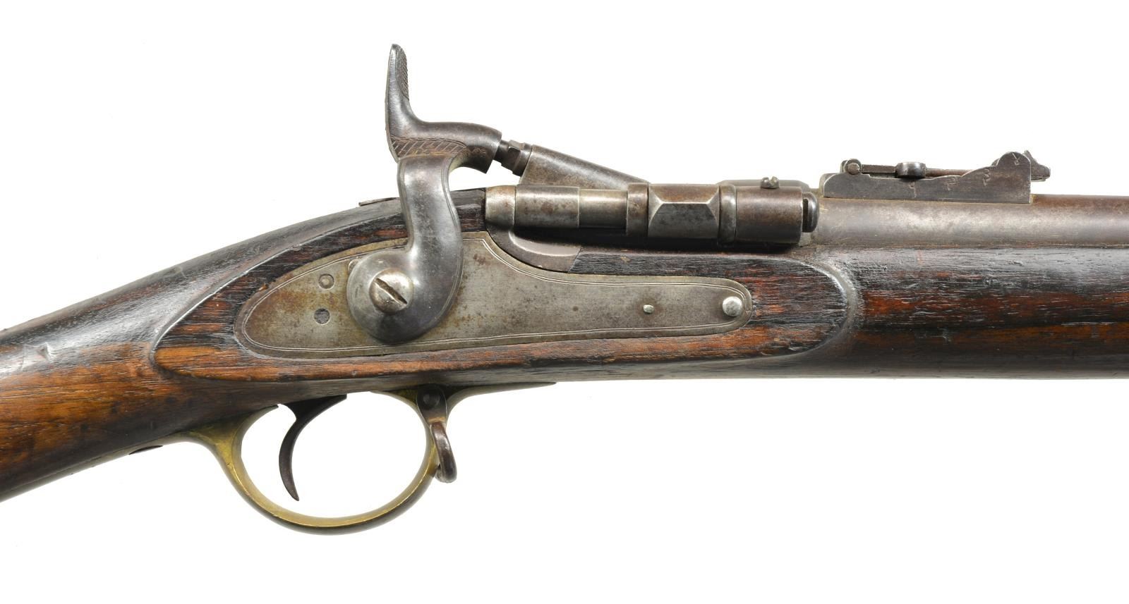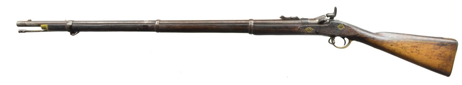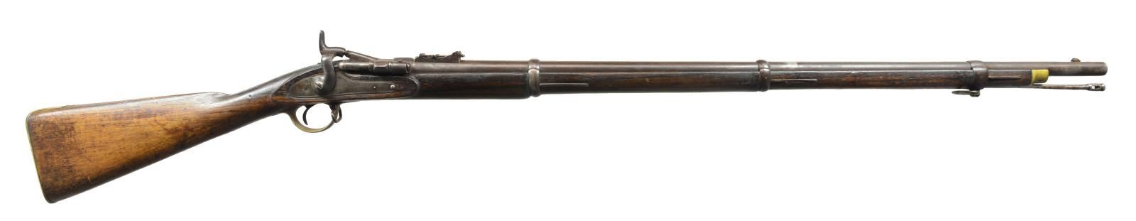 Cal. 577 Snider. S# 15. Bbl. 36 1/2". Likely made in Afghanistan. Parts are marked w/ pointed arrow, similar to British broad arrow. Action is MK2 w/ thumb latch. Ladder type rear sight w/ graduations in unknown script. Stud type front sight. Ramrod is present. Brass nose cap. Brass trigger guard & buttplate. Lockplate is unmarked. Swivels are at upper band & trigger guard bow. Hardwood stock has dark walnut appearance. CONDITION: stock has been cleaned w/ notably thin finish on both sides of buttstock w/ moderate wear, dents & scratches. Metal turning overall gray & patina w/ wear, oxidation & areas of fine pitting. Brass has pleasing, aged patina. Bbl. has bright area, approx. 1" ahead of middle band likely from bbl. band not being fully seated in storage. Bore is turning dark w/ areas of fine pitting, but has strong, sharp lands. (01-18076/RW). ANTIQUE. $300-500.