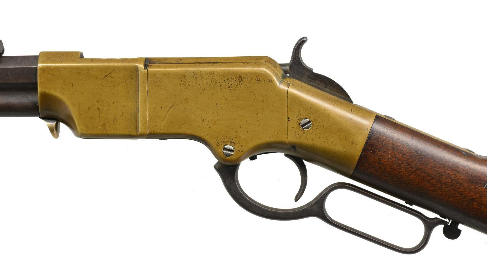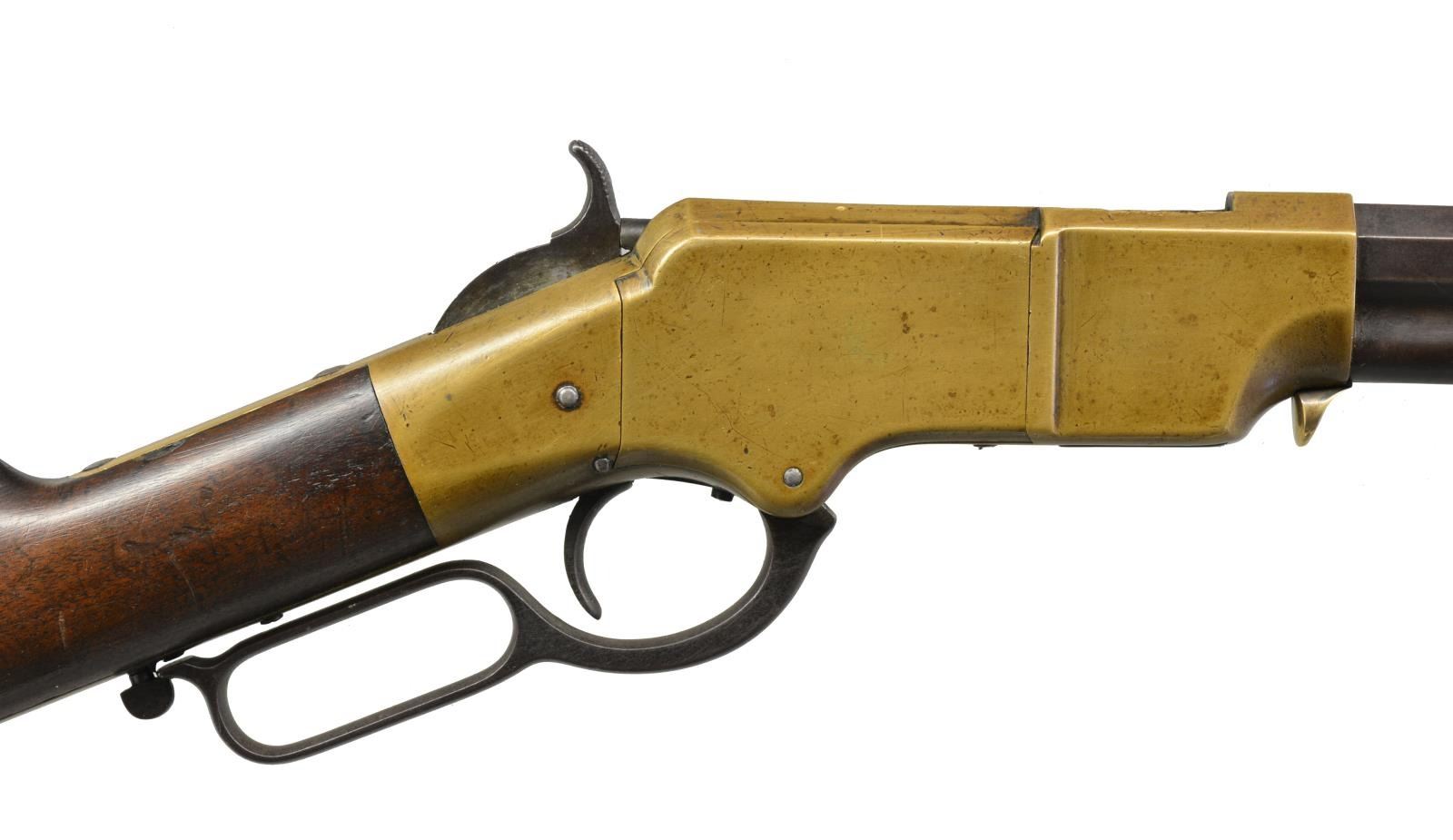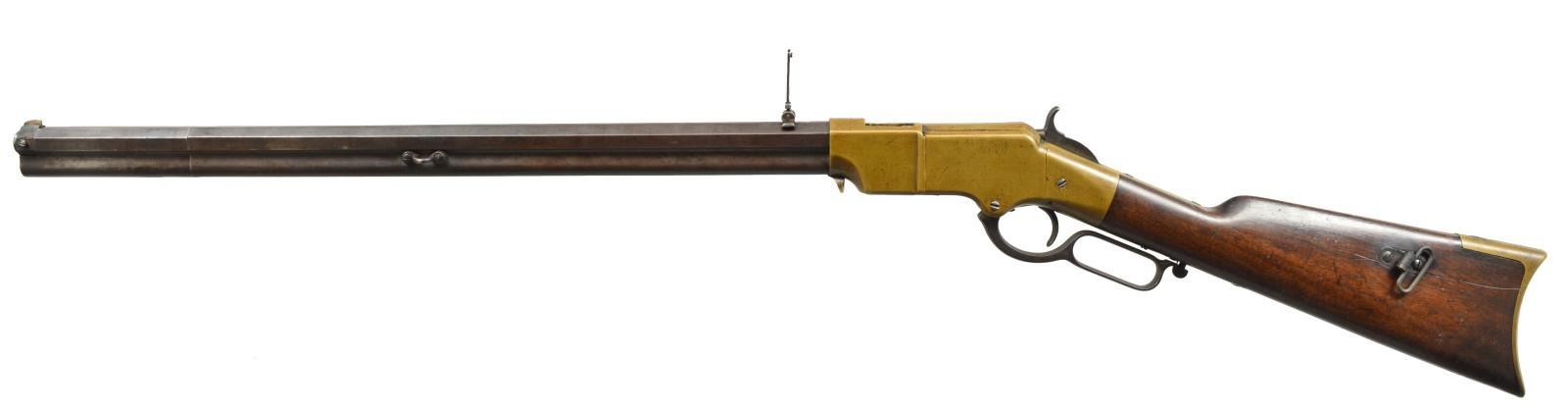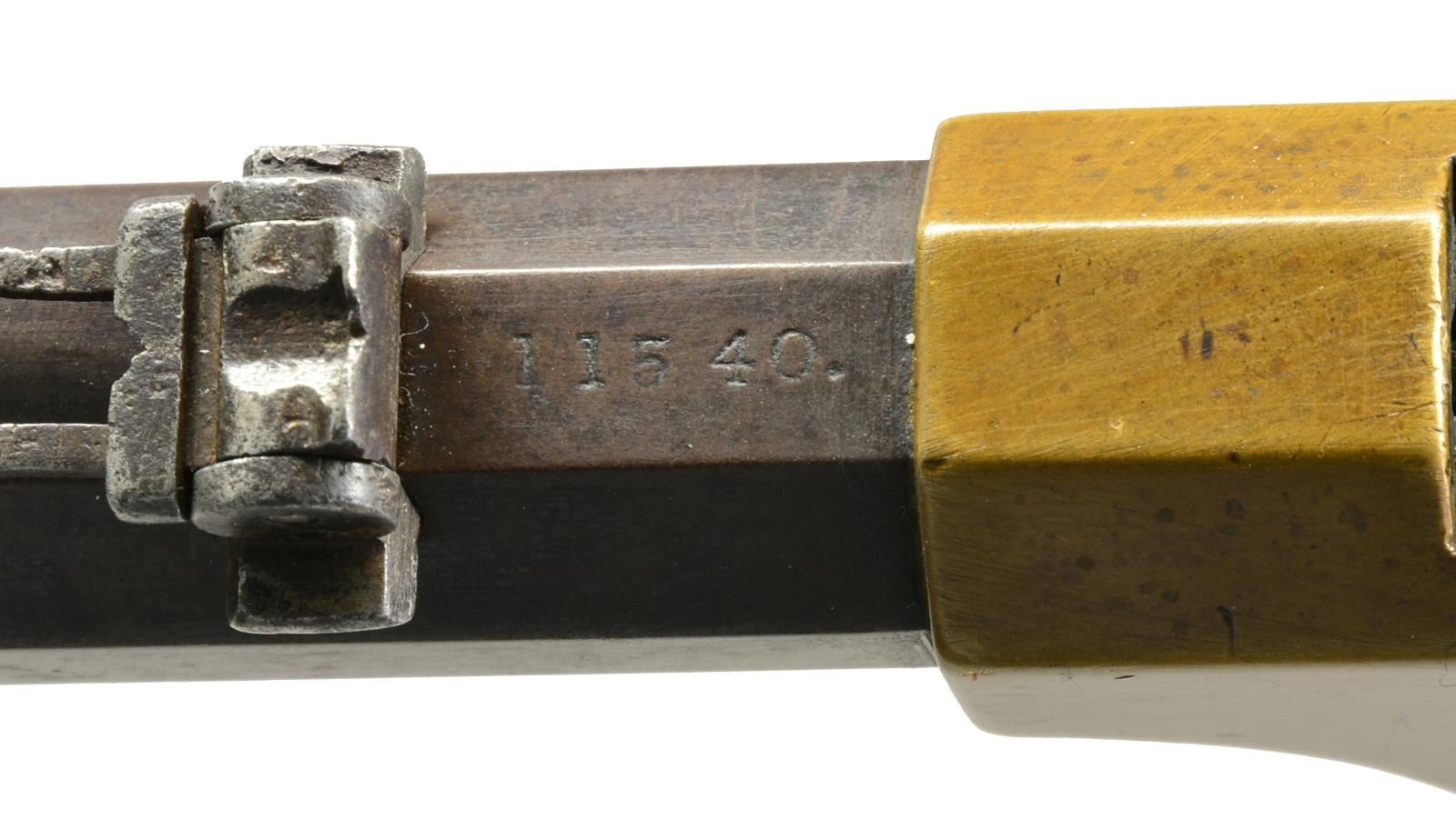 Cal. 44 HRF. S# 11540. Bbl. 24" octagon with integral 15 rd. mag. tube and 5" rotating shroud to facilitate loading. German silver blade front sight with folding leaf rear sight. Brass action. S# marked on top of barrel, top tang channel of stock and inside lower tang. Straight hand walnut stock with brass crescent buttplate having sling swivel on left side. Left side of barrel has loop for front swivel. CONDITION: barrel, mag. tube, hammer and trigger have a dark patina appearance with scattered spots of corrosion. Barrel shroud has series of light dents along both sides. Rear sight staff has slight bend. Receiver and sideplates have a dark mustard color patina showing numerous scratches and marks. Stock has worn finish showing scratches, marks and small dents. Action functions properly. Some screws show screwdriver distortion. Sideplates have proud fit along top edge of receiver. Bore retains worn intact rifling showing scattered pitting. (01-17979/DS). ANTIQUE. $17,500-22,500.